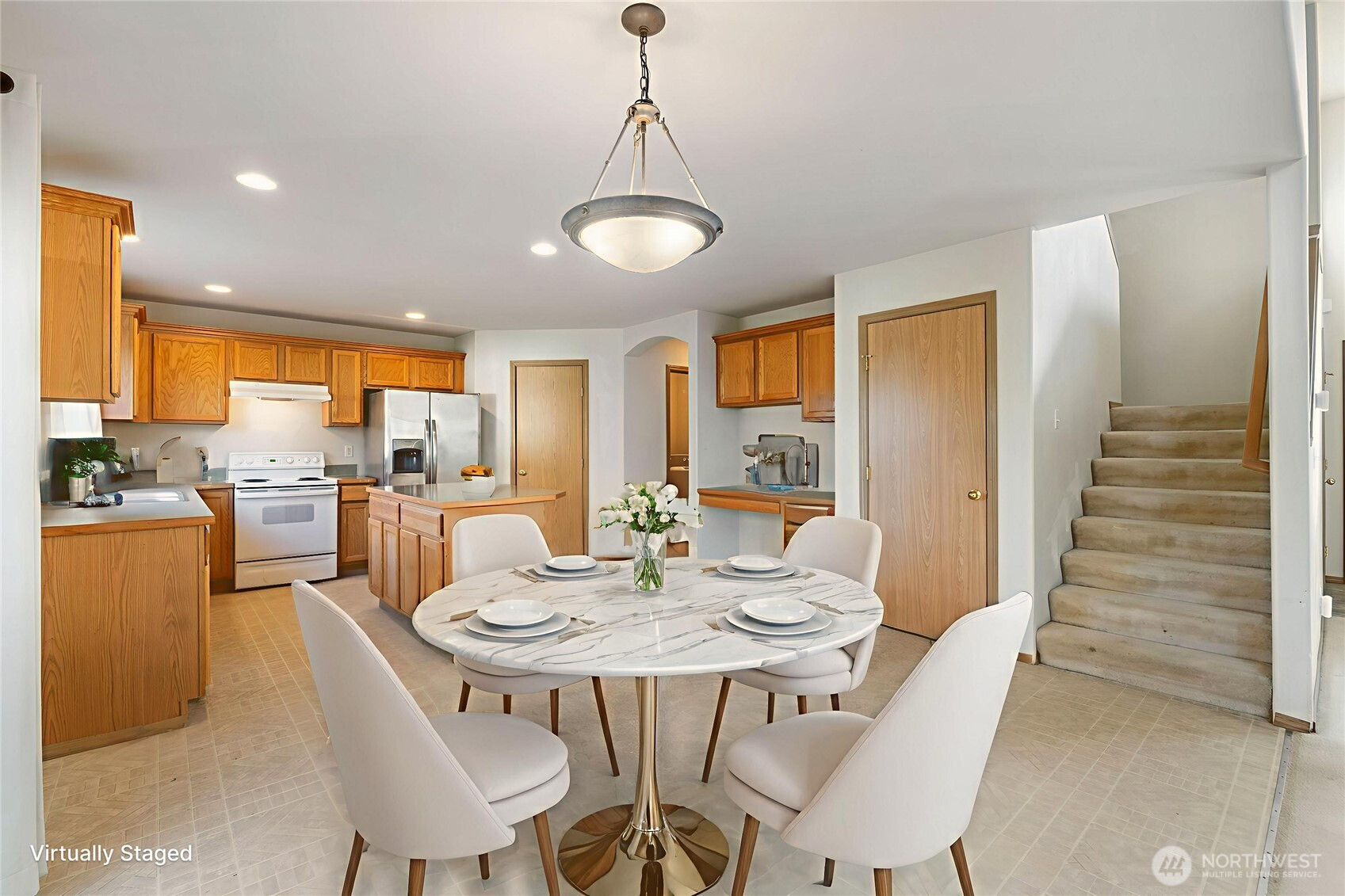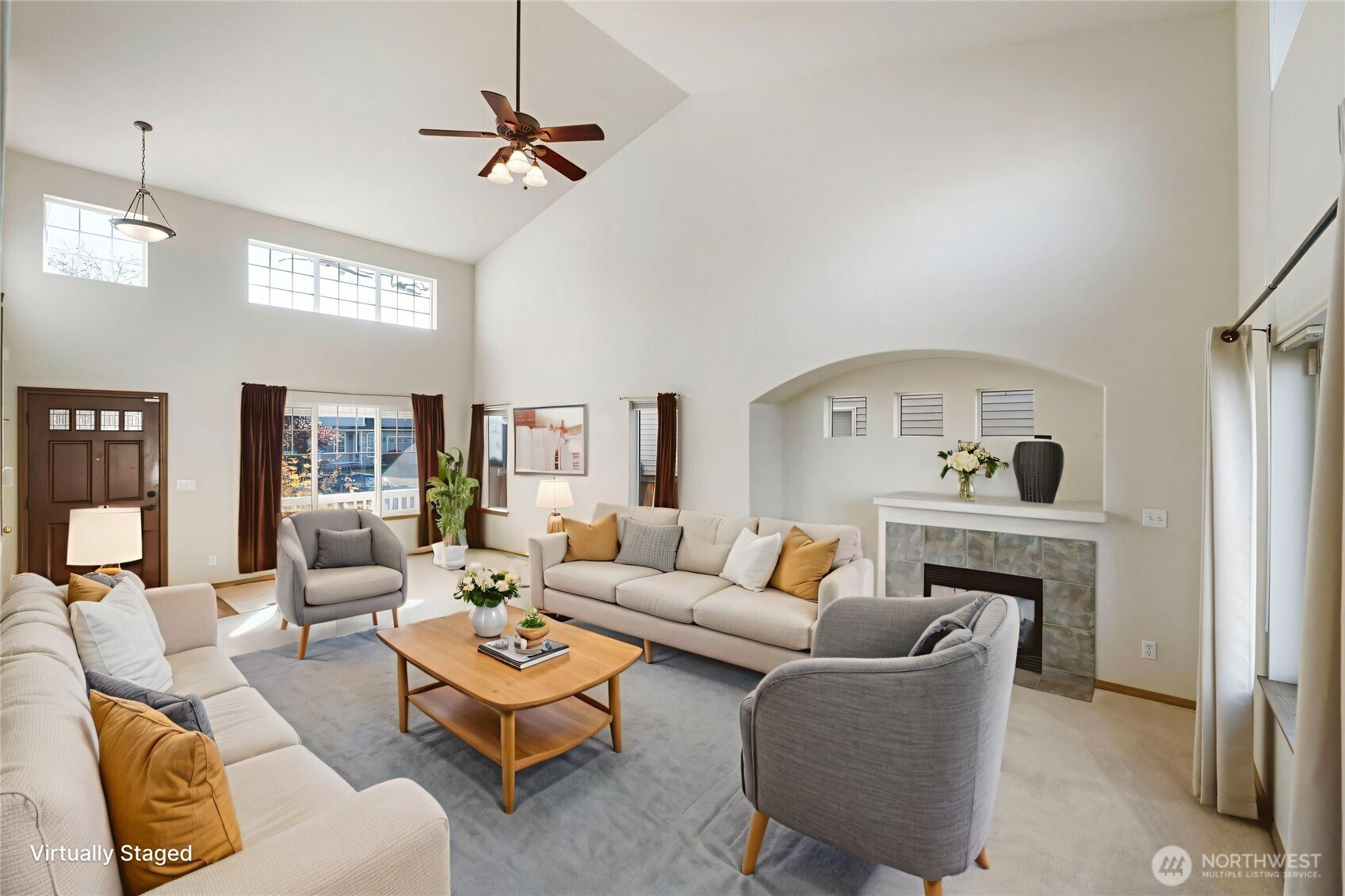 Welcome home to this inviting 3-bdrm, 2.5-bath home in Puyallup, offering comfort, space, & a touch of privacy. The open floor plan features vaulted ceilings to enhance the airy feel, while ceiling fans add year-round comfort. The kitchen includes all appliances, & the versatile loft area provides the perfect spot for an office, playroom, or reading nook. Enjoy peaceful views w/no homes behind you & take in the beautiful mountain view. Outdoor storage shed offers extra space. 1,990 sq. ft. of living space w/vinyl siding for easy maintenance & 2 car garage, this home is a fantastic opportunity in a desirable Puyallup location. Seller to provide $25,000 toward cosmetic improvements or closing costs. Bring your ideas & make this home yours!