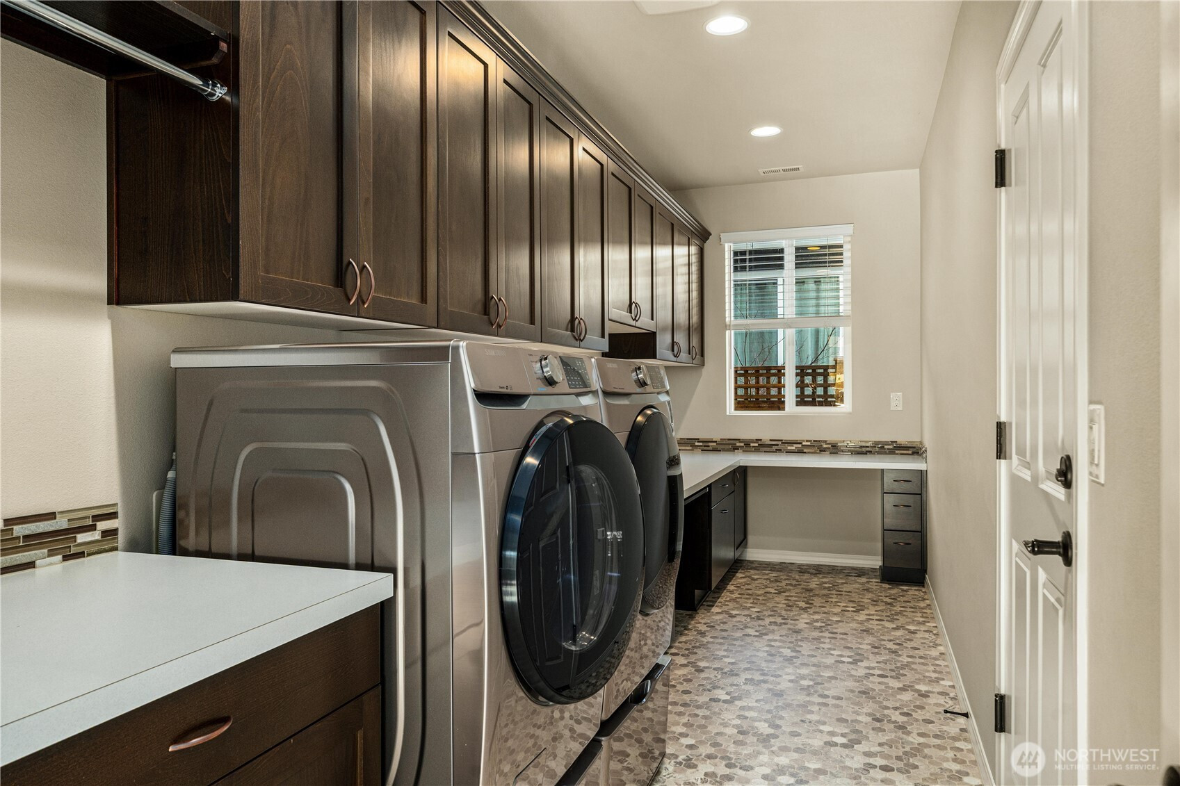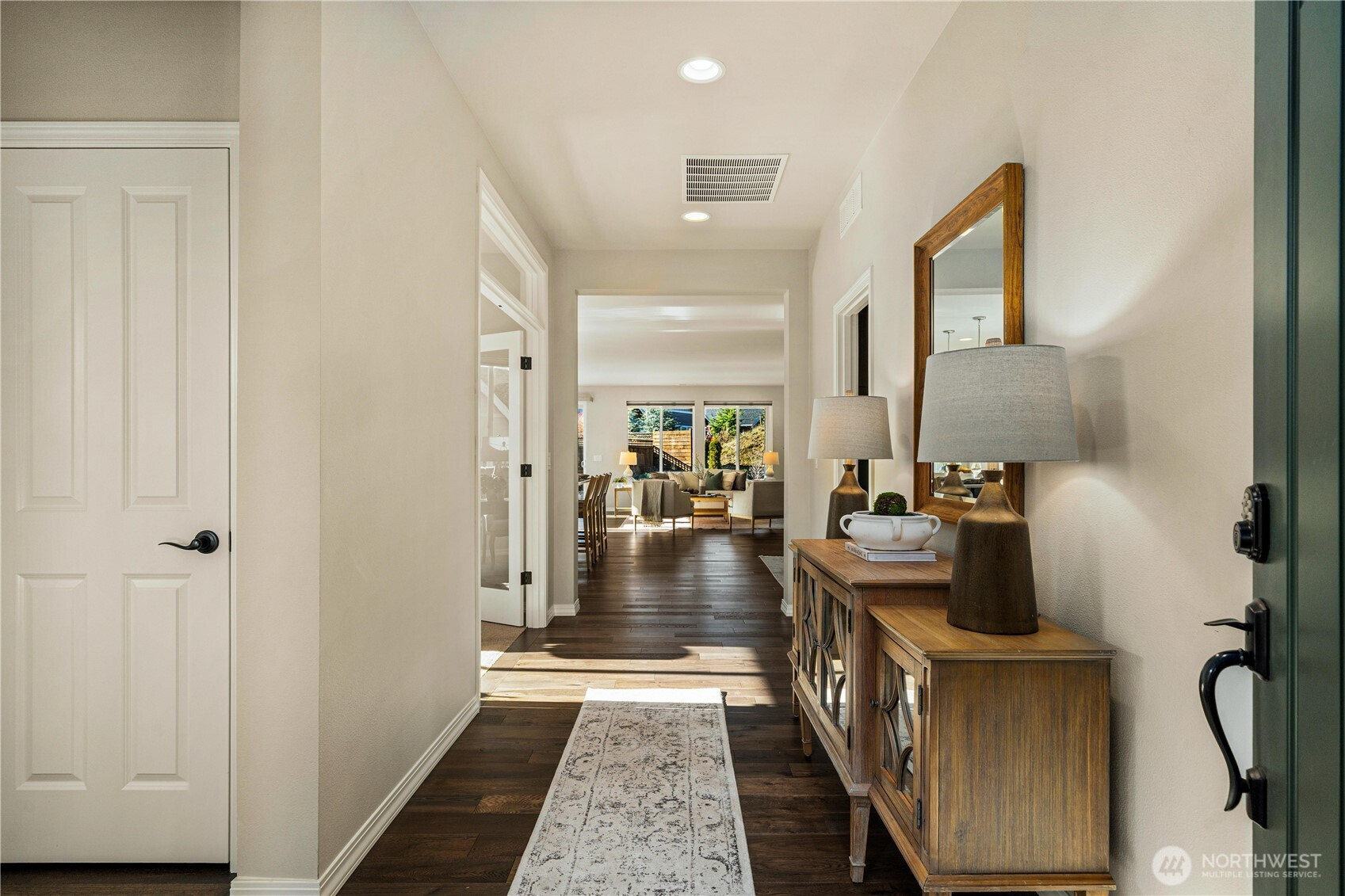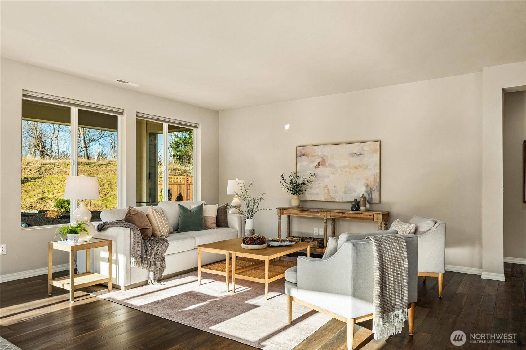 Stunning & timelessly upgraded 2019 "Refresh" featuring awe-inspiring partial views of Mt. Rainier from the dining room, kitchen, den & guest suite in Washington's premier 55+ resort community of Trilogy at Tehaleh. Quartz countertops, classic cabinetry & top tier appliances anchor the light filled kitchen. Both baths feature Quartz counters, incl. a stunning primary bath w/ statement custom barn door & a fully tiled shower w/ built-in bench. Extensive Engineered flooring, French doors open to a versatile den, & a coveted Smart Space laundry/mudroom-perfect for hobbies, crafting or organization. Step outside to an oversized, west-facing private lot backing to permanent greenspace-your own private & serene retreat where sunsets & nature take center stage. The raised patio w/ expanded hardscape, a motorized awning & mature plantings will make this one of your favorite spots to enjoy! High-end window coverings & finished garage. Ideally located near the private Lodge, residents enjoy resort-style amenities incl. an indoor pool, state-of-the-art fitness facilities, The Mantle restaurant & bar, Pickleball courts & over 40 miles of groomed scenic trails. Timeless upgrades, light-filled & perfectly positioned, this home offers elegant style & an abundant lifestyle!