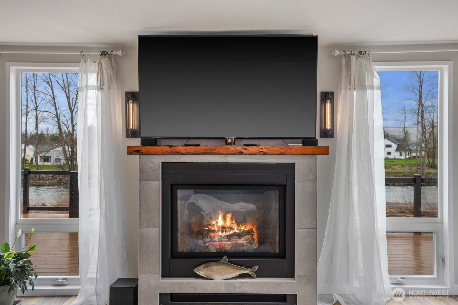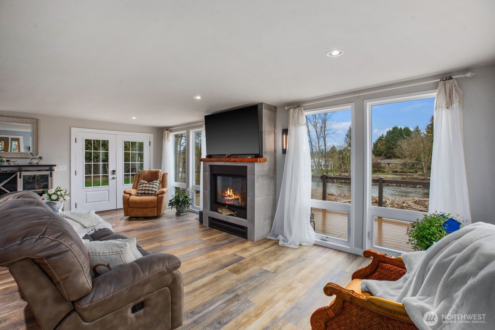 One of the last riverfront properties grandfathered in without restrictive waterfront setbacks. Perched on a high bank above the river, this home sits safely outside the flood zone while offering breathtaking views and direct access to nature. The river is full of salmon, creating a truly special Pacific Northwest setting, all while being just minutes from the charm, restaurants, and events of downtown Puyallup. This beautiful custom home features a bright primary suite with a spa-like ensuite bathroom designed for comfort and relaxation. Large windows throughout the home frame stunning river views from nearly every room, filling the interior with natural light. The spacious kitchen is designed for both everyday living and gourmet cooking, featuring abundant cabinetry, a large island for gathering and prep space, and a gas stove perfect for home chefs. The property also includes versatile outbuildings, ideal for a home office, art studio, or creative workspace. Practical upgrades include generator wiring, a gas fireplace, and a heat pump for year-round efficiency and comfort. Enjoy a riverfront sanctuary with panoramic 180-degree views from the expansive open living room. With the home perched along the high-bank edge, you’ll experience the rare feeling of being just steps from the water while maintaining privacy and elevation. Additional features include a gated private driveway with ample off-street parking and an oversized detached garage with workshop space.