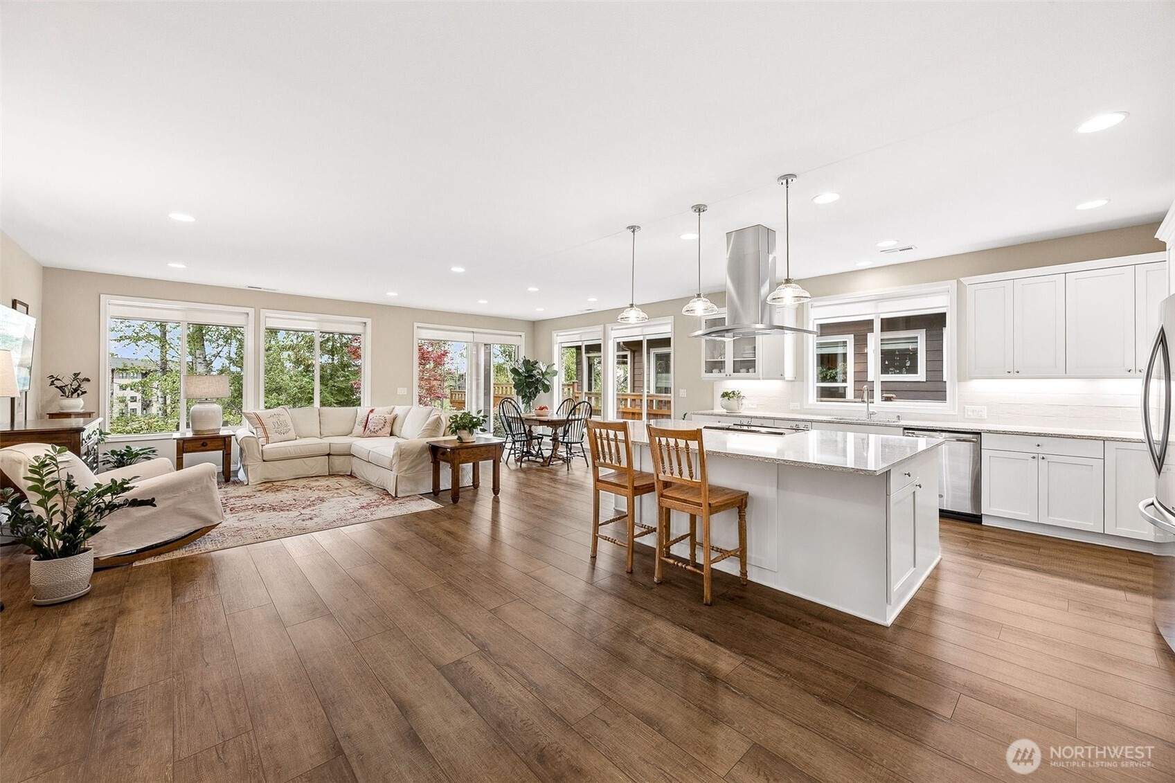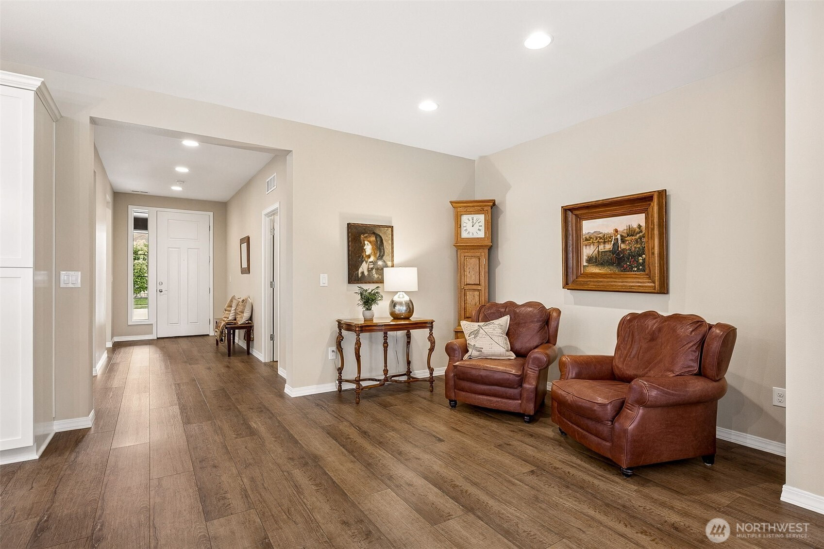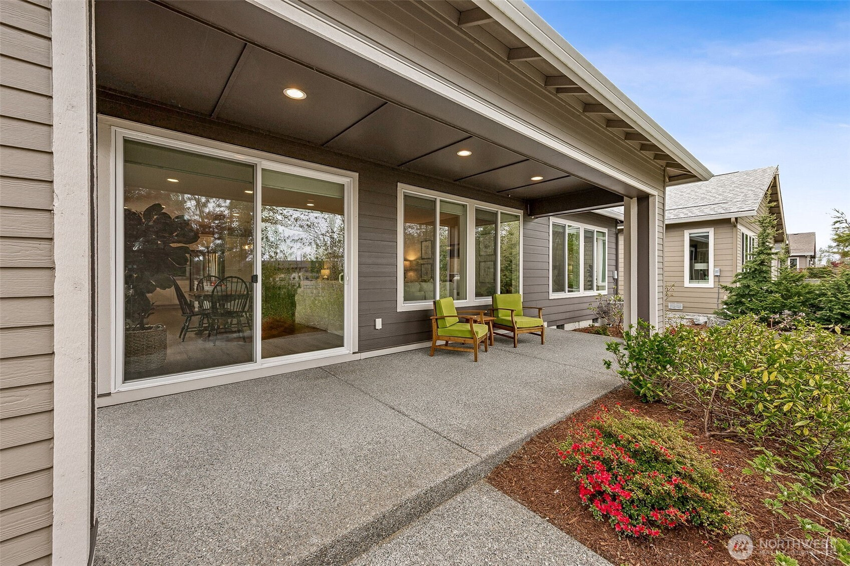 Experience elevated 55+ living in this stunning Shea Homes resale in the sought after Trilogy Community- Perfectly positioned to capture beautiful mountain views & a tranquil greenbelt just beyond the backyard! Residents enjoy resort-style amenities including clubhouse, pool, fitness center, dining, scenic trails, parks, & athletic courts. A welcoming 9-foot entry door opens to a thoughtfully designed open concept interior featuring luxury vinyl wide plank flooring, wood wrapped windows, stylish pendant fixtures, & roller shades throughout. The dedicated office/den provides the perfect space for work or relaxation. The gourmet kitchen is a true centerpiece, showcasing an upgraded large quartz island with storage, soft-close cabinetry, electric cooktop, under-cabinet lighting, & full-height tile backsplash—ideal for both everyday living & entertaining. Retreat to the spacious primary suite offering a beautifully upgraded ¾ bath with walk-in tile shower & bench, along with a walk-in closet featuring a custom storage system. A full guest bath with LVP flooring is perfect for visitors. The laundry room is enhanced with charming beadboard details, custom storage cabinets, & washer/dryer that stay. Additional highlights include gas tankless water heater, gas furnace, & A/C for year-round comfort. Enjoy the peaceful backyard with mature garden beds & walkways + a spacious covered patio that is the perfect extension of your living space. Low maintenance front yard W/sprinkler system!