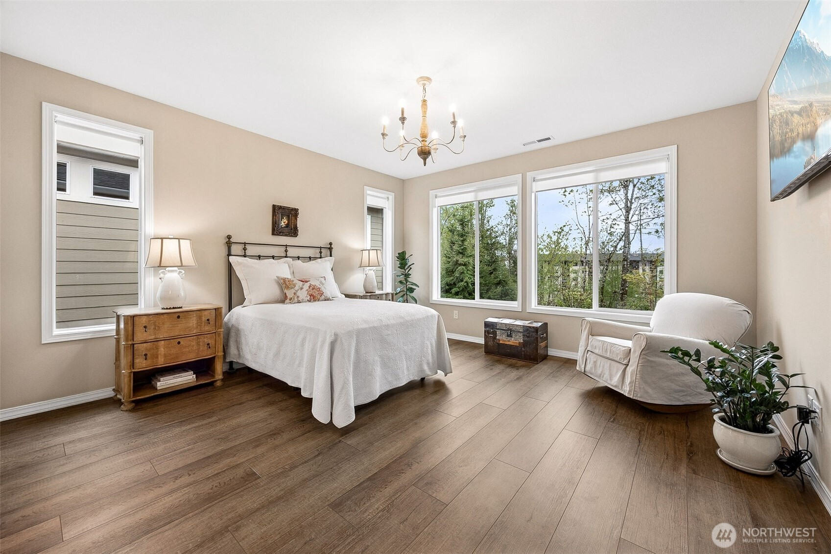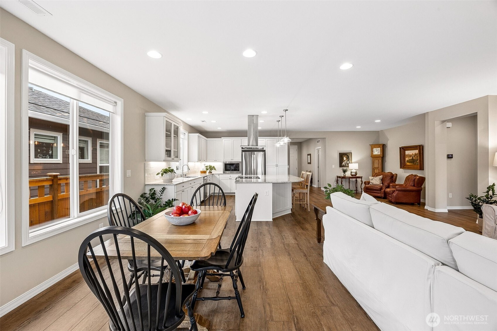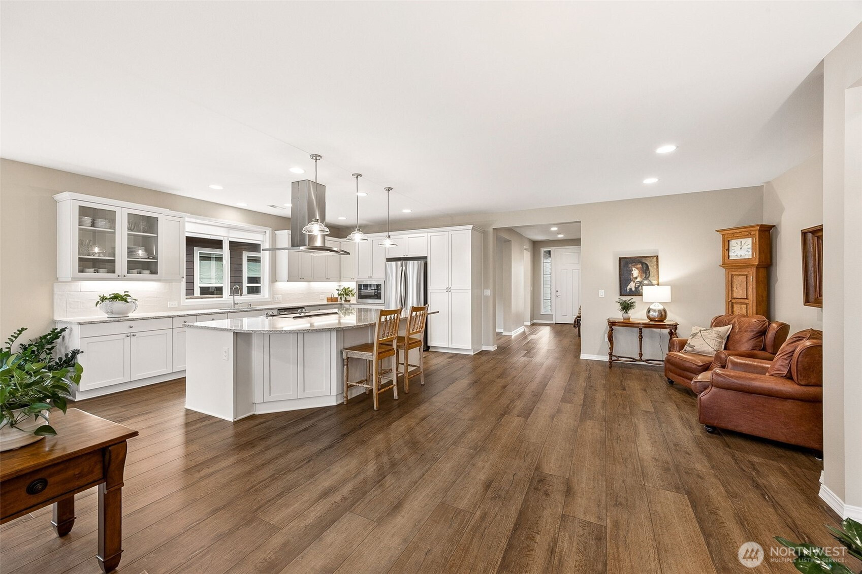 Experience elevated 55+ living in this stunning Shea Homes resale in the sought after Trilogy Community- Perfectly positioned to capture beautiful mountain views & a tranquil greenbelt just beyond the backyard! Residents enjoy resort-style amenities including clubhouse, pool, fitness center, dining, scenic trails, parks, & athletic courts. A welcoming 9-foot entry door opens to a thoughtfully designed open concept interior featuring luxury vinyl wide plank flooring, wood wrapped windows, stylish pendant fixtures, & roller shades throughout. The dedicated office/den provides the perfect space for work or relaxation. The gourmet kitchen is a true centerpiece, showcasing an upgraded large quartz island with storage, soft-close cabinetry, electric cooktop, under-cabinet lighting, & full-height tile backsplash—ideal for both everyday living & entertaining. Retreat to the spacious primary suite offering a beautifully upgraded ¾ bath with walk-in tile shower & bench, along with a walk-in closet featuring a custom storage system. A full guest bath with LVP flooring is perfect for visitors. The laundry room is enhanced with charming beadboard details, custom storage cabinets, & washer/dryer that stay. Additional highlights include gas tankless water heater, gas furnace, & A/C for year-round comfort. Enjoy the peaceful backyard with mature garden beds & walkways + a spacious covered patio that is the perfect extension of your living space. Low maintenance front yard W/sprinkler system!