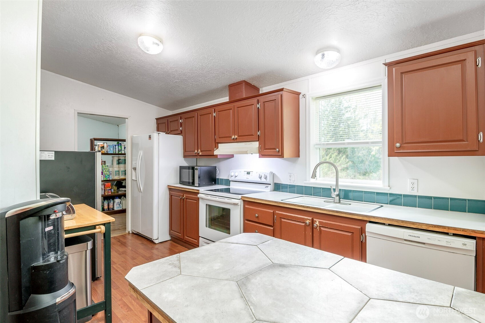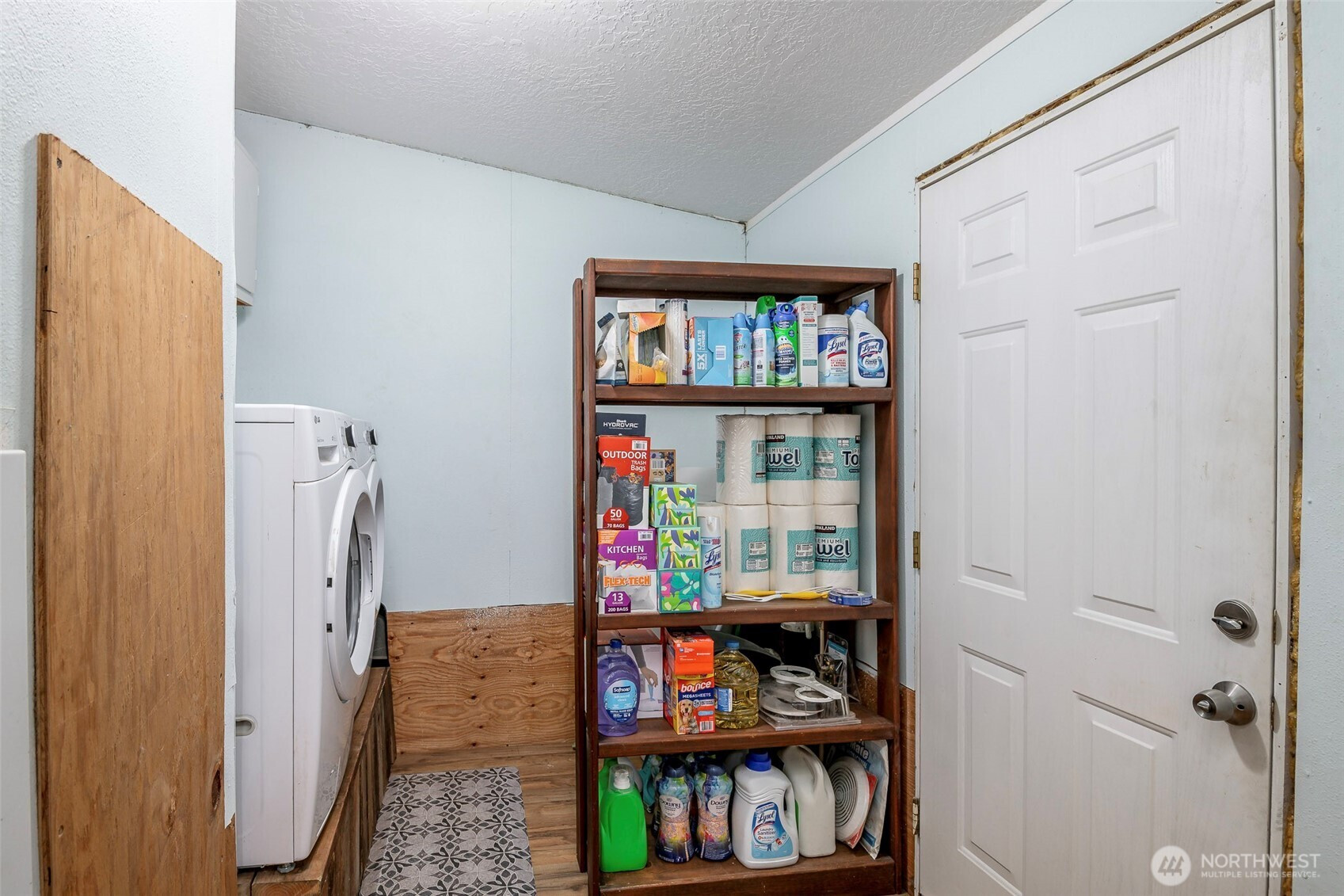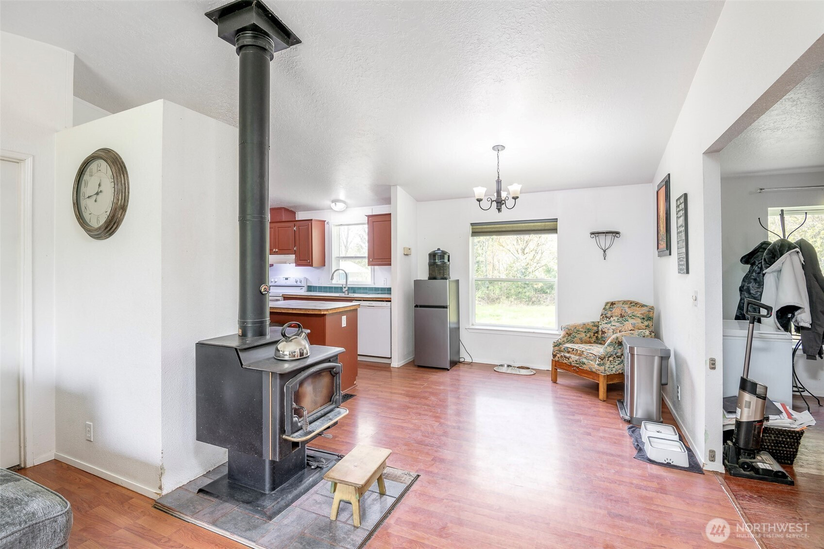 So many opportunities with this 10 acre property in quiet Lakebay community. The manufactured home on the property has vaulted ceilings for an open feel in the living and dining rooms. There is a cozy wood stove and stunning laminate hardwood flooring throughout. The kitchen offers tons of cabinetry and a center island plus access to the utility room that offers pantry space. The primary bedroom features wainscoting detailing, large walk-in closet and an en-suite bath. 2 additional bedrooms plus an additional full bath. The front porch overlooks the property which includes a shed, and fenced garden area. Storage Container goes with seller.