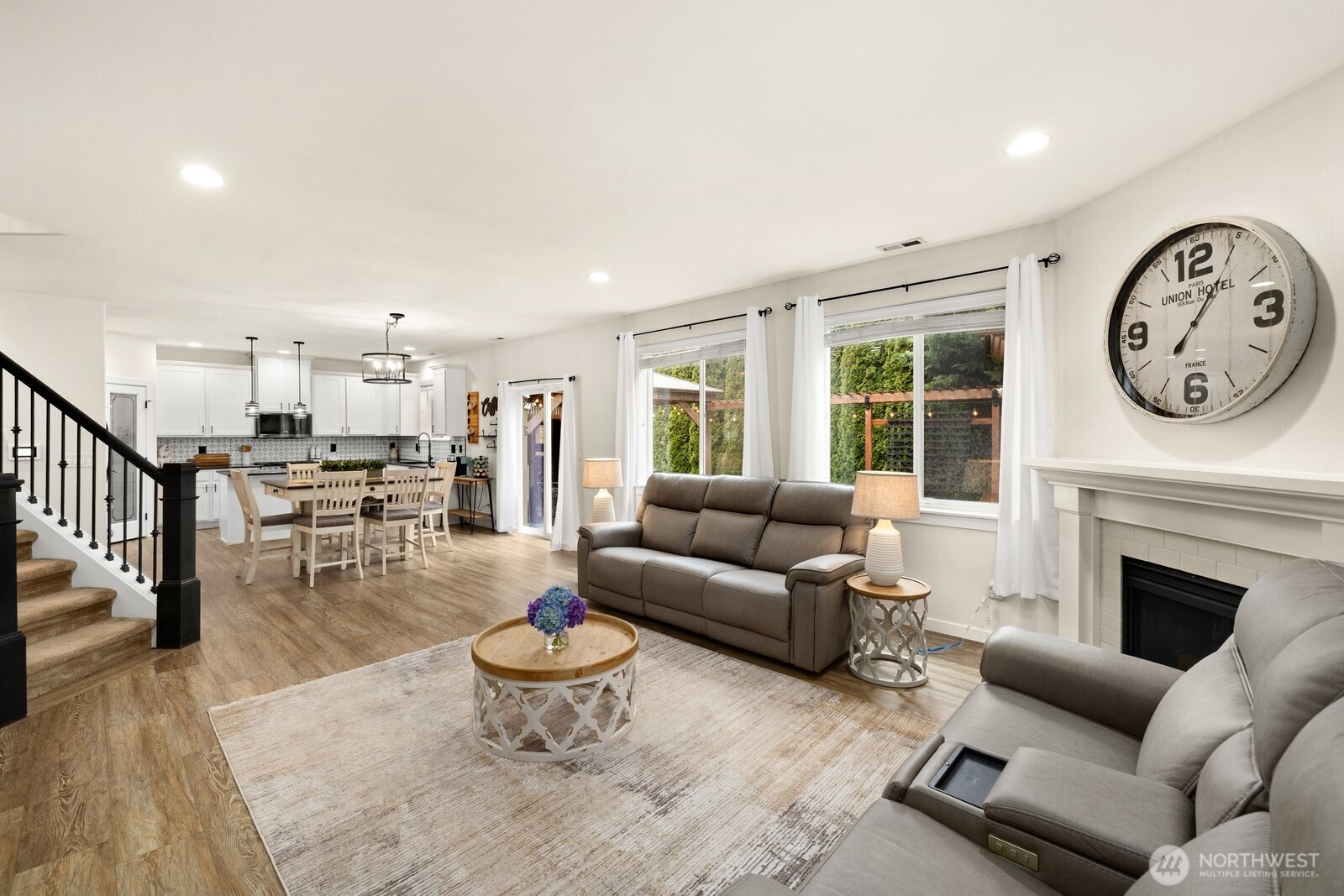 Beautifully updated and thoughtfully designed, this home offers exceptional flexibility, space, and outdoor living. The main floor features soaring 9’ ceilings, an open and inviting floor plan, updated interior paint, smart home features, and a rare second primary suite, perfect for guests or multi-generational living. Upstairs, enjoy a spacious family room ideal for relaxing or entertaining, along with updated bathrooms and gorgeous, unique design touches that add warmth and character throughout the home. In addition to the 5 bedrooms, there are 2 additional flex spaces that can be used as an office, family room, extra bedroom, etc. The exterior is just as impressive. A charming white picket fence frames the front yard, while parking is abundant with four off-street spaces plus a 3-car garage with additional storage. Step into the backyard oasis designed for both function and fun, custom lighting, a cozy fire pit, and a one-of-a-kind BBQ shack that can also serve as a workshop, hobby space, or creative retreat. This home seamlessly blends everyday comfort with standout features inside and out. Amazing location with easy access to the freeway and all that downtown Sumner has to offer. Don't miss the epic Mt Rainier views from the downstairs sitting room, upstairs bedrooms and additional family room. Pre-inspected and rate buy down available.