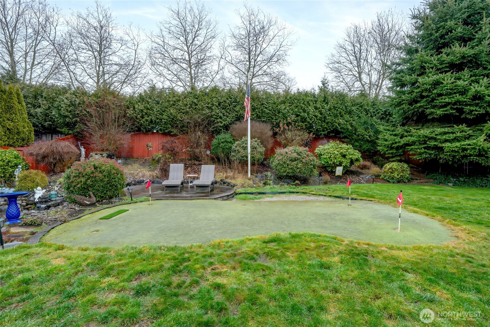 Welcome home to this charming 3-bedroom, 1.75-bath single-story retreat in the highly sought-after High Cedars Golf Community. The inviting living room features a cozy gas fireplace and flows effortlessly into the kitchen and dining area, highlighted by vaulted ceilings and abundant natural light. The spacious primary suite offers a private en-suite bath and walk-in closet. Step outside to your own backyard oasis, complete with a covered patio, putting green with sand bunker, tranquil koi pond, and relaxing waterfall—perfect for entertaining or unwinding. A new 7-person hot tub on a separate electrical panel, gas BBQ hookup, and fully fenced yard add to the outdoor appeal. Recent updates include a new heat pump and furnace, LVP flooring, new bedroom carpet, fresh interior paint, newer roof, and solar panels (2020). Additional upgrades include a cleaned crawl space with new vapor barrier, insulated garage and attic, two-car garage, designated golf cart parking, and ample storage. Enjoy community amenities such as a clubhouse, golf course, scenic trails, golf cart access, and a low annual HOA. Conveniently located near Foothills Trail, Hwy 167 & 410, JBLM, schools, and shopping—this home truly has it all.