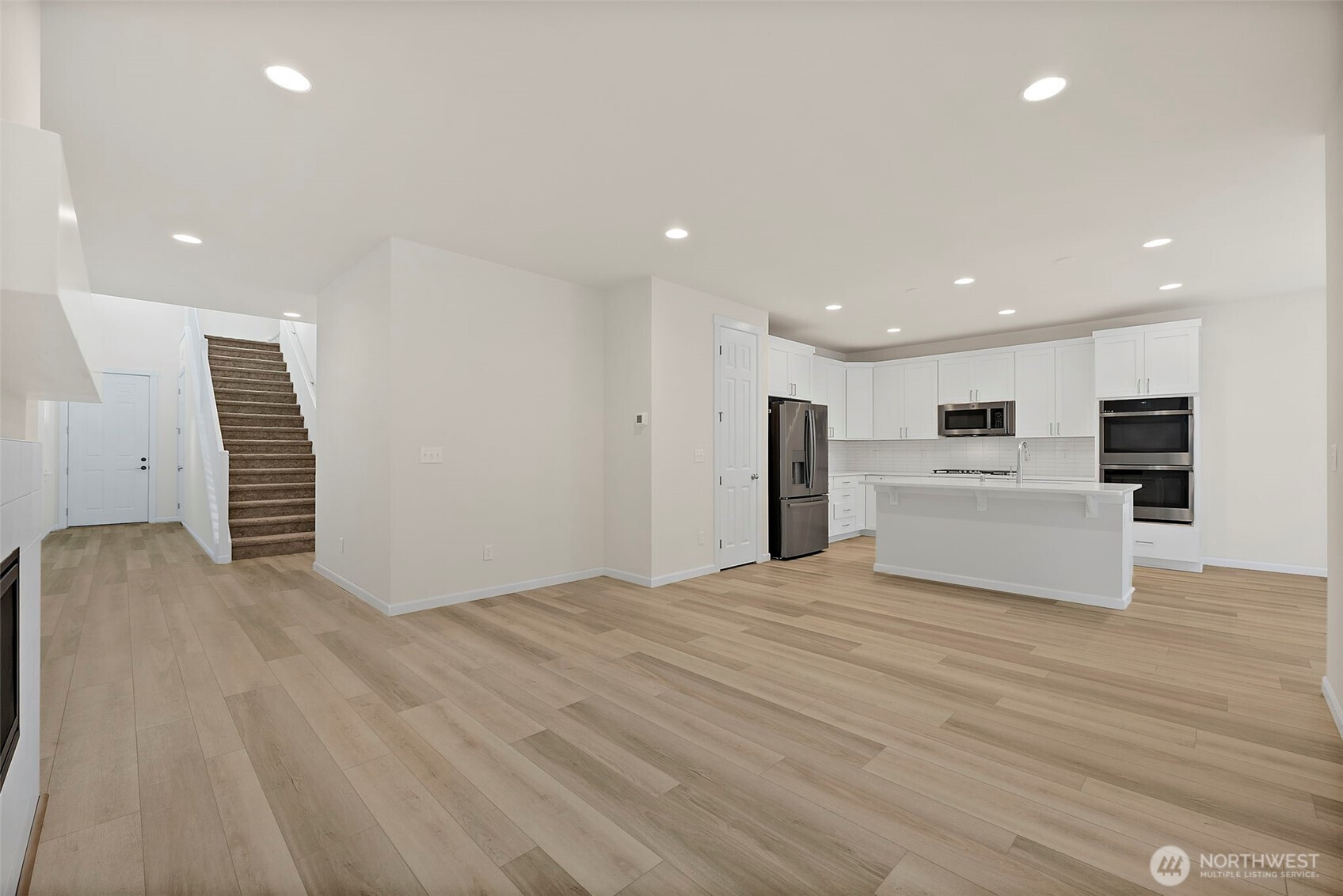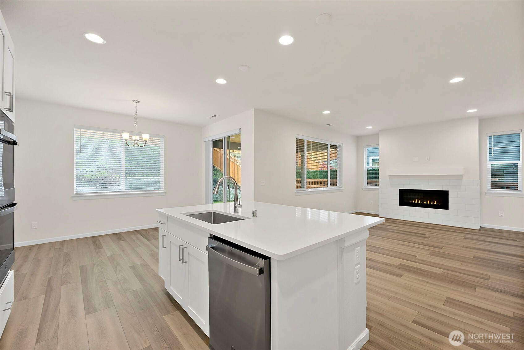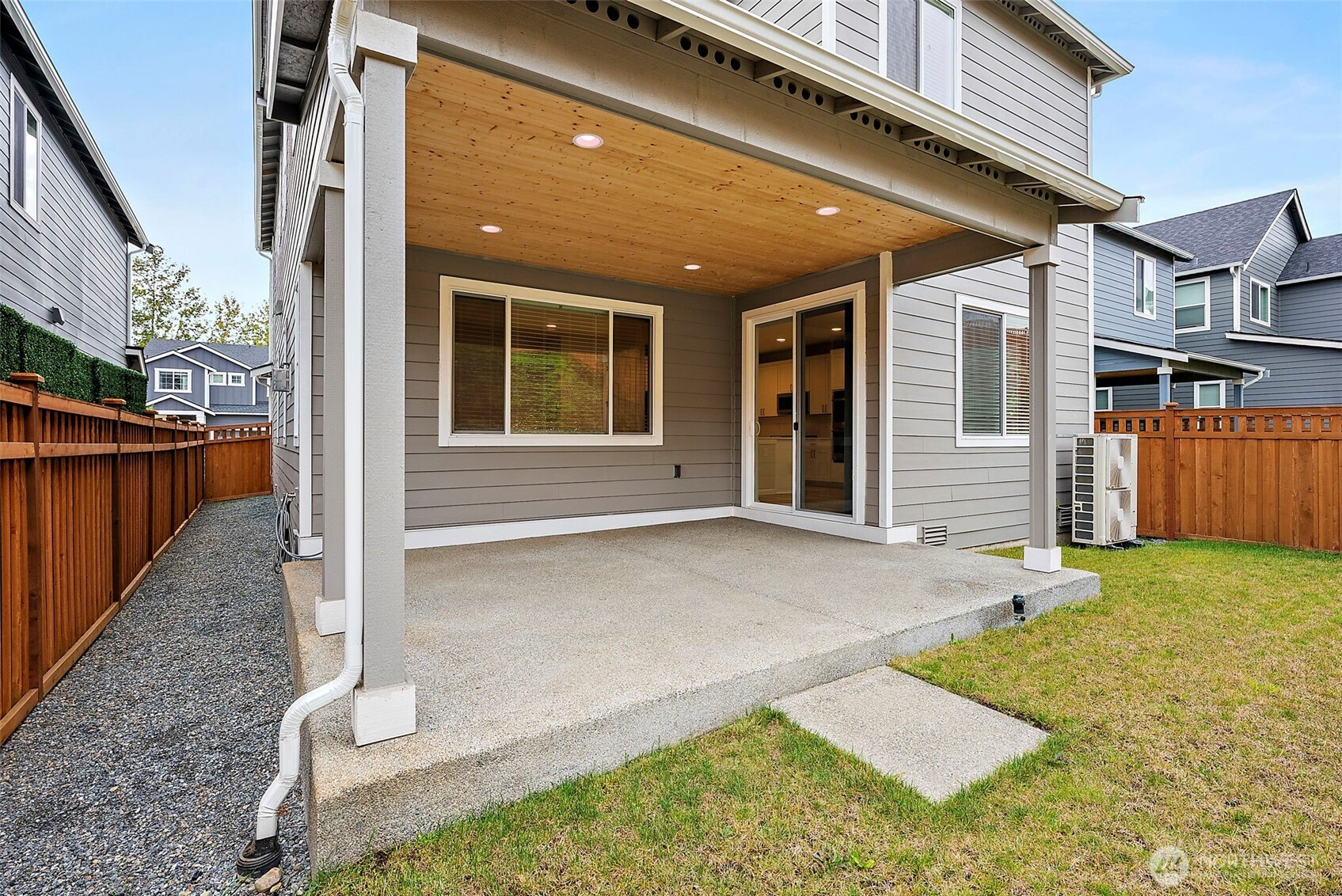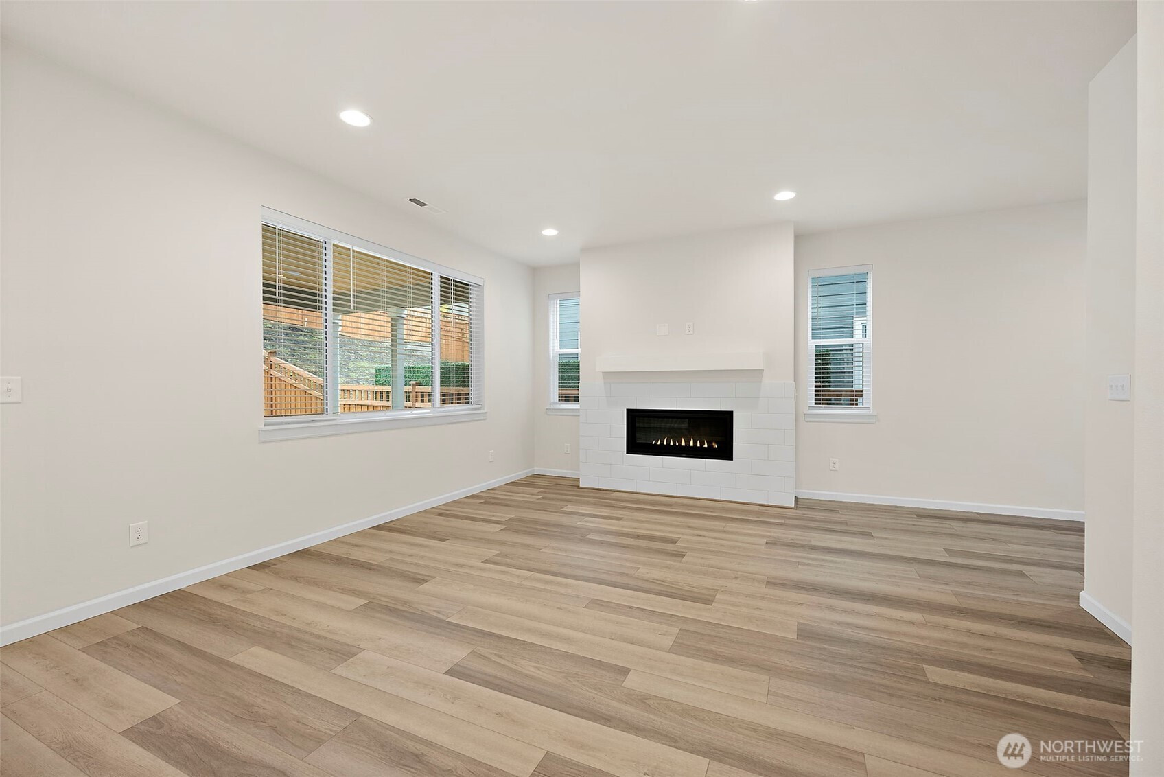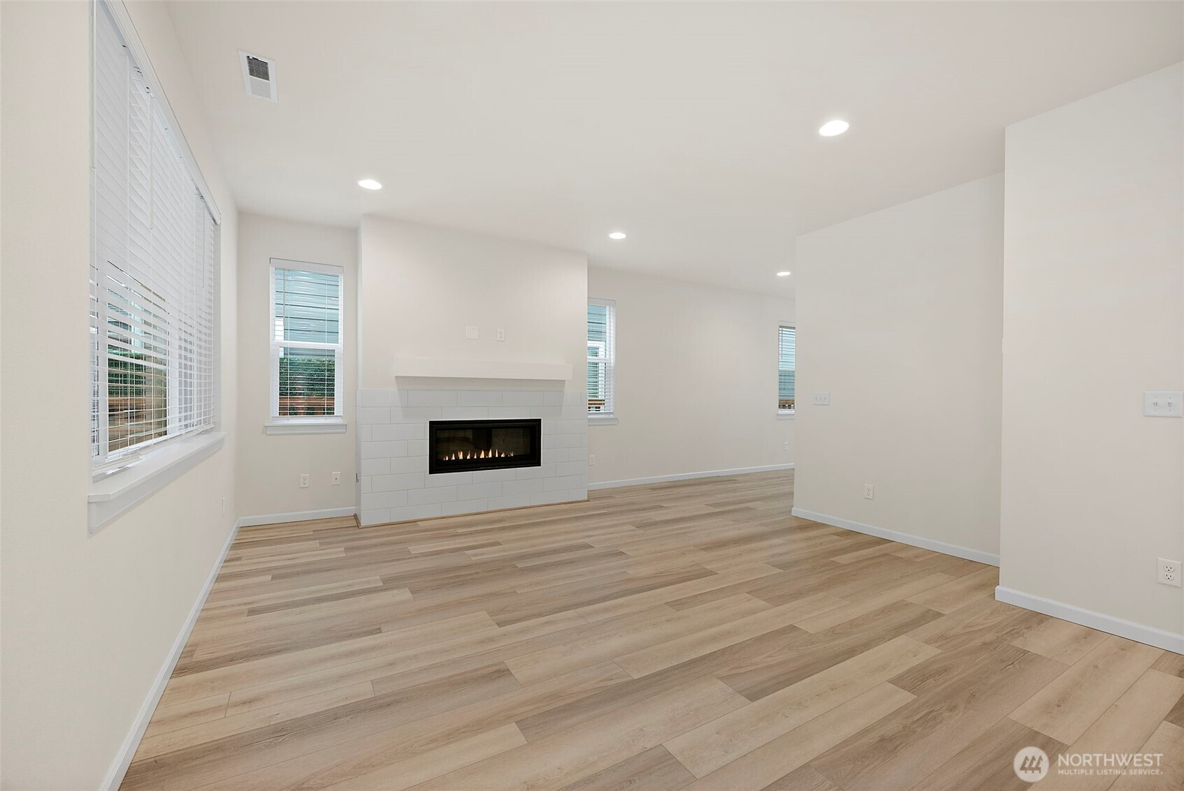 Morning light spills across wide plank floors as the house wakes. The kitchen shines with quartz counters, white shaker cabinets, stainless appliances, and a big island where breakfasts stretch into plans for the day. The great room gathers everyone by the fireplace, then opens to a private patio and a low maintenance yard made for easy evenings. In summer, A/C keeps every room cool and calm. A main level guest suite welcomes guests or work from home days. Upstairs, a spacious loft becomes movie night central. The primary suite feels like a spa with a soaking tub and an oversized walk in closet. Step outside to trails, parks, and coffee at Post & Pour. Life here looks connected, relaxed, and yours