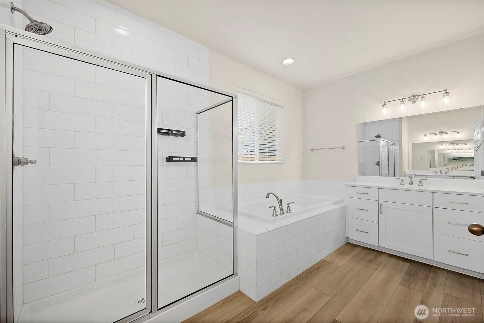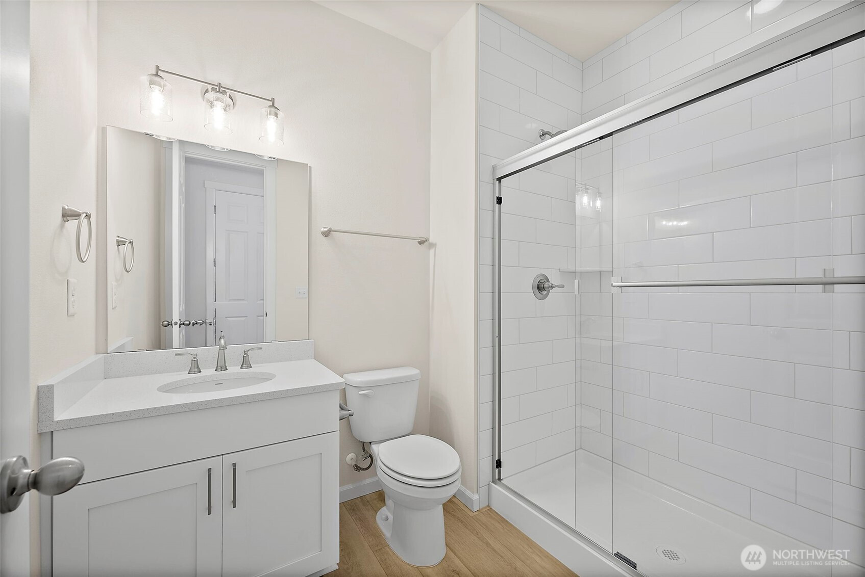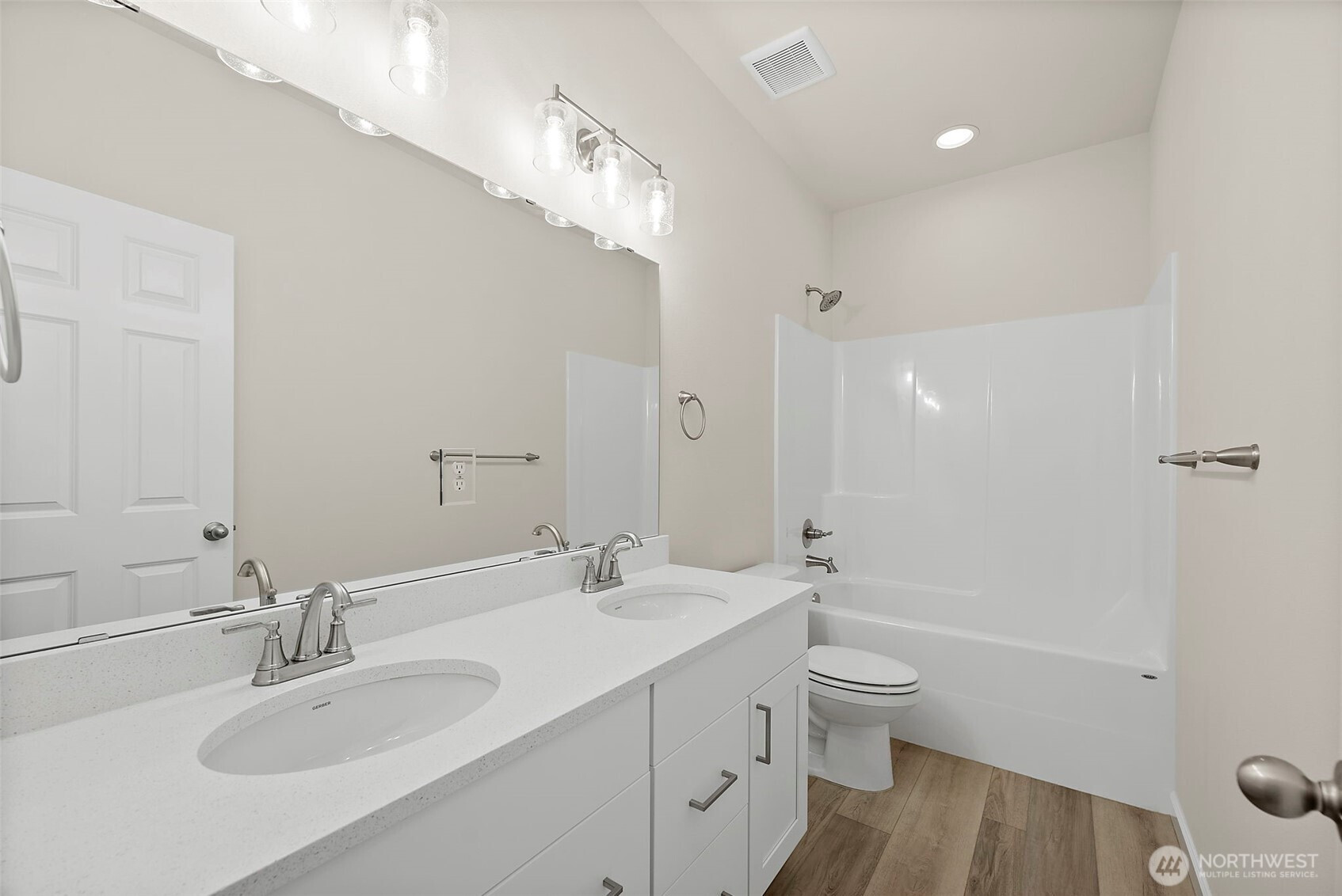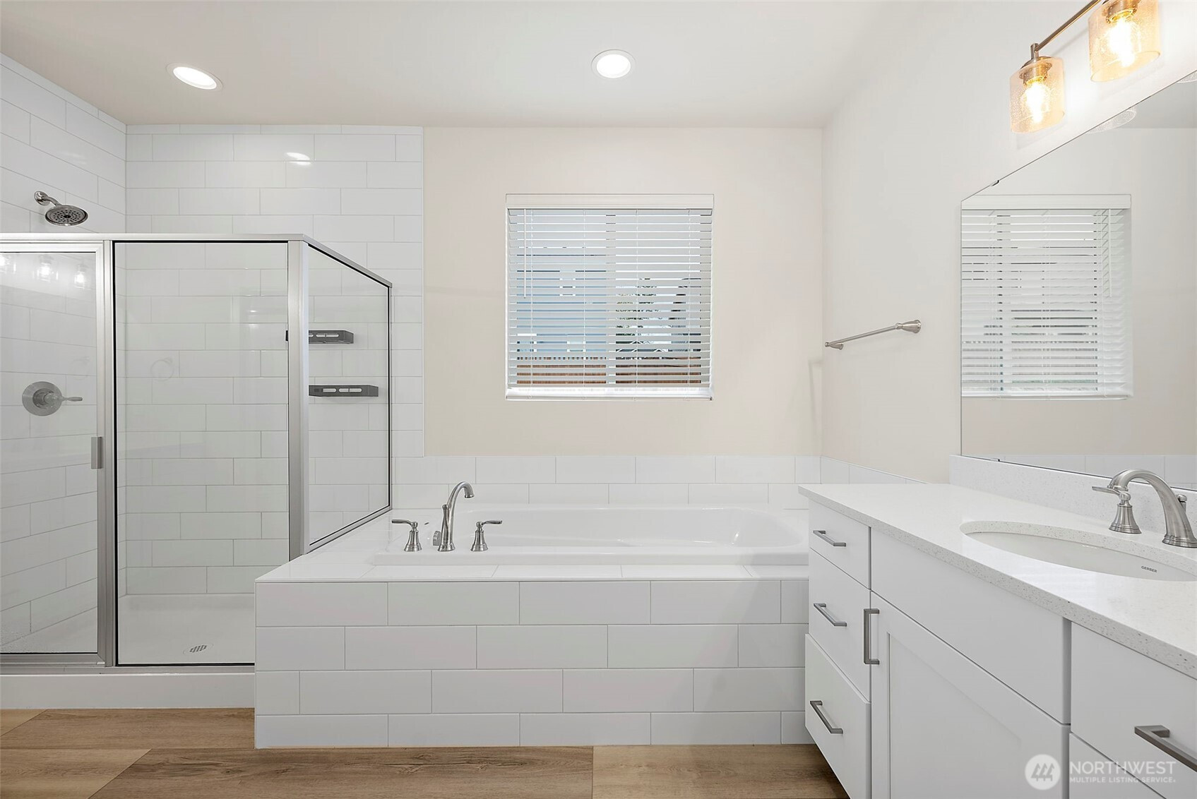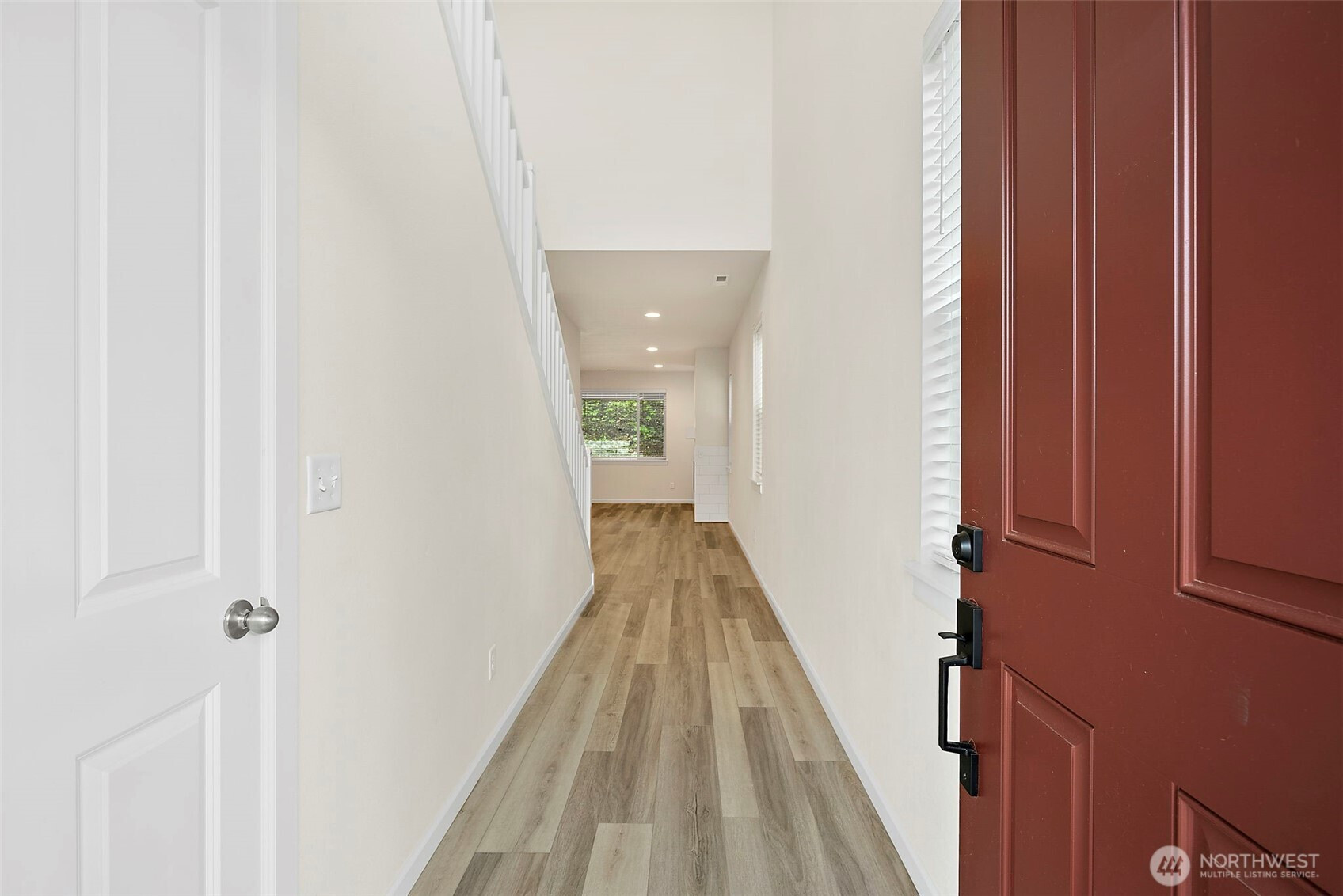 Morning light spills across wide plank floors as the house wakes. The kitchen shines with quartz counters, white shaker cabinets, stainless appliances, and a big island where breakfasts stretch into plans for the day. The great room gathers everyone by the fireplace, then opens to a private patio and a low maintenance yard made for easy evenings. In summer, A/C keeps every room cool and calm. A main level guest suite welcomes guests or work from home days. Upstairs, a spacious loft becomes movie night central. The primary suite feels like a spa with a soaking tub and an oversized walk in closet. Step outside to trails, parks, and coffee at Post & Pour. Life here looks connected, relaxed, and yours