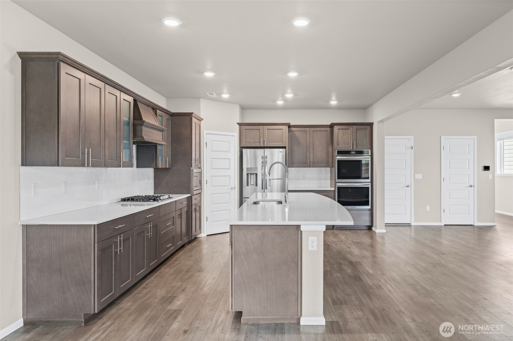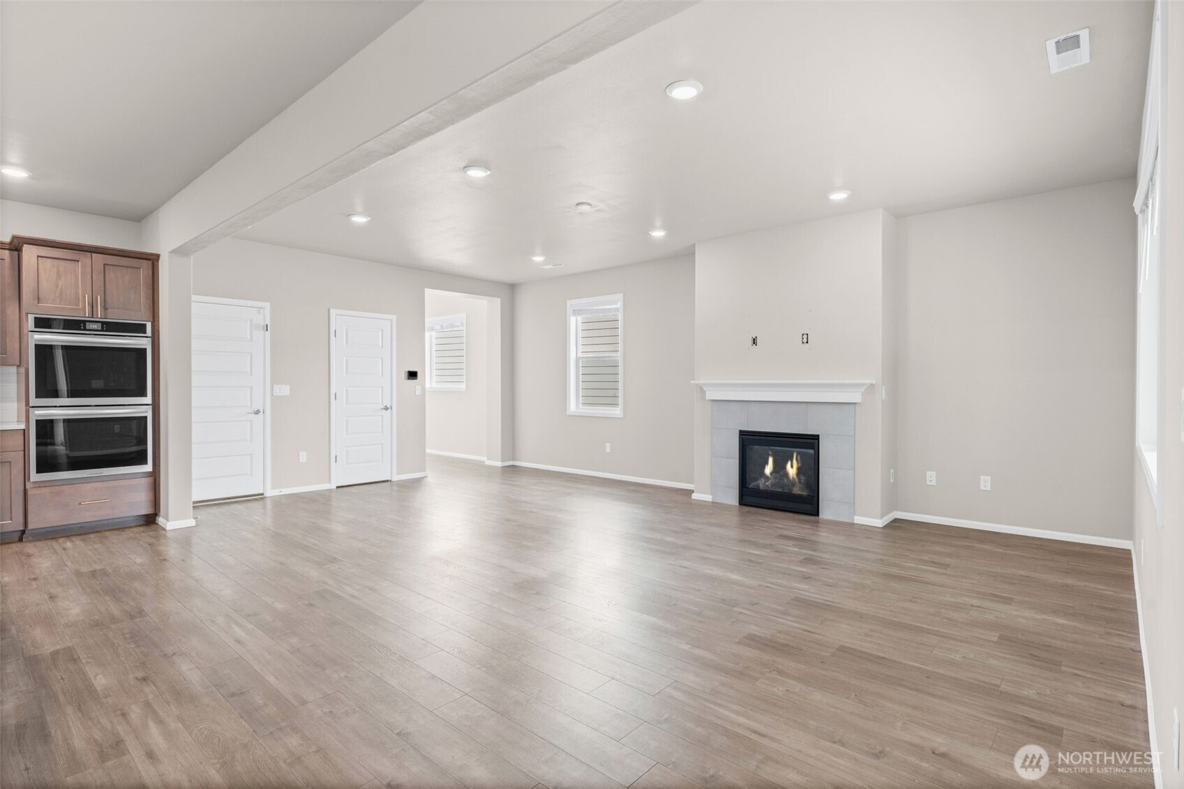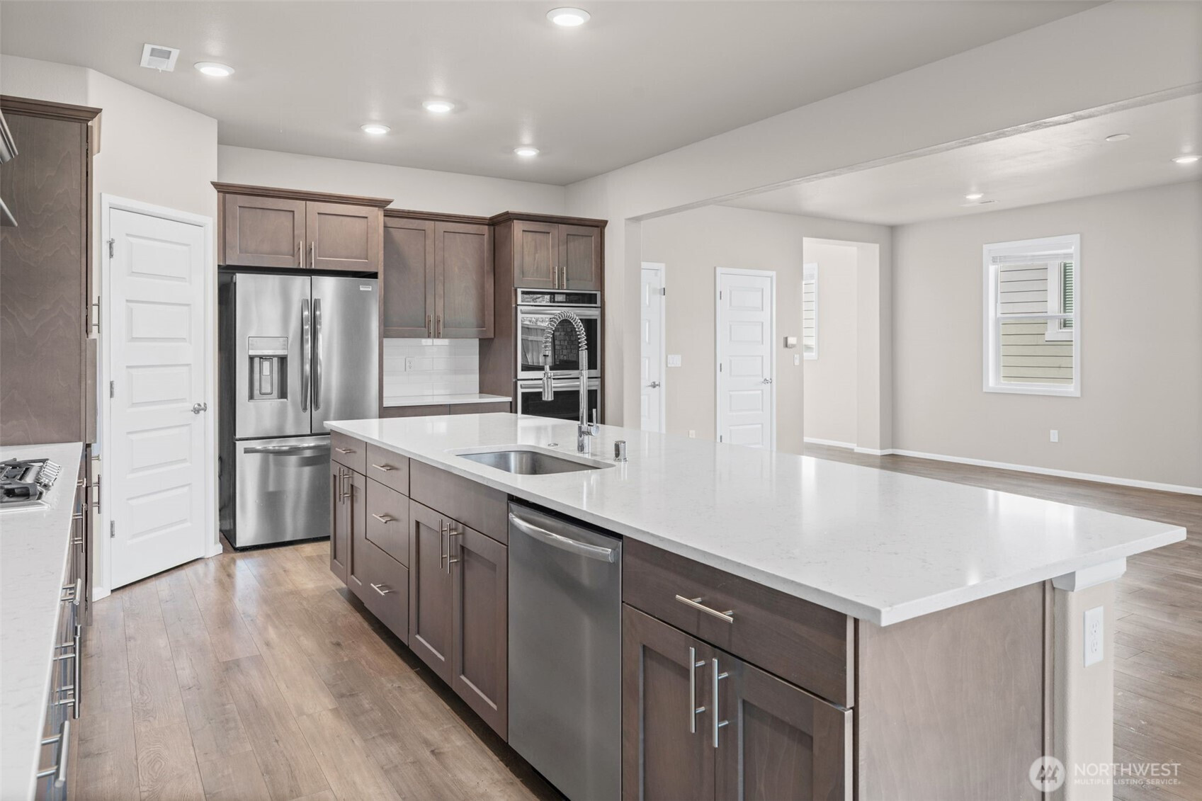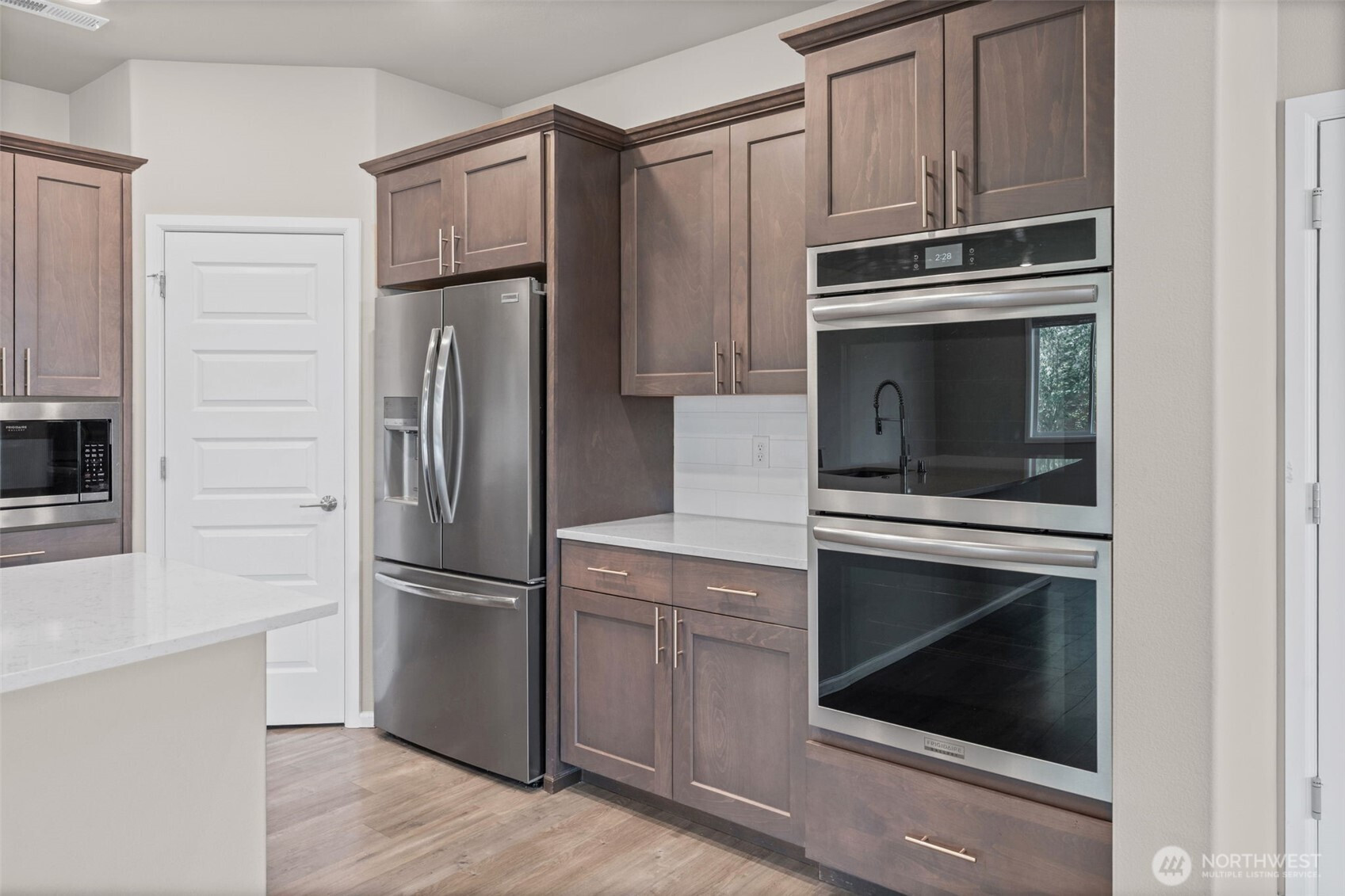 Welcome to Tehaleh living at its finest! Built in 2022, this beautifully upgraded Lennar Magnolia Plan home offers the perfect blend of comfort, style, and outdoor connection. Ideally situated backing to open space and scenic walking trails—and just steps from the new mountain bike park—this home delivers both privacy and adventure right outside your door. The open-concept main level is designed for entertaining, featuring a stunning kitchen with an oversized quartz island, double oven, abundant cabinetry, and seamless flow into the spacious great room with a cozy gas fireplace. Upstairs, enjoy a generous primary suite with a luxurious 5-piece bath, along with three additional bedrooms, a full bath, and a conveniently located utility room. Stay comfortable year-round with central A/C, and unwind under the covered back patio complete with its own gas fireplace—perfect for relaxing evenings. Thoughtfully designed and loaded with upgrades, this nearly new home is move-in ready and set in one of the area’s most sought-after communities.