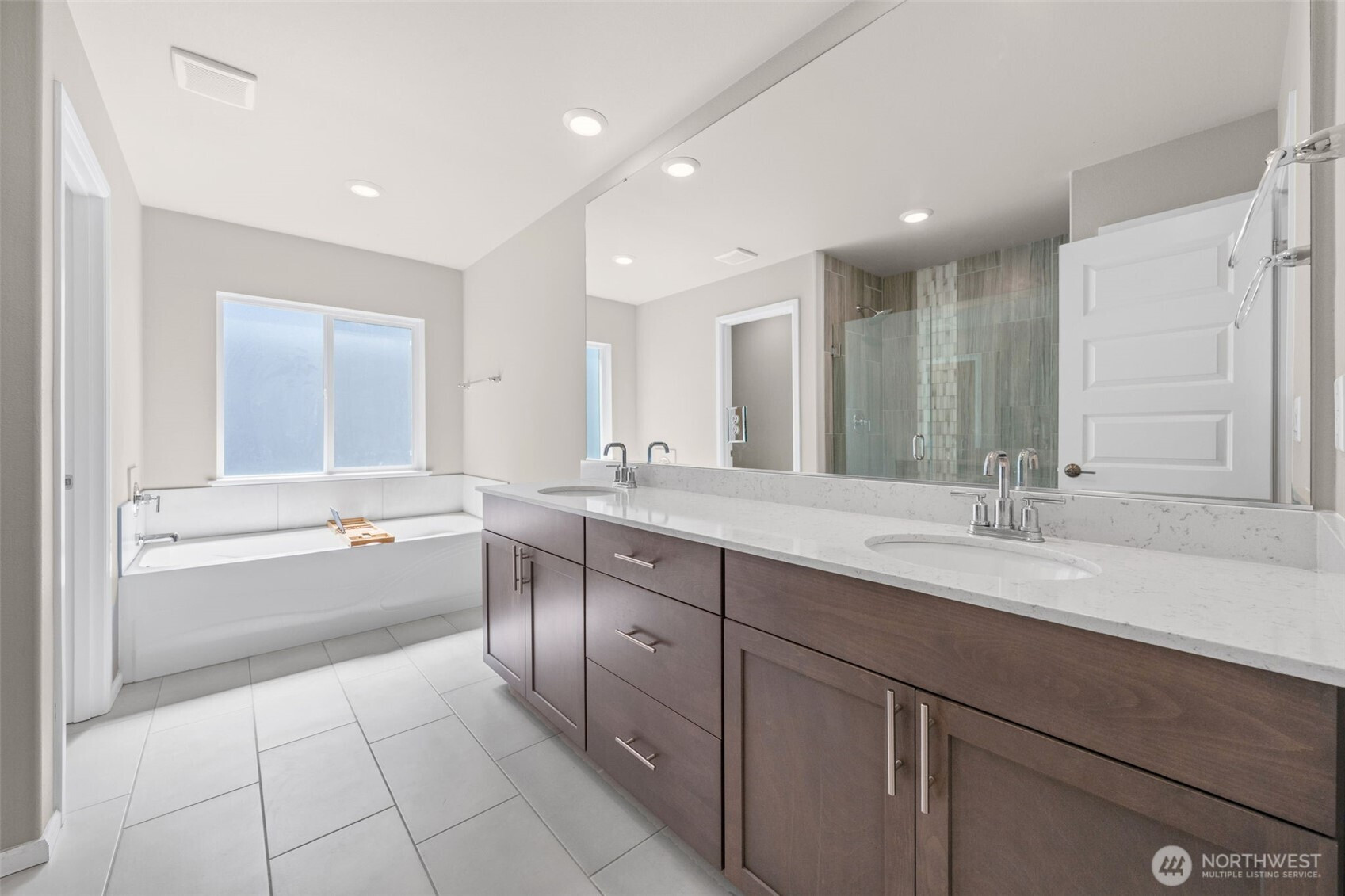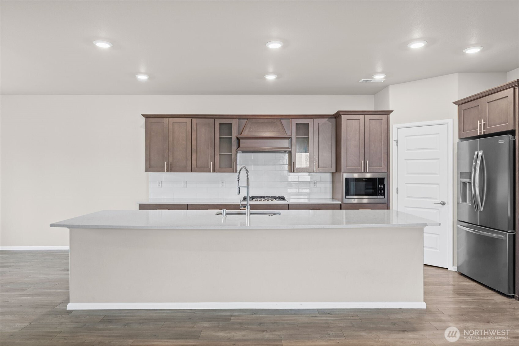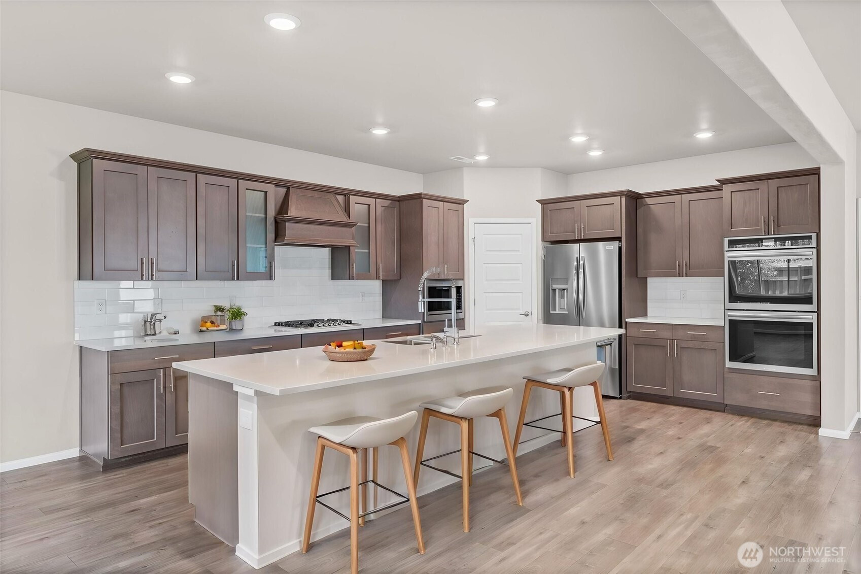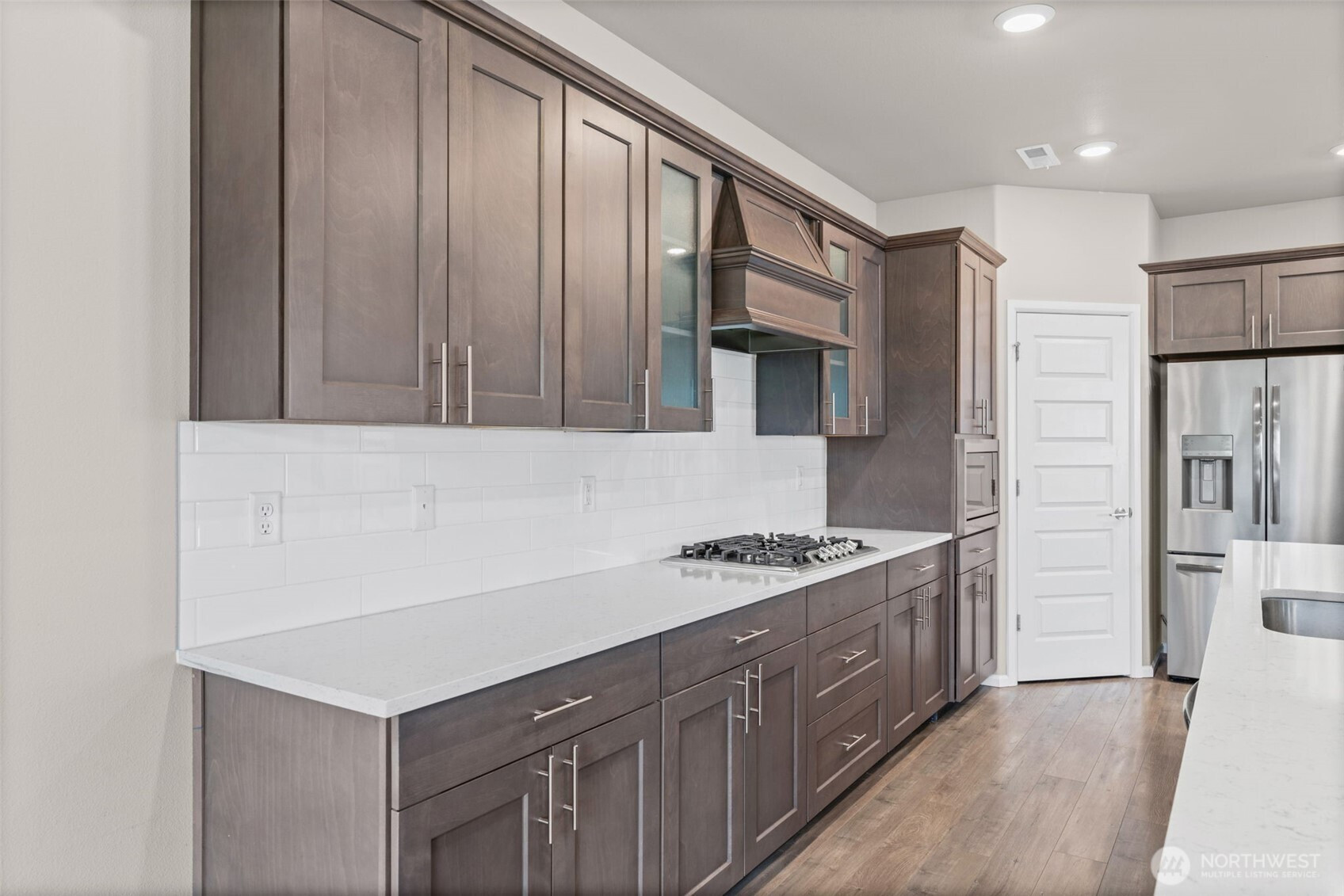 Welcome to Tehaleh living at its finest! Built in 2022, this beautifully upgraded Lennar Magnolia Plan home offers the perfect blend of comfort, style, and outdoor connection. Ideally situated backing to open space and scenic walking trails—and just steps from the new mountain bike park—this home delivers both privacy and adventure right outside your door. The open-concept main level is designed for entertaining, featuring a stunning kitchen with an oversized quartz island, double oven, abundant cabinetry, and seamless flow into the spacious great room with a cozy gas fireplace. Upstairs, enjoy a generous primary suite with a luxurious 5-piece bath, along with three additional bedrooms, a full bath, and a conveniently located utility room. Stay comfortable year-round with central A/C, and unwind under the covered back patio complete with its own gas fireplace—perfect for relaxing evenings. Thoughtfully designed and loaded with upgrades, this nearly new home is move-in ready and set in one of the area’s most sought-after communities.