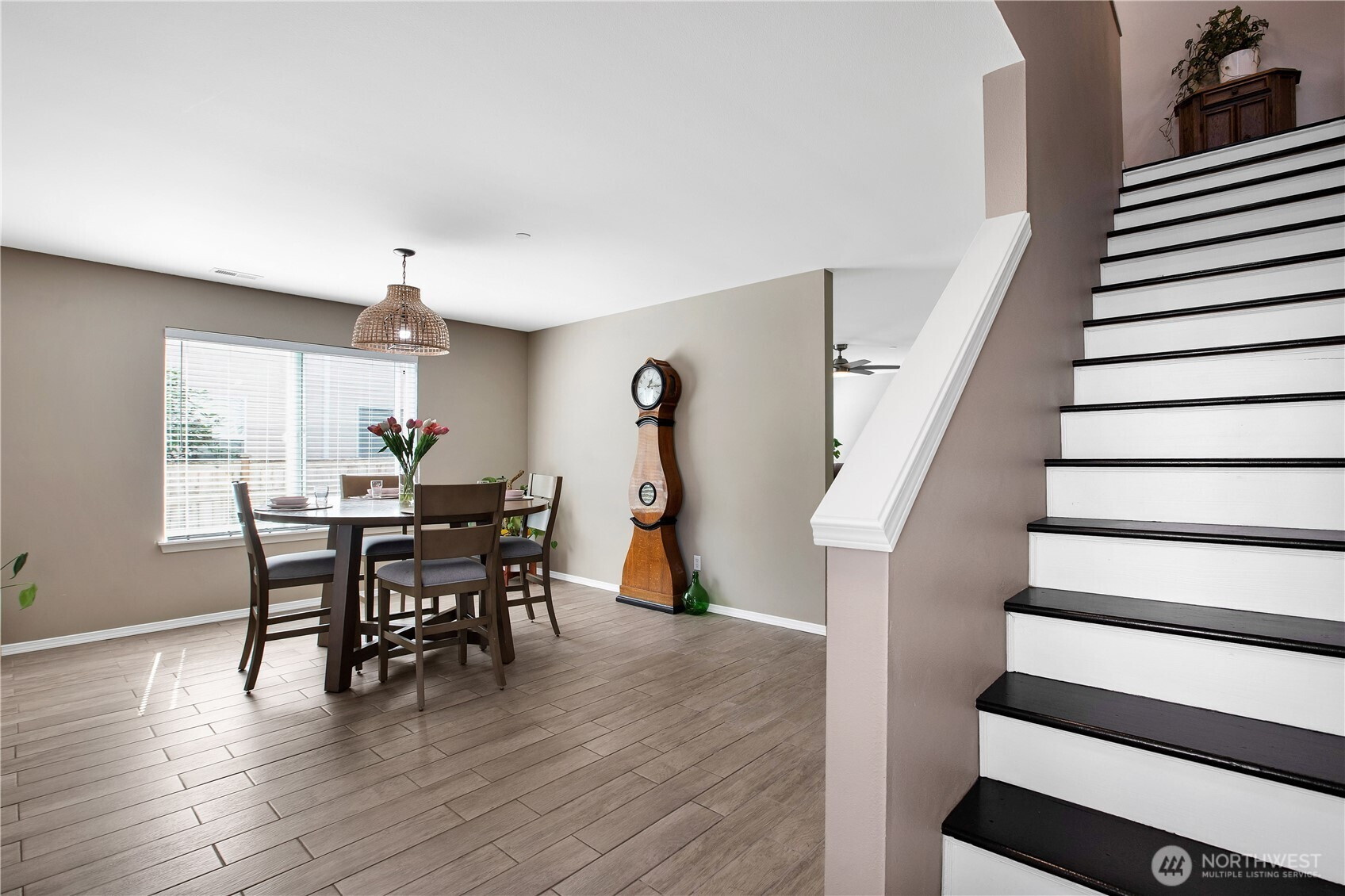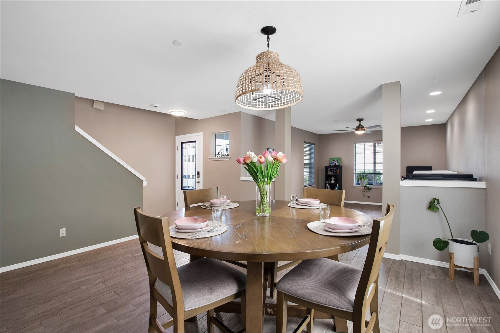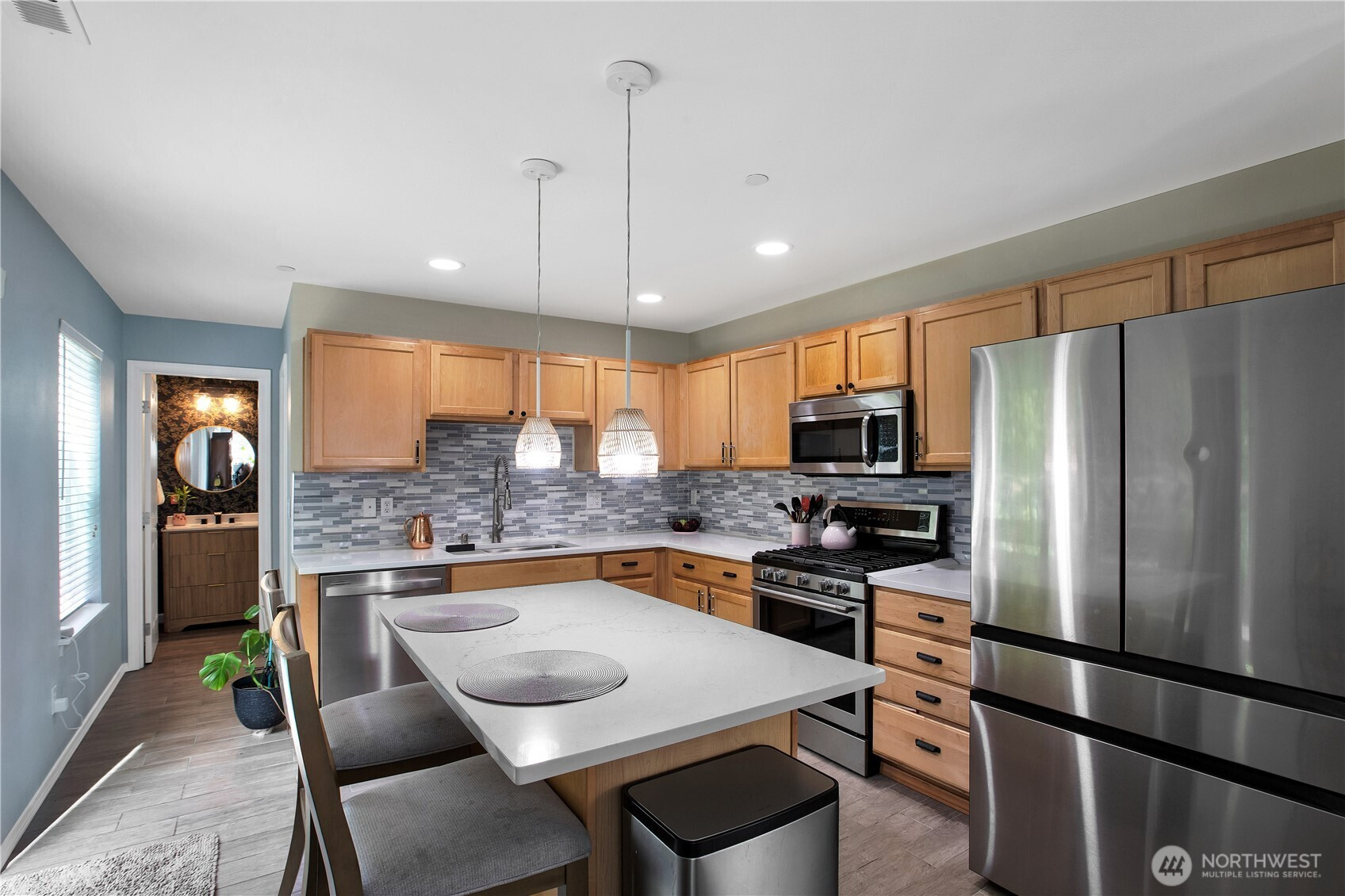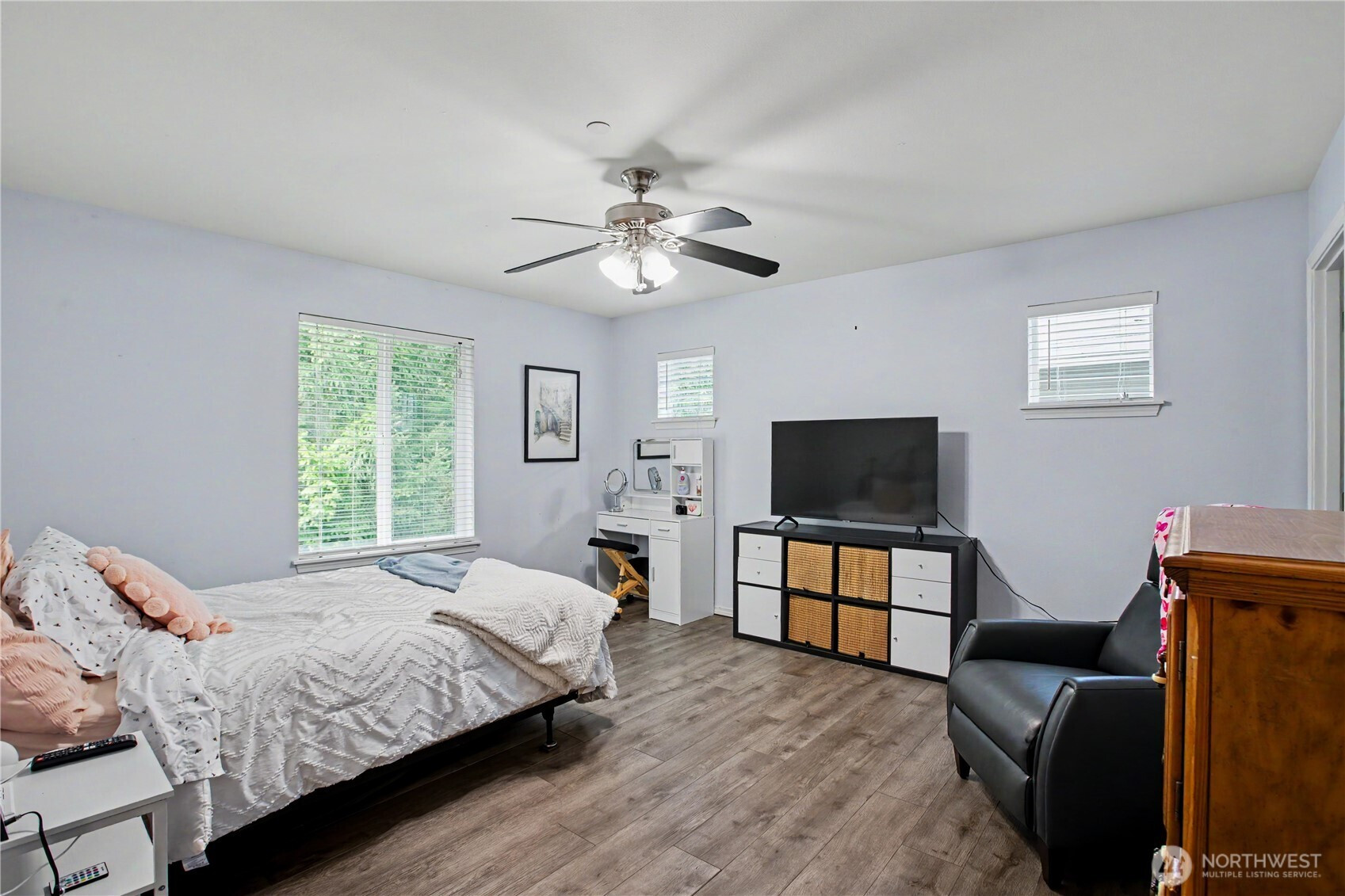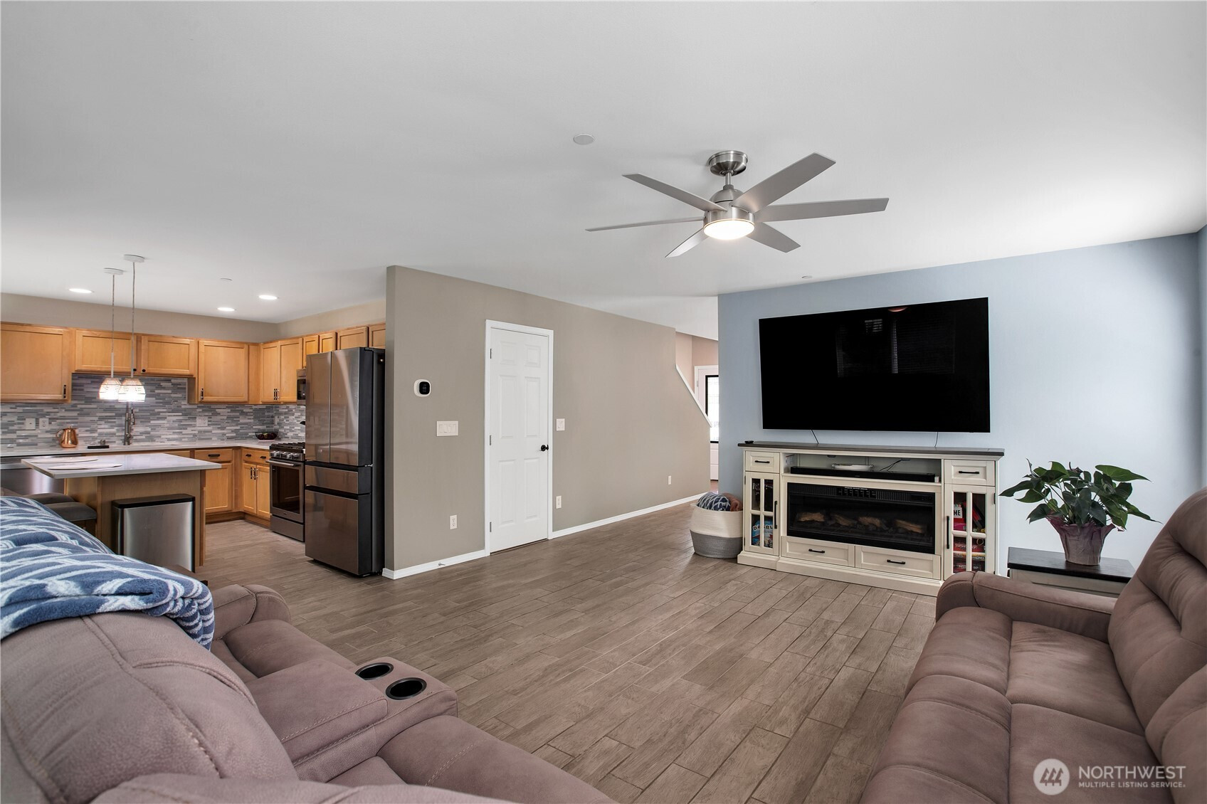 Bright, polished, and move-in ready! The covered front porch welcomes you in, while the private greenbelt backyard creates a peaceful retreat. This 4-bedroom, 2.5-bath home offers 2,603 sqft of thoughtfully designed space, including a front den/office, dining room, and main-level half bath. You’ll find durable ceramic tile throughout and a refreshed kitchen with new countertops, a center island, and walk-in pantry/mudroom. Upstairs, all bedrooms feature ceiling fans and walk-in closets, including a spacious primary suite with a 5-piece bath. Enjoy peace of mind with newer furnace, AC, water heater, and refrigerator, plus smart upgrades like updated lighting, Ecobee thermostat, motion-sensor bathroom lights, and humidity sensors. Complete with a 2-car garage, overhead storage, and trail access from your own backyard. Minutes to JBLM, I-5, and all DuPont has to offer!