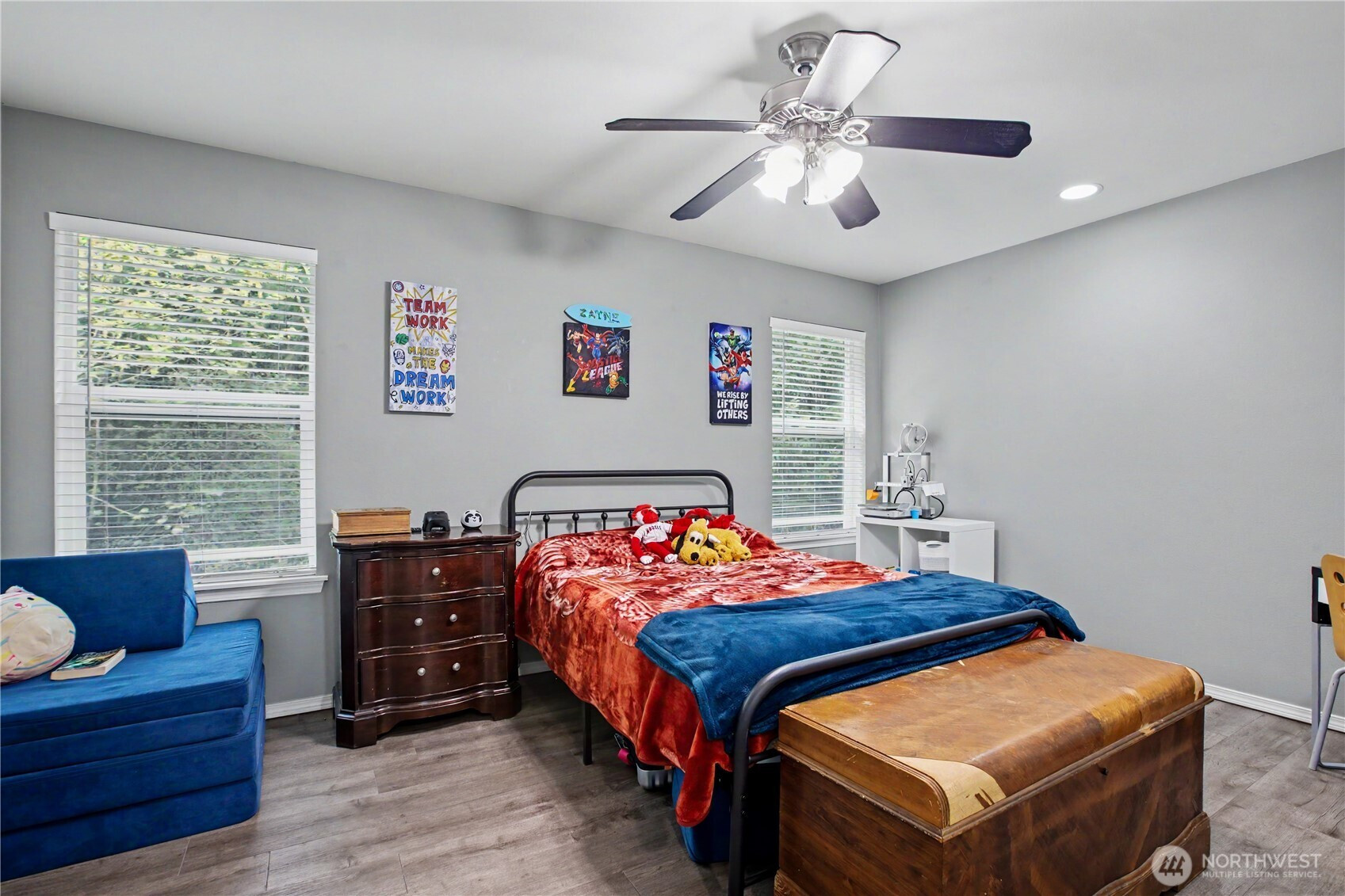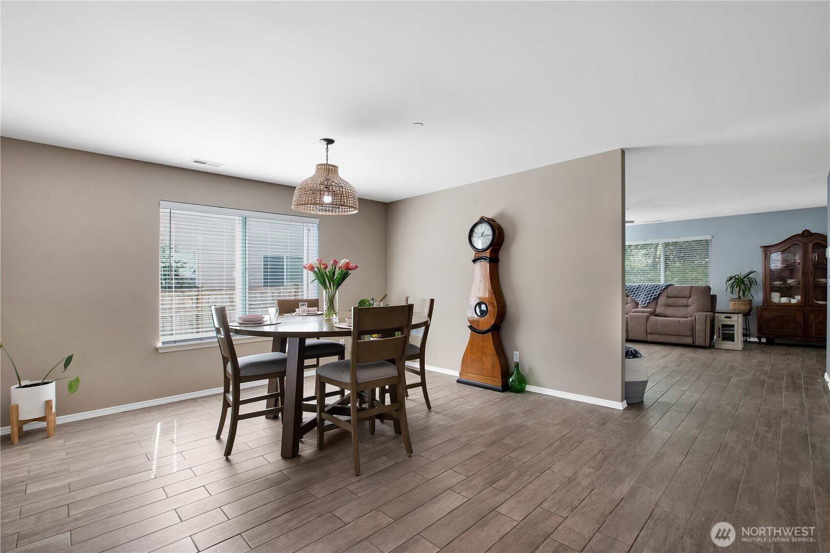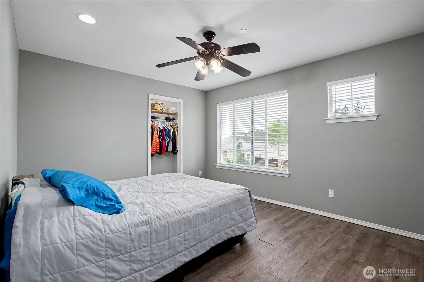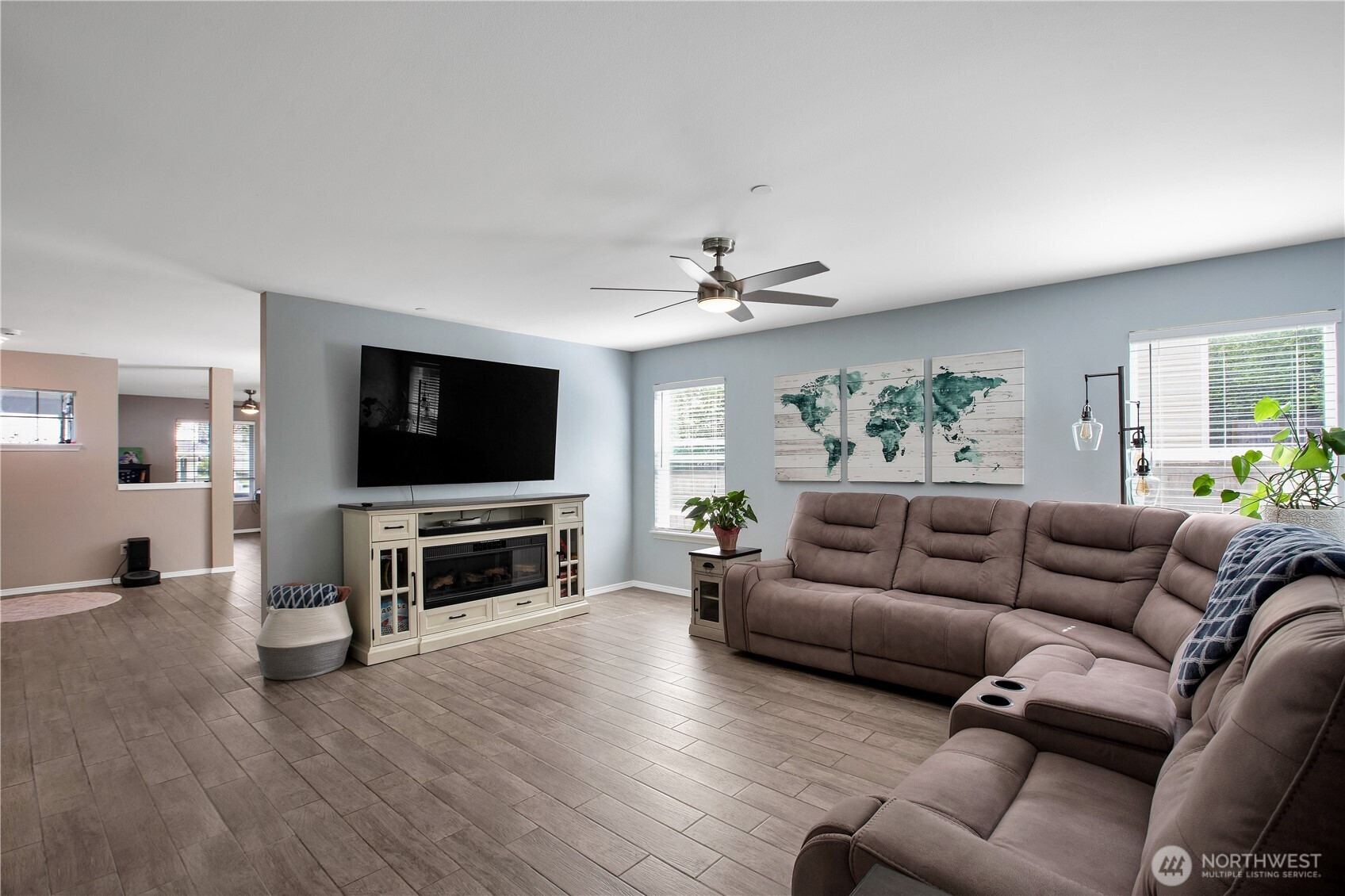 Bright, polished, and move-in ready! The covered front porch welcomes you in, while the private greenbelt backyard creates a peaceful retreat. This 4-bedroom, 2.5-bath home offers 2,603 sqft of thoughtfully designed space, including a front den/office, dining room, and main-level half bath. You’ll find durable ceramic tile throughout and a refreshed kitchen with new countertops, a center island, and walk-in pantry/mudroom. Upstairs, all bedrooms feature ceiling fans and walk-in closets, including a spacious primary suite with a 5-piece bath. Enjoy peace of mind with newer furnace, AC, water heater, and refrigerator, plus smart upgrades like updated lighting, Ecobee thermostat, motion-sensor bathroom lights, and humidity sensors. Complete with a 2-car garage, overhead storage, and trail access from your own backyard. Minutes to JBLM, I-5, and all DuPont has to offer!