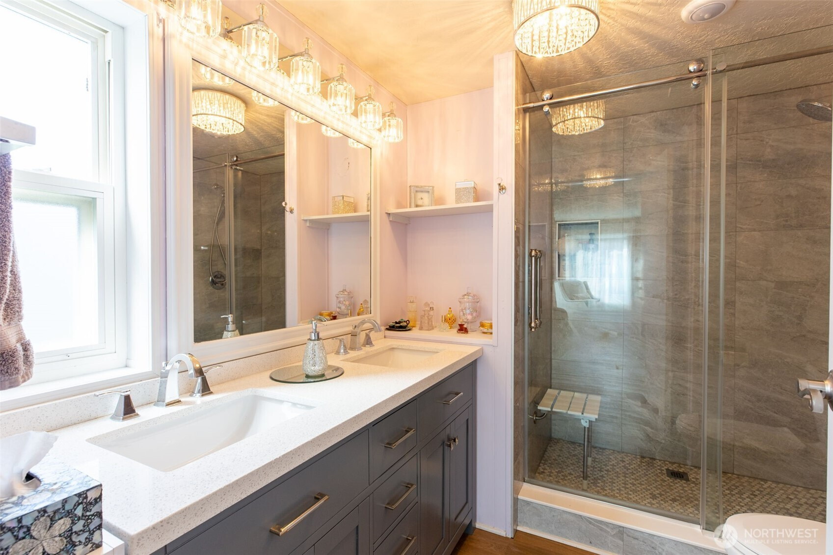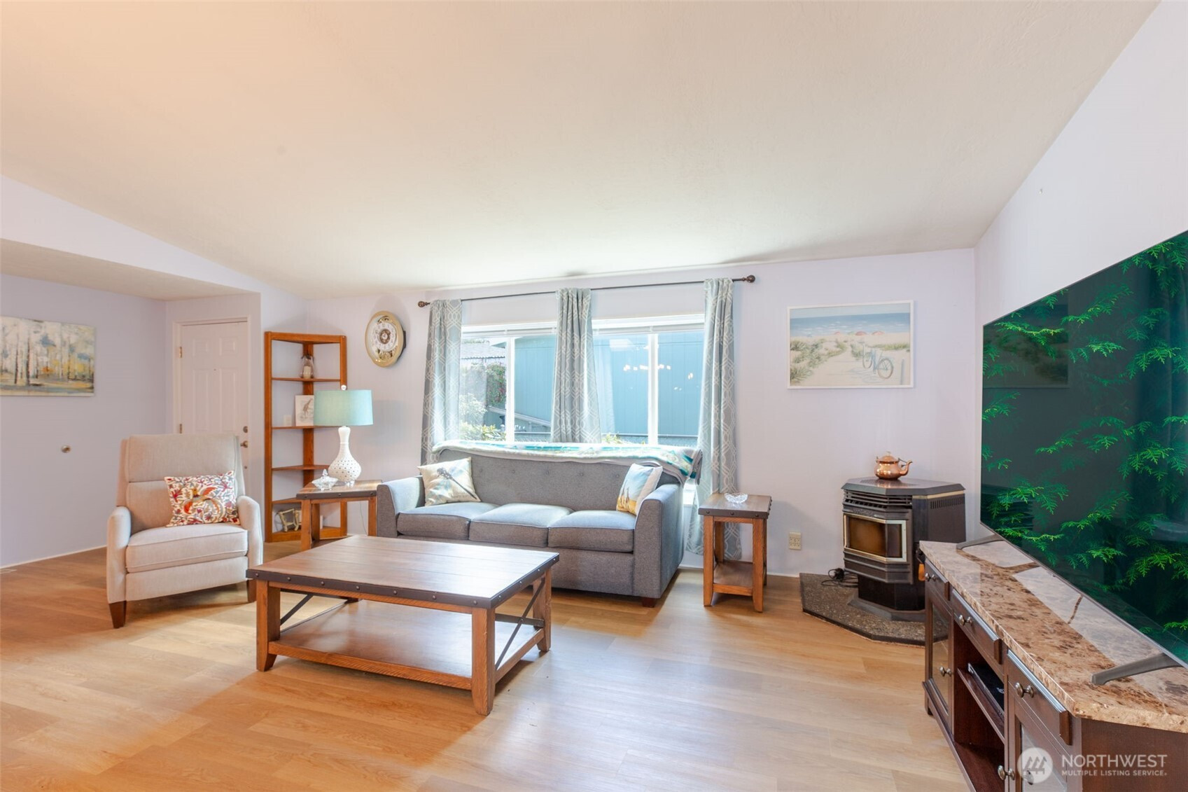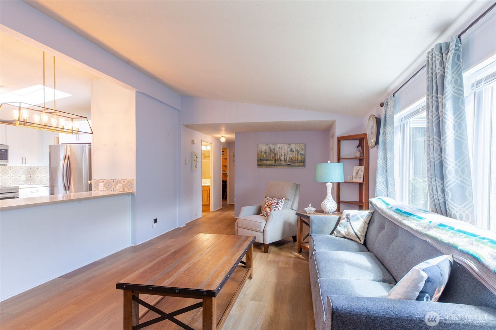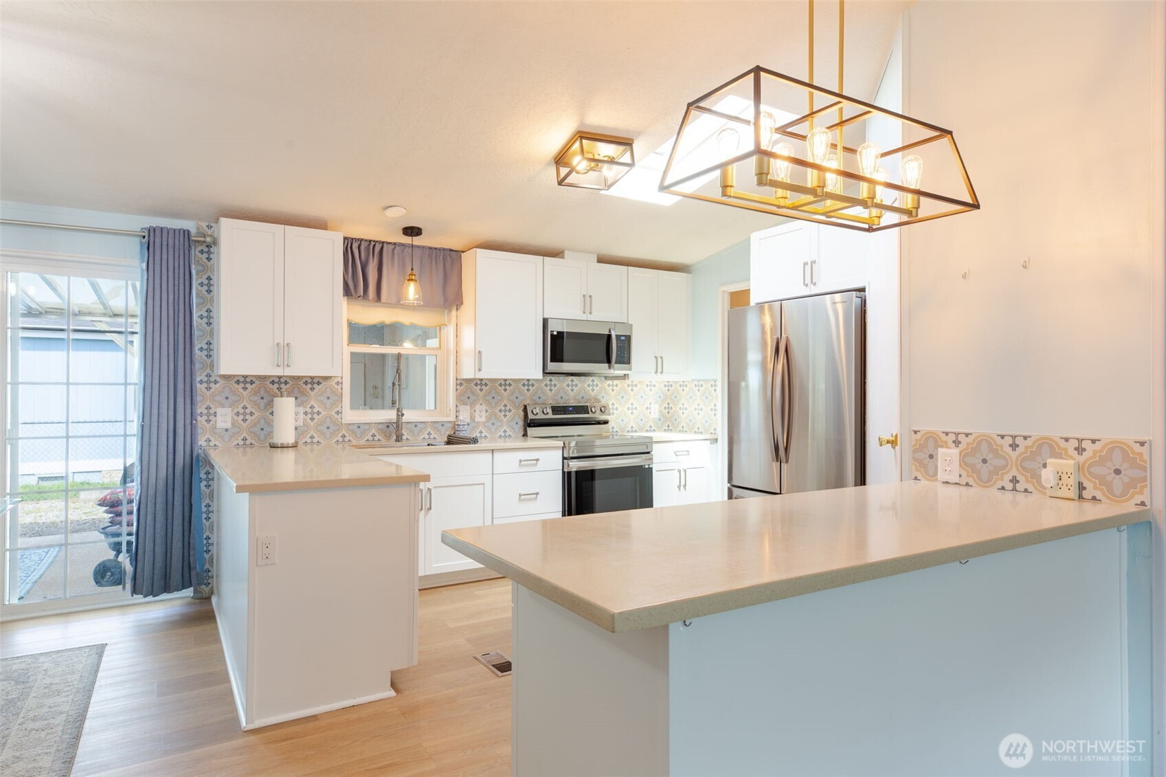 Welcome to easy, low-maintenance living in this beautifully updated 3-bedroom, 2-bath manufactured home located in a desirable 55+ community on South Hill in Puyallup. Situated on a prime lot, this home offers attractive landscaping, a private patio perfect for relaxing or entertaining, and a storage shed with electricity for added convenience. Step inside to an inviting open-concept layout featuring vaulted ceilings and abundant natural light from skylights. The main living areas have been thoughtfully remodeled, showcasing new luxury vinyl plank flooring throughout and updated light fixtures in the kitchen and dining areas. The fully remodeled kitchen is a standout, complete with new cabinetry, quartz countertops, and a stylish backsplash. All appliances are less than four years old, providing peace of mind and modern functionality. The spacious primary suite includes a walk-in closet and a beautifully remodeled private bathroom with a large walk-in shower. Additional updates include a new electrical panel and a newer furnace. Exterior cameras are included. Enjoy the added benefit of community RV parking, along with the comfort, style, and practicality this move-in ready home provides in a welcoming 55+ setting—don’t miss this opportunity! Must have park approval.
