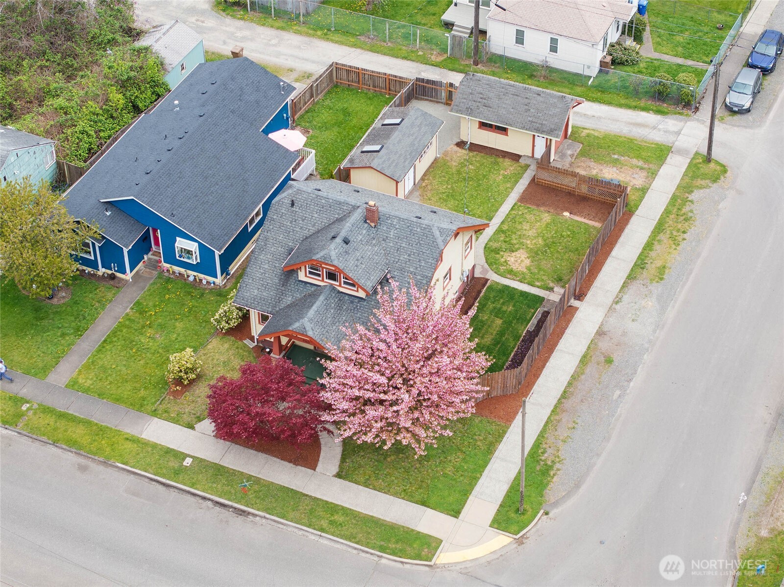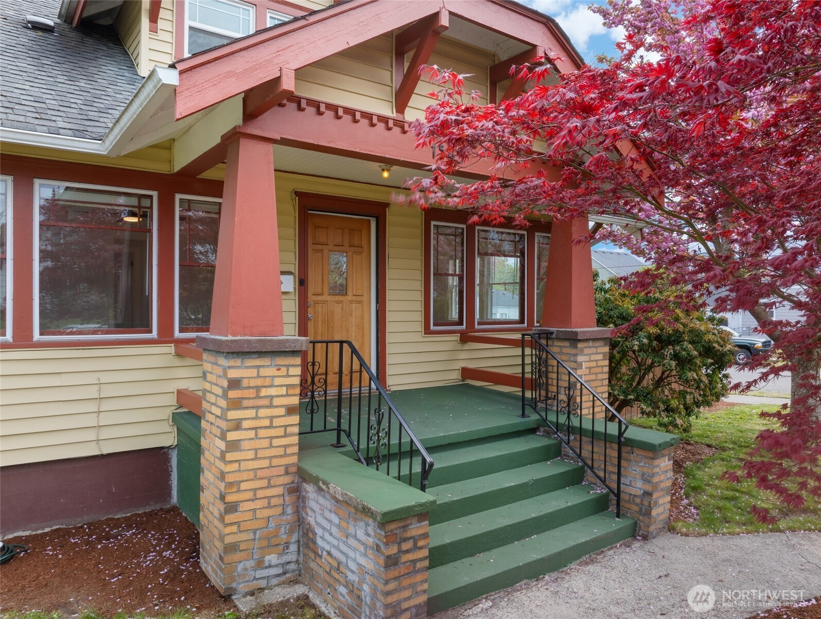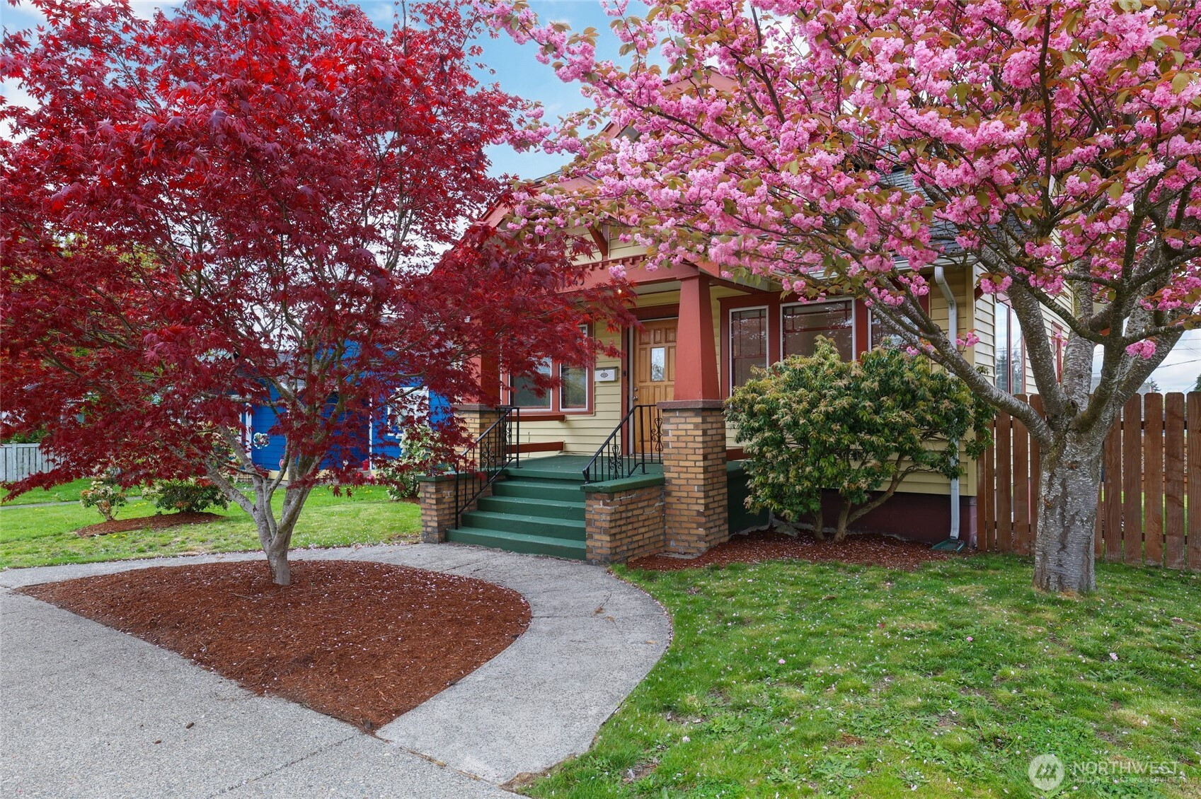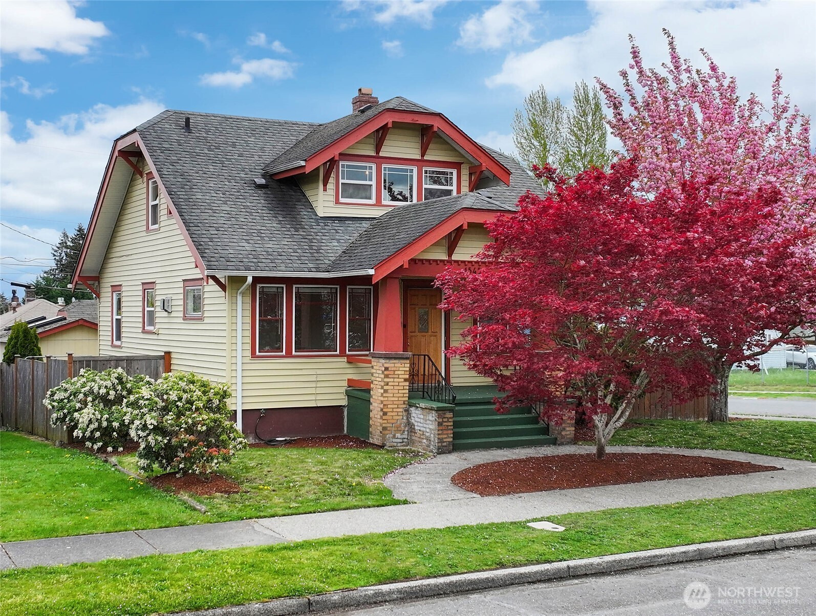 Classic Tacoma Craftsman charm packed with character, updates, and versatility. From the covered front porch with brick pillars and exposed rafter tails to the beautifully refinished oak hardwoods with herringbone inlay inside, this home celebrates its period architecture while delivering modern updates where they matter most. The remodeled kitchen features crisp white shaker cabinetry, sleek dark counters, stainless appliances, recessed lighting, & deep undermount sink. Updated bathrooms include a spa-inspired main bath with floor-to-ceiling subway tile, a fixed square showerhead plus handheld sprayer, soaking tub, & matte black fixtures. A gas stove on a decorative tile hearth anchors the sunlit living room, accented by coved ceilings, original millwork, & wood doors w/ period hardware. Upstairs offers generous bedrooms, a walk-in closet w/ original hook rail & soft dormer light. The lower level presents a fully functional ADU/MIL w/private exterior entrance, full kitchen, full bath, & its own laundry, built flexibility for multi-generational living arrangements or rental income potential. And the crown jewel: DOUBLE LOT with a fully fenced expansive lawn, detached garage/shop, bonus storage shed, & plenty of extra side parking for trailers, boats, or RVs—all framed by mature flowering cherry & Japanese maple. Historic character, modern updates, & outdoor space come together in one rare offering. Commuters' dream- Close to parks, ball fields, shopping, & the I-5 corridor.