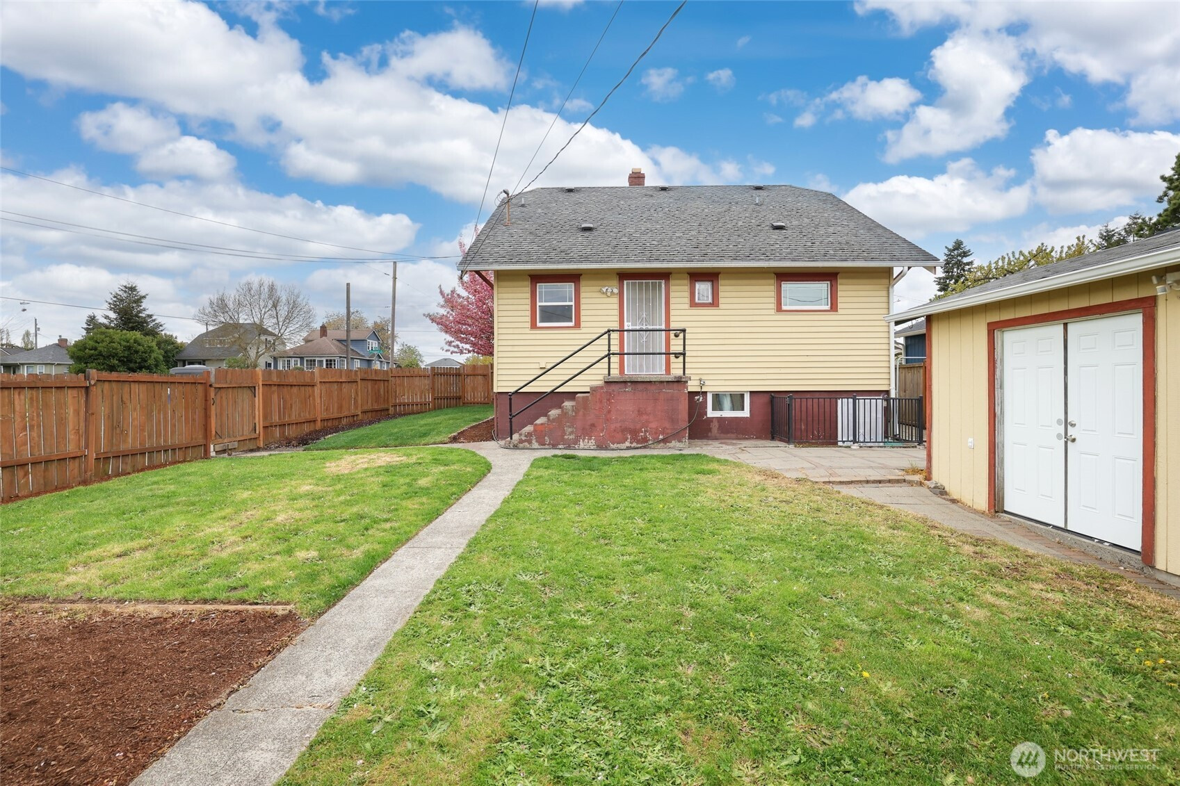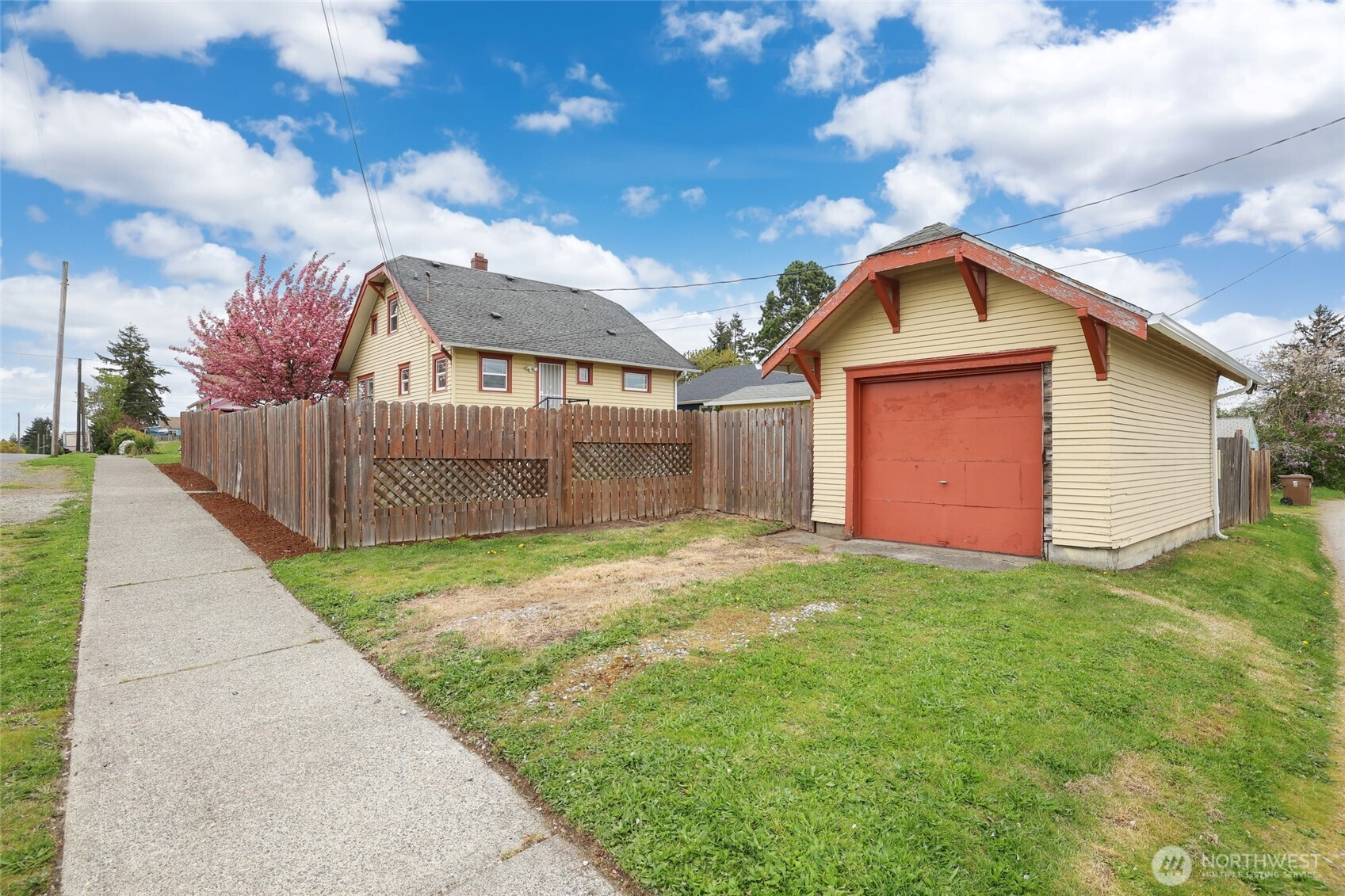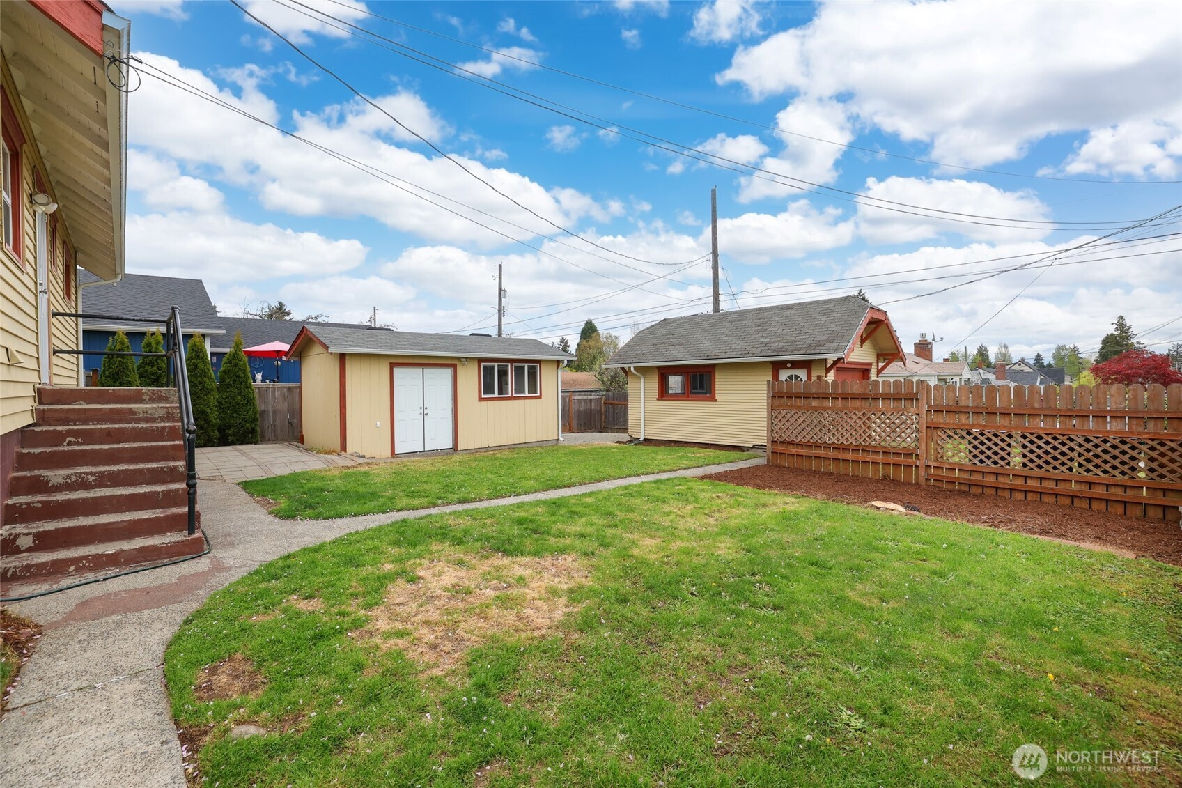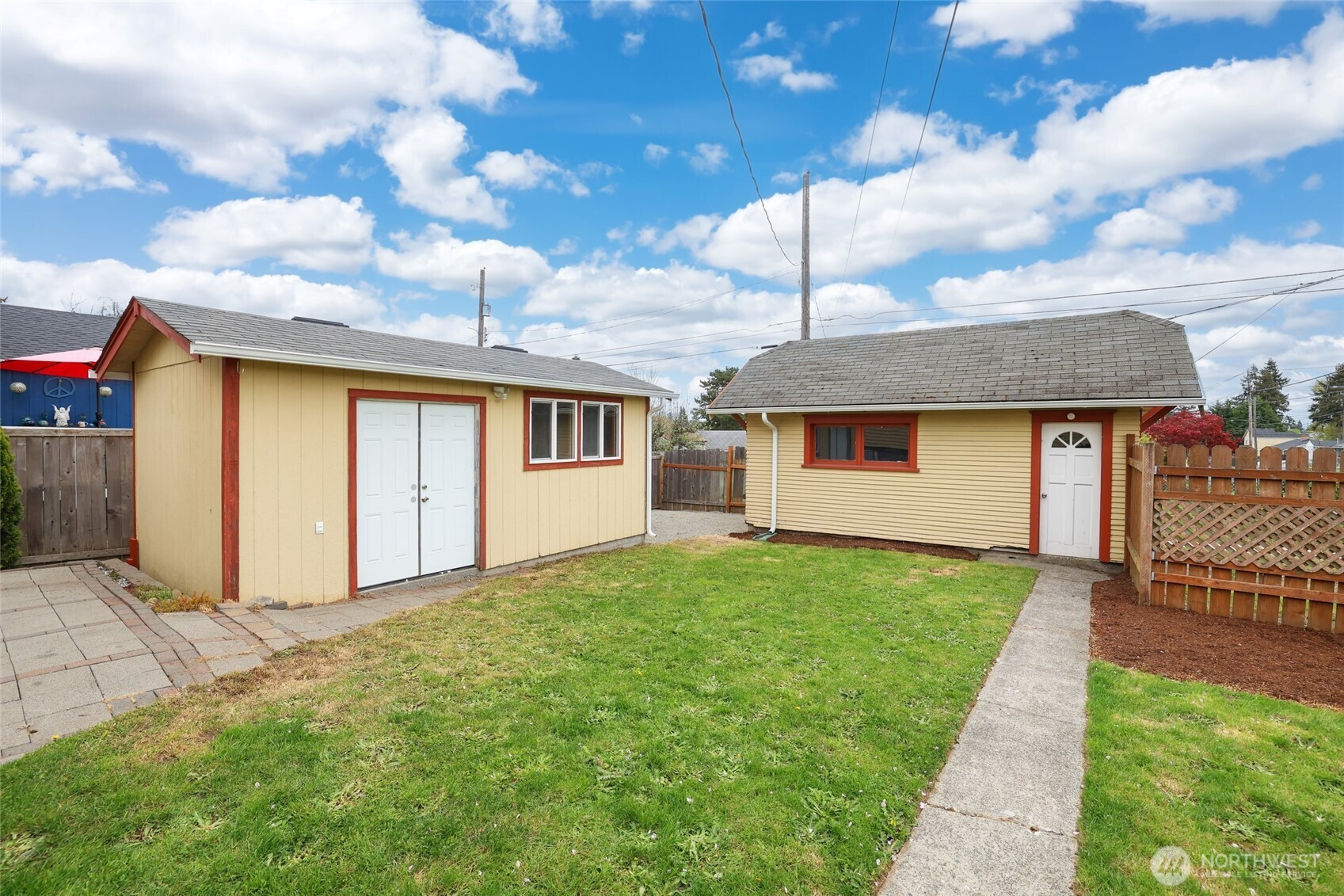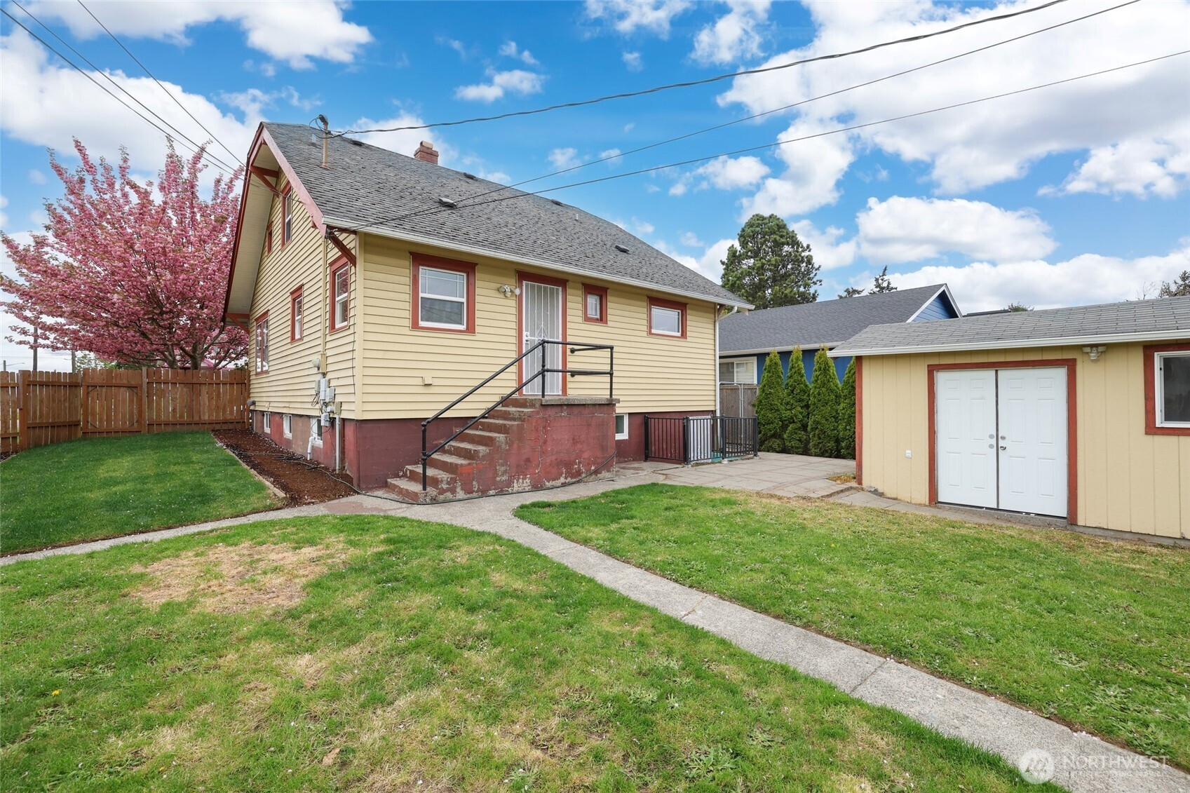 Classic Tacoma Craftsman charm packed with character, updates, and versatility. From the covered front porch with brick pillars and exposed rafter tails to the beautifully refinished oak hardwoods with herringbone inlay inside, this home celebrates its period architecture while delivering modern updates where they matter most. The remodeled kitchen features crisp white shaker cabinetry, sleek dark counters, stainless appliances, recessed lighting, & deep undermount sink. Updated bathrooms include a spa-inspired main bath with floor-to-ceiling subway tile, a fixed square showerhead plus handheld sprayer, soaking tub, & matte black fixtures. A gas stove on a decorative tile hearth anchors the sunlit living room, accented by coved ceilings, original millwork, & wood doors w/ period hardware. Upstairs offers generous bedrooms, a walk-in closet w/ original hook rail & soft dormer light. The lower level presents a fully functional ADU/MIL w/private exterior entrance, full kitchen, full bath, & its own laundry, built flexibility for multi-generational living arrangements or rental income potential. And the crown jewel: DOUBLE LOT with a fully fenced expansive lawn, detached garage/shop, bonus storage shed, & plenty of extra side parking for trailers, boats, or RVs—all framed by mature flowering cherry & Japanese maple. Historic character, modern updates, & outdoor space come together in one rare offering. Commuters' dream- Close to parks, ball fields, shopping, & the I-5 corridor.