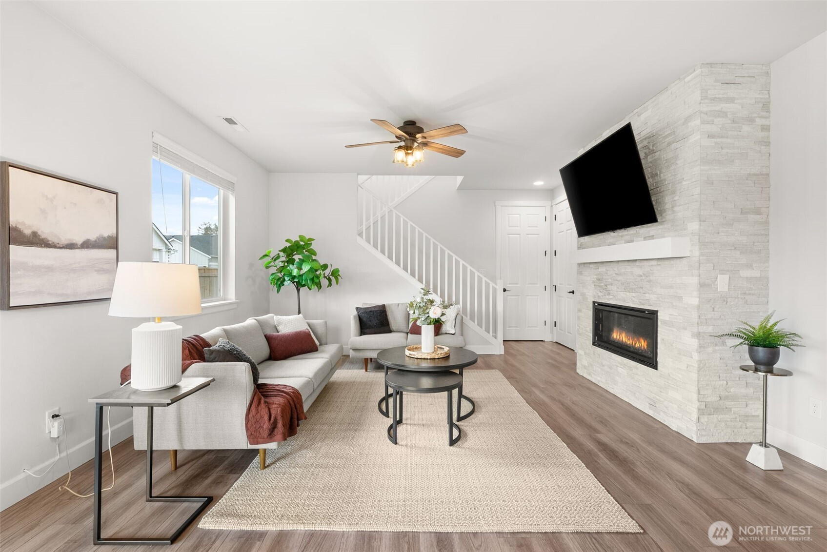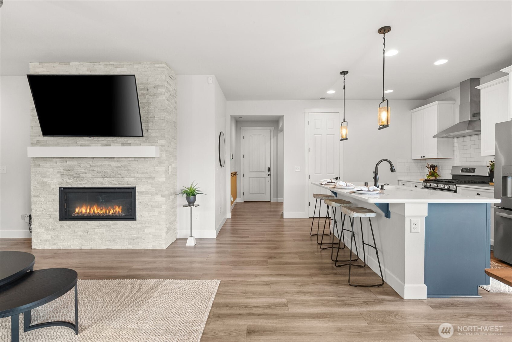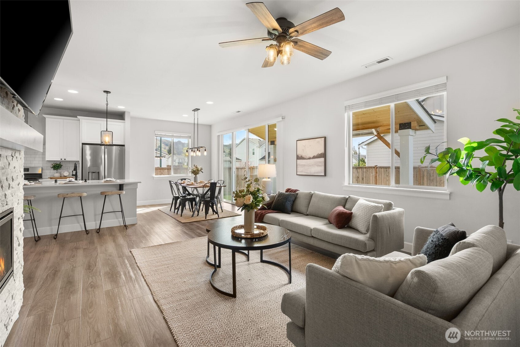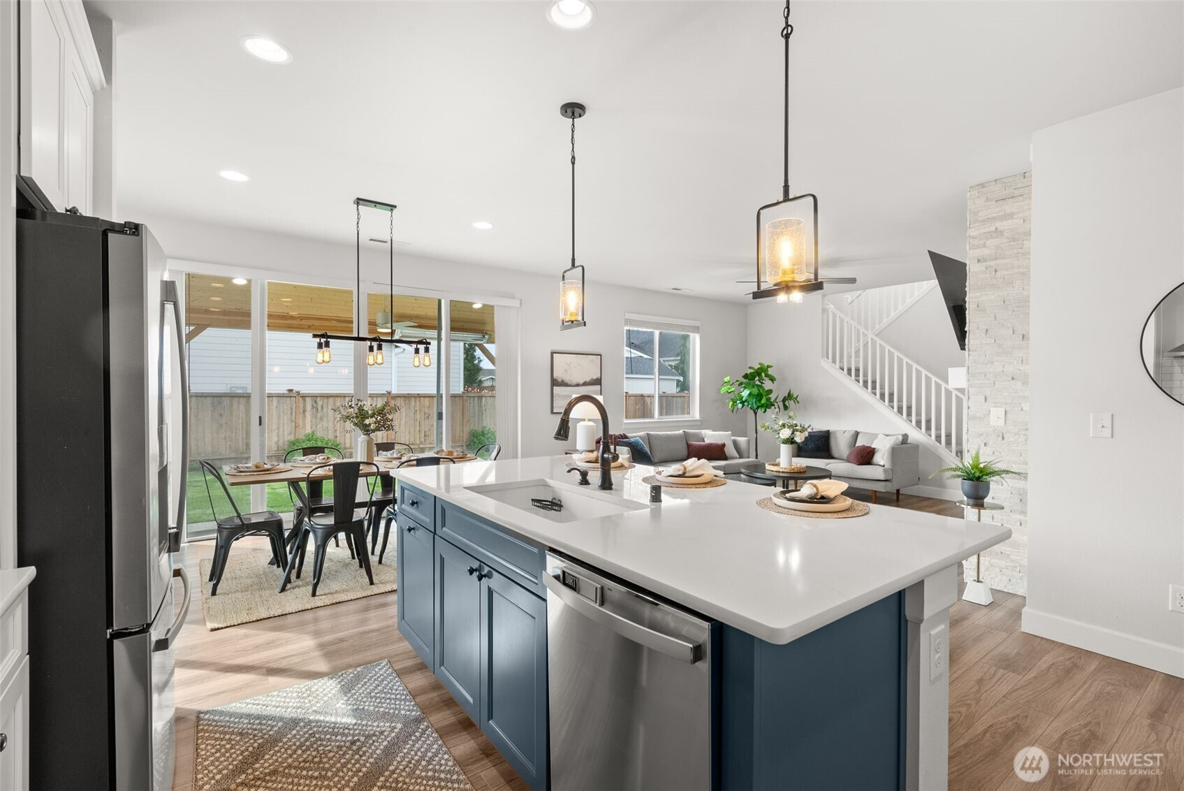 Better-than-new and beautifully appointed, this 2021-built home in Sumner offers the ideal blend of style, function, and outdoor living. Featuring 4 bedrooms with a highly desirable main-floor bedroom and adjacent ¾ bath, this layout is perfect for guests, multi-generational living, or a flexible home office space. The open-concept great room is anchored by a stunning floor-to-ceiling stone-wrapped fireplace, creating a warm and inviting focal point. The designer kitchen showcases striking two-tone cabinetry, quartz counters, stainless appliances, and a large island that opens seamlessly to the dining and living areas. Upstairs you’ll find two generously sized guest bedrooms served by a full bath, along with a spacious primary suite featuring a large walk-in shower, oversized closet, & pic-a-boo views of Mt Rainier. Step outside to enjoy the oversized covered patio complete with an outdoor heater and ceiling fan—perfect for year-round entertaining. Situated on a large corner lot with abundant garden space, lush lawn, and room to play. Enjoy a convenient Sumner location close to schools, parks, shopping, and commuter routes.