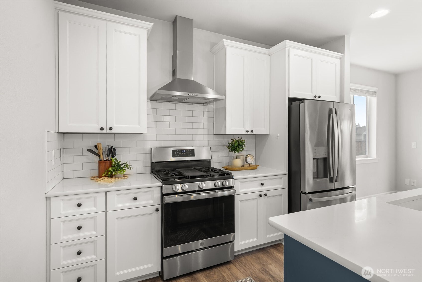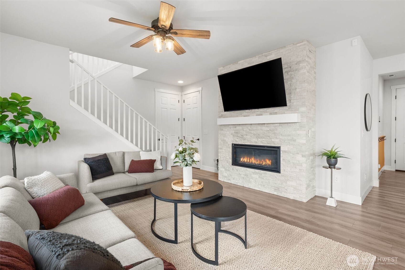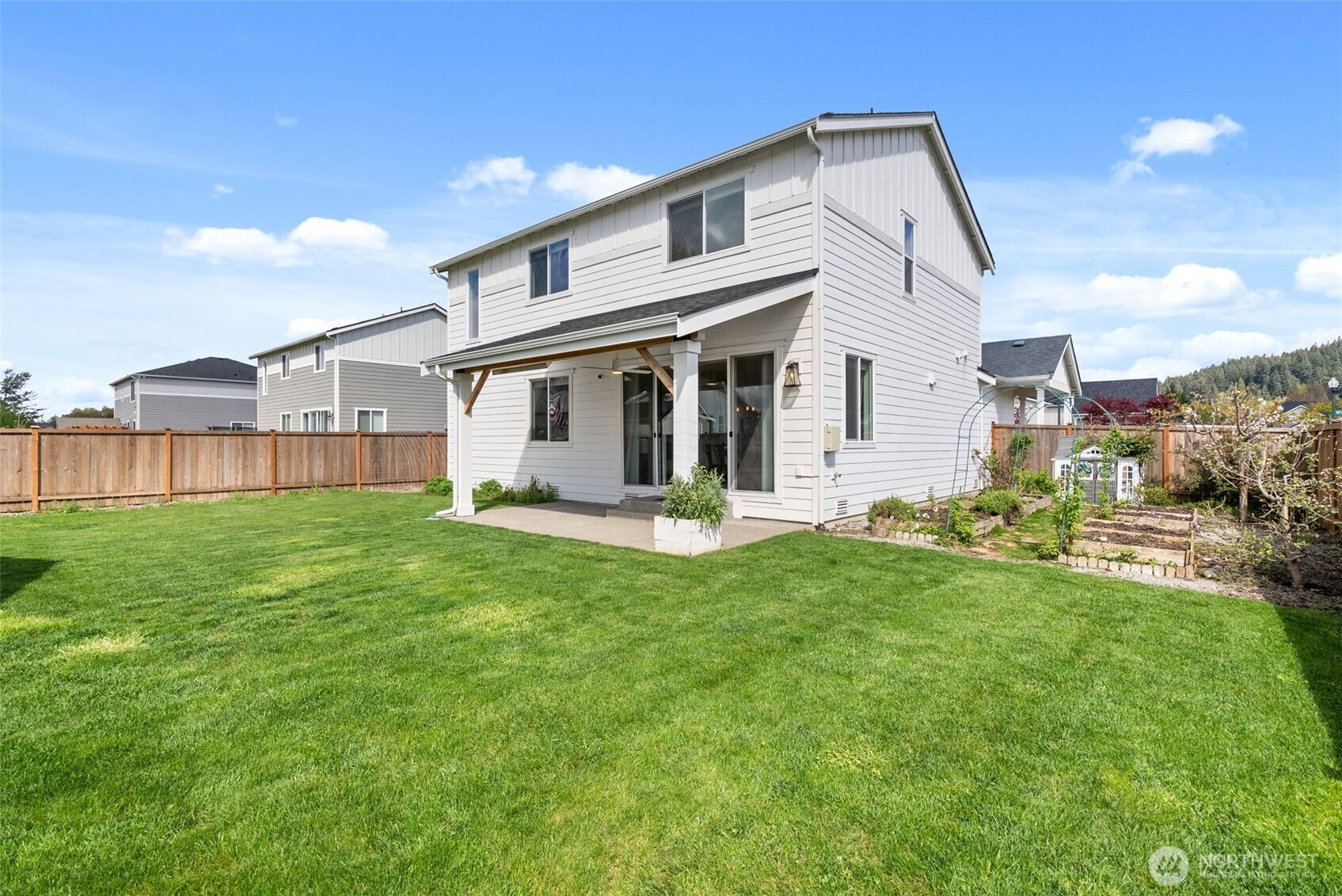 Better-than-new and beautifully appointed, this 2021-built home in Sumner offers the ideal blend of style, function, and outdoor living. Featuring 4 bedrooms with a highly desirable main-floor bedroom and adjacent ¾ bath, this layout is perfect for guests, multi-generational living, or a flexible home office space. The open-concept great room is anchored by a stunning floor-to-ceiling stone-wrapped fireplace, creating a warm and inviting focal point. The designer kitchen showcases striking two-tone cabinetry, quartz counters, stainless appliances, and a large island that opens seamlessly to the dining and living areas. Upstairs you’ll find two generously sized guest bedrooms served by a full bath, along with a spacious primary suite featuring a large walk-in shower, oversized closet, & pic-a-boo views of Mt Rainier. Step outside to enjoy the oversized covered patio complete with an outdoor heater and ceiling fan—perfect for year-round entertaining. Situated on a large corner lot with abundant garden space, lush lawn, and room to play. Enjoy a convenient Sumner location close to schools, parks, shopping, and commuter routes.