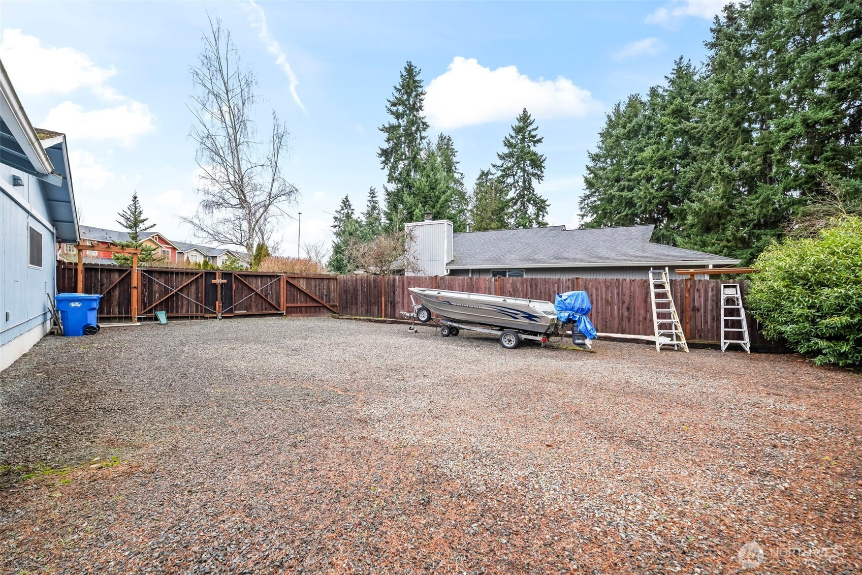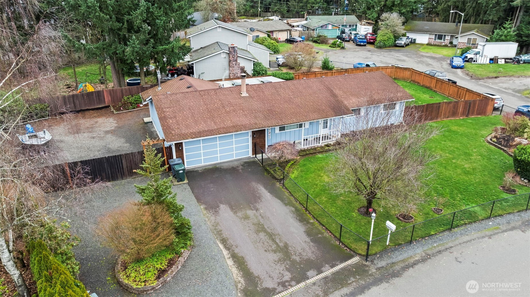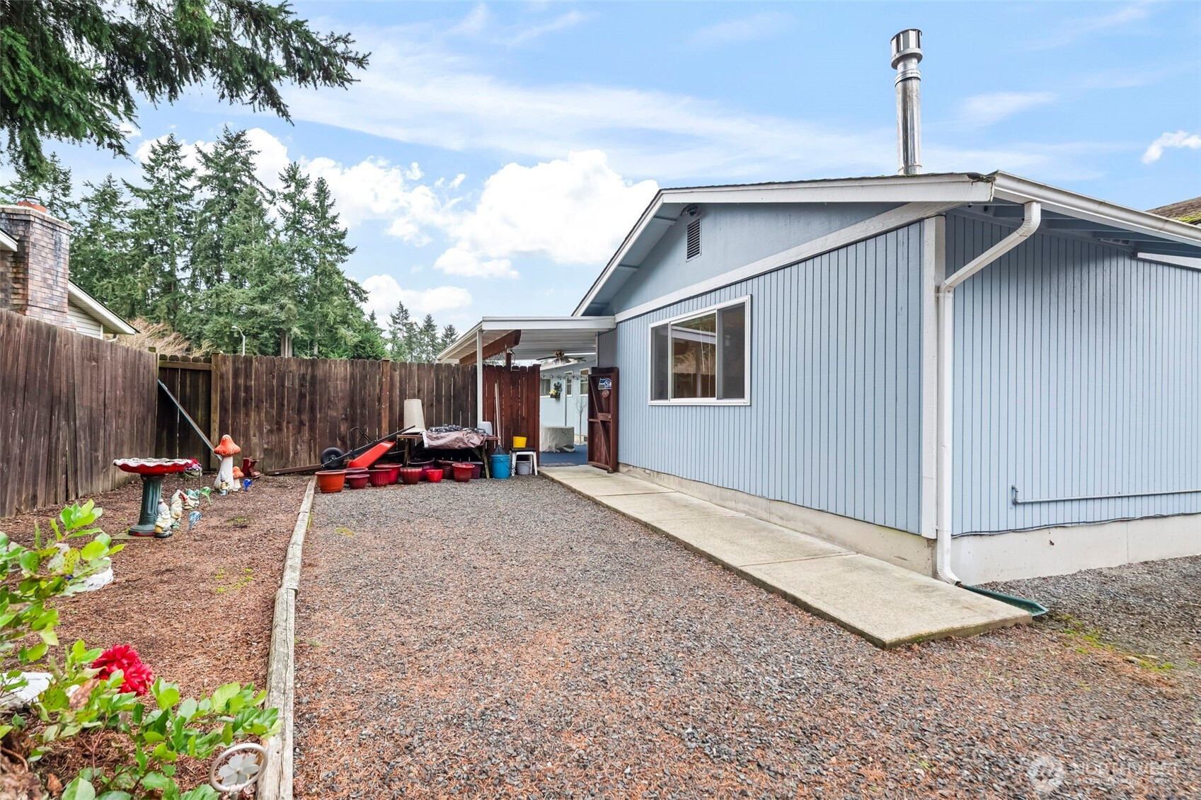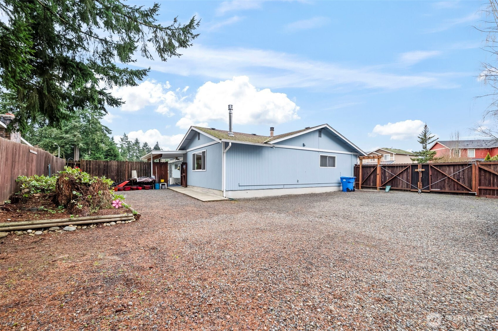 Looking for the single level home that has a large yard with extra space for RV storage, a place to put a boat, cars or side by sides, You name it this one has the enclosed space and gated. The property is fenced and landscaped beautifully. One step to the front door and you will be impressed with how lovingly maintained this home is with newer white blinds throughout and paint. Remodeled kitchen with white cabinets, granite and stainless appliances. The family room has a modern free standing gas stove that keeps you toasty. French doors out to the covered, enclosed patio area for year round enjoyment. The living room has a real wood fireplace, large bay window and the hallway that leads to the ample bedroom. minutes away from shopping, entertainment and recreation.