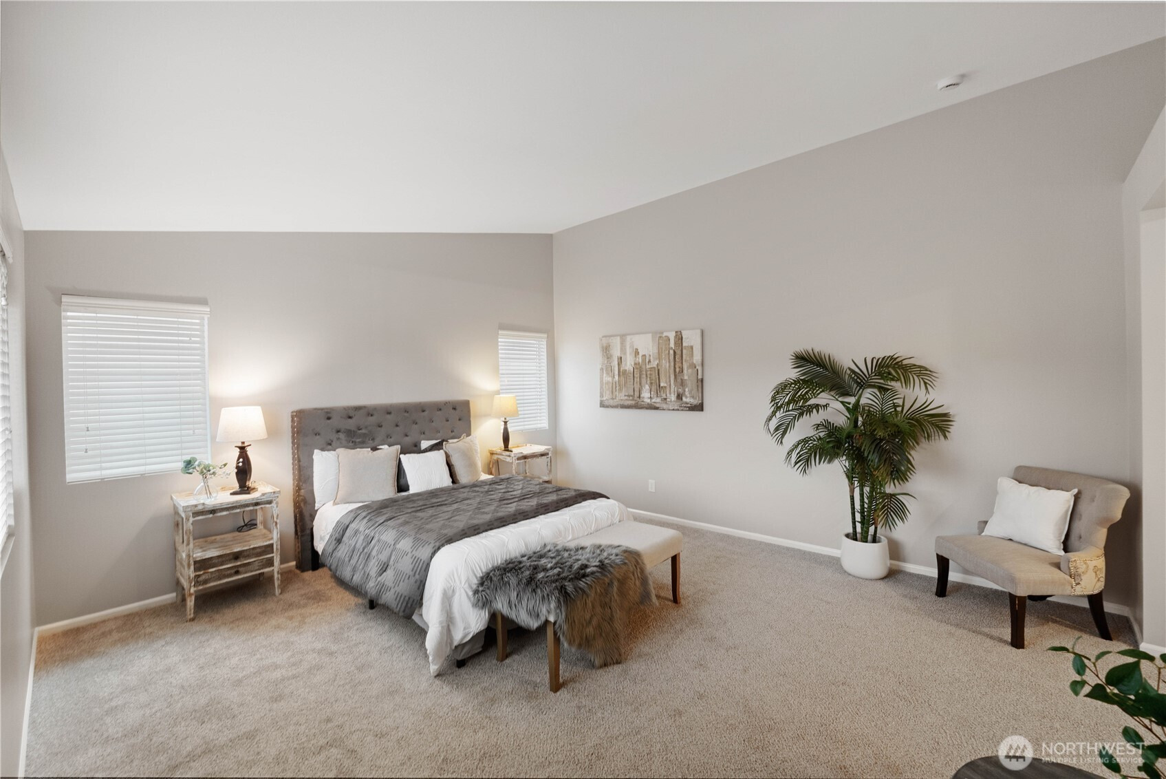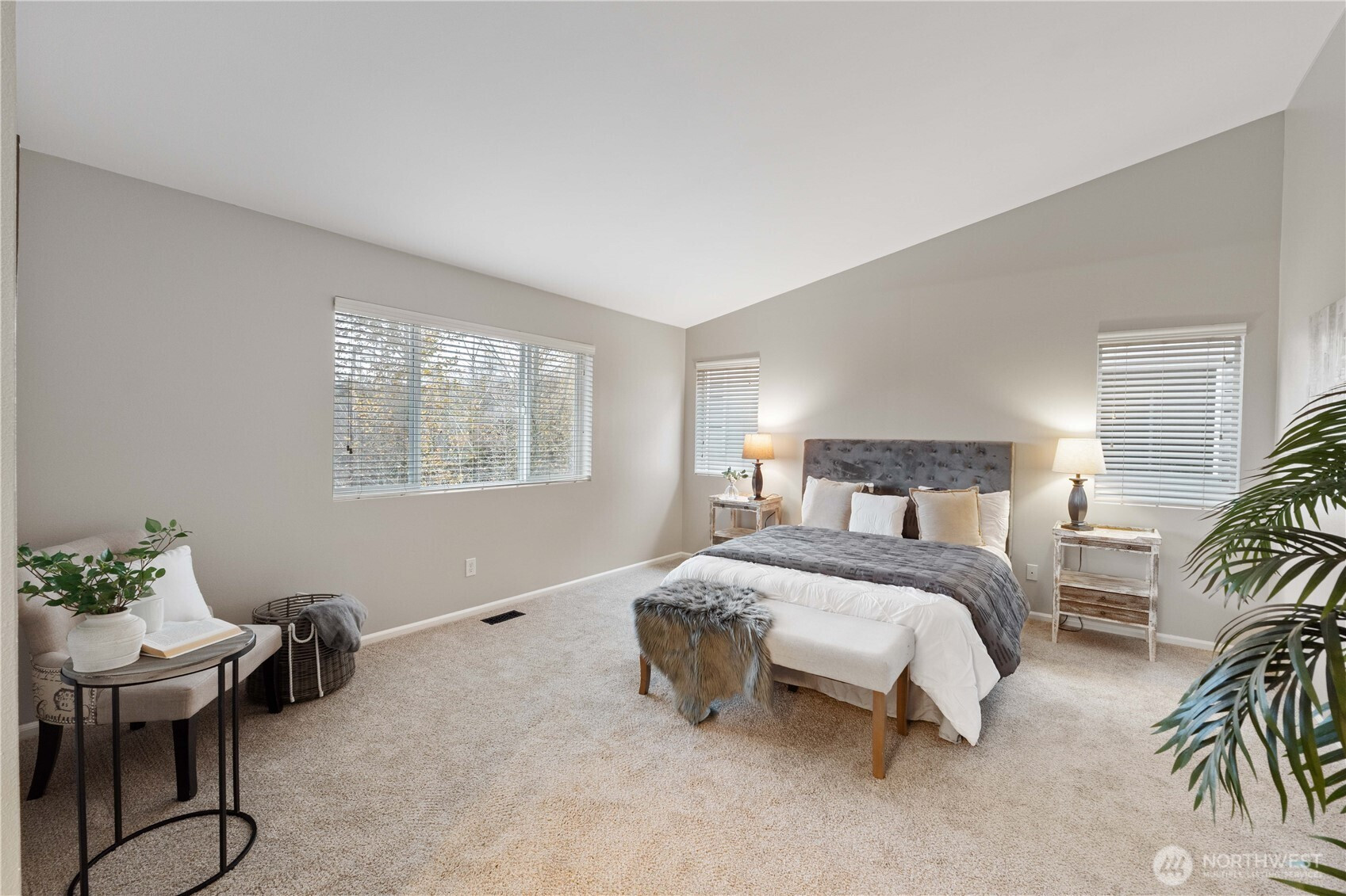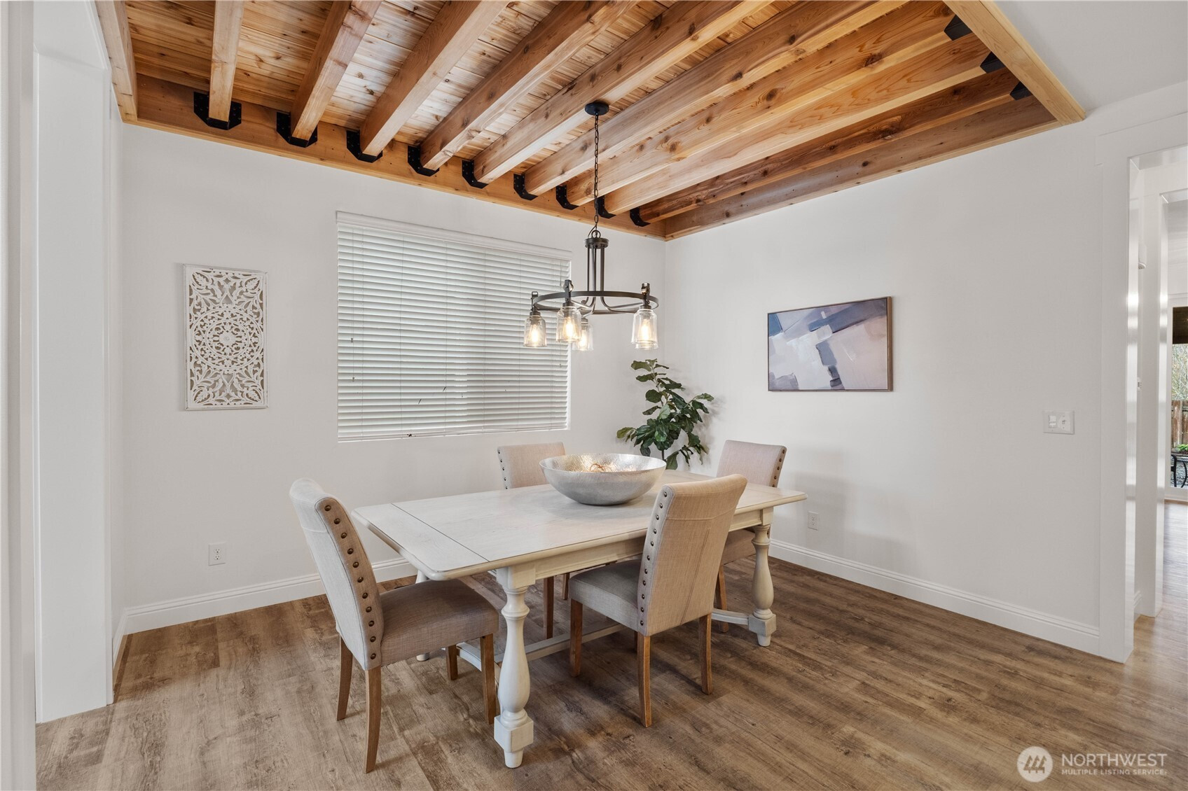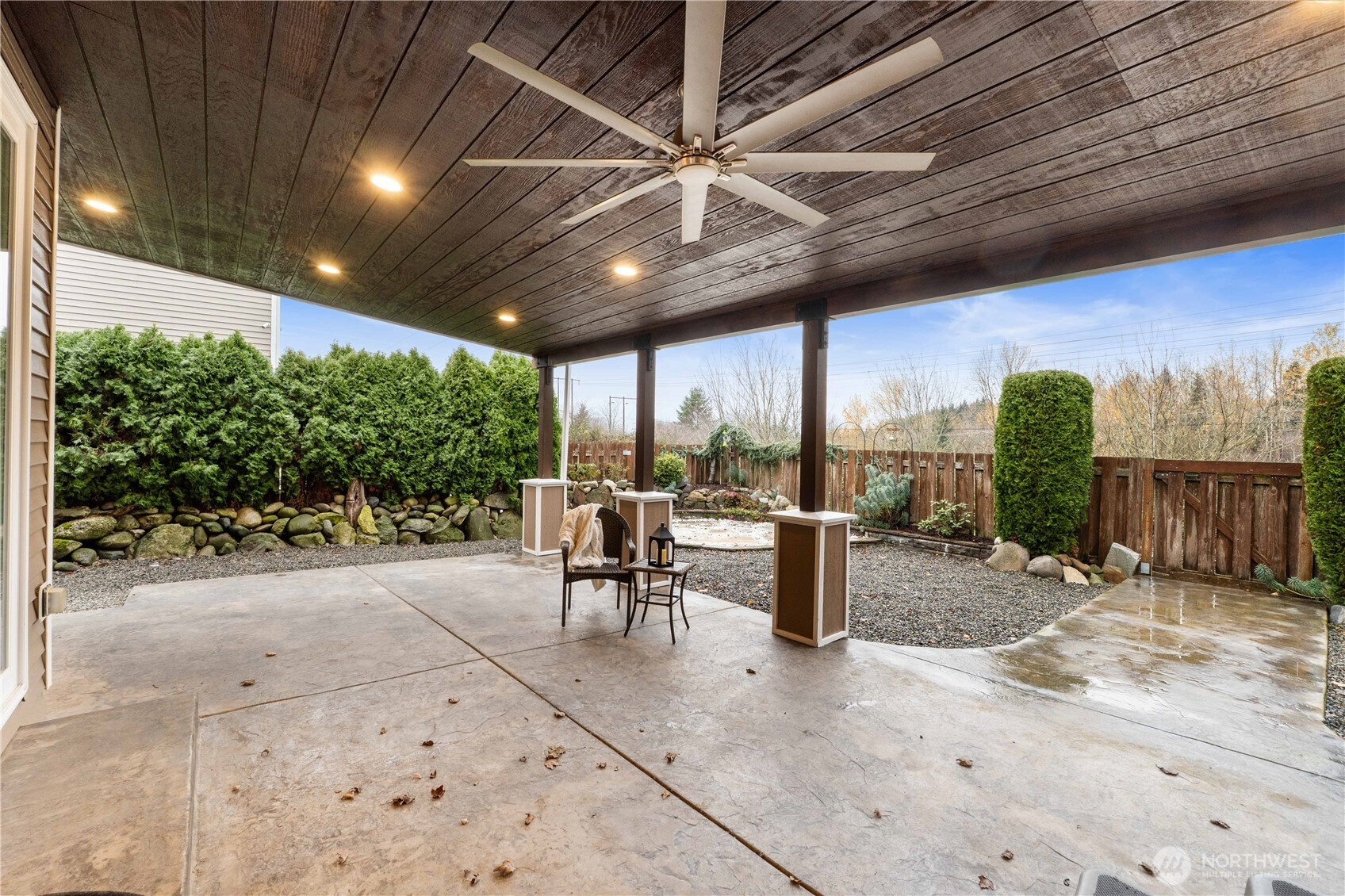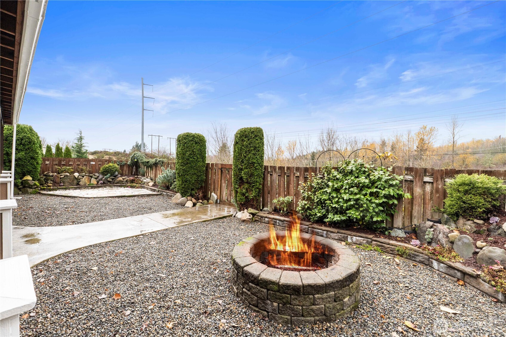 Move-in-ready home with top-shelf upgrades throughout. Covered porch welcomes you to a bright foyer, expands into the living room, featuring a vaulted ceiling with dormer windows. Designated dining room with wood coffered ceilings and a chandelier. The great room boasts a large kitchen with an island, an open dining space, and additional living space with a gas fireplace. A modern half bathroom and laundry room round out the first floor. Upstairs, you'll find an oversized primary suite with skillion ceilings, a walk-in closet, and a five-piece bathroom with a soaking tub. Two additional bedrooms and a bathroom down the hall. Do not miss this private backyard oasis, featuring a large covered patio, jacuzzi, and fire pit.