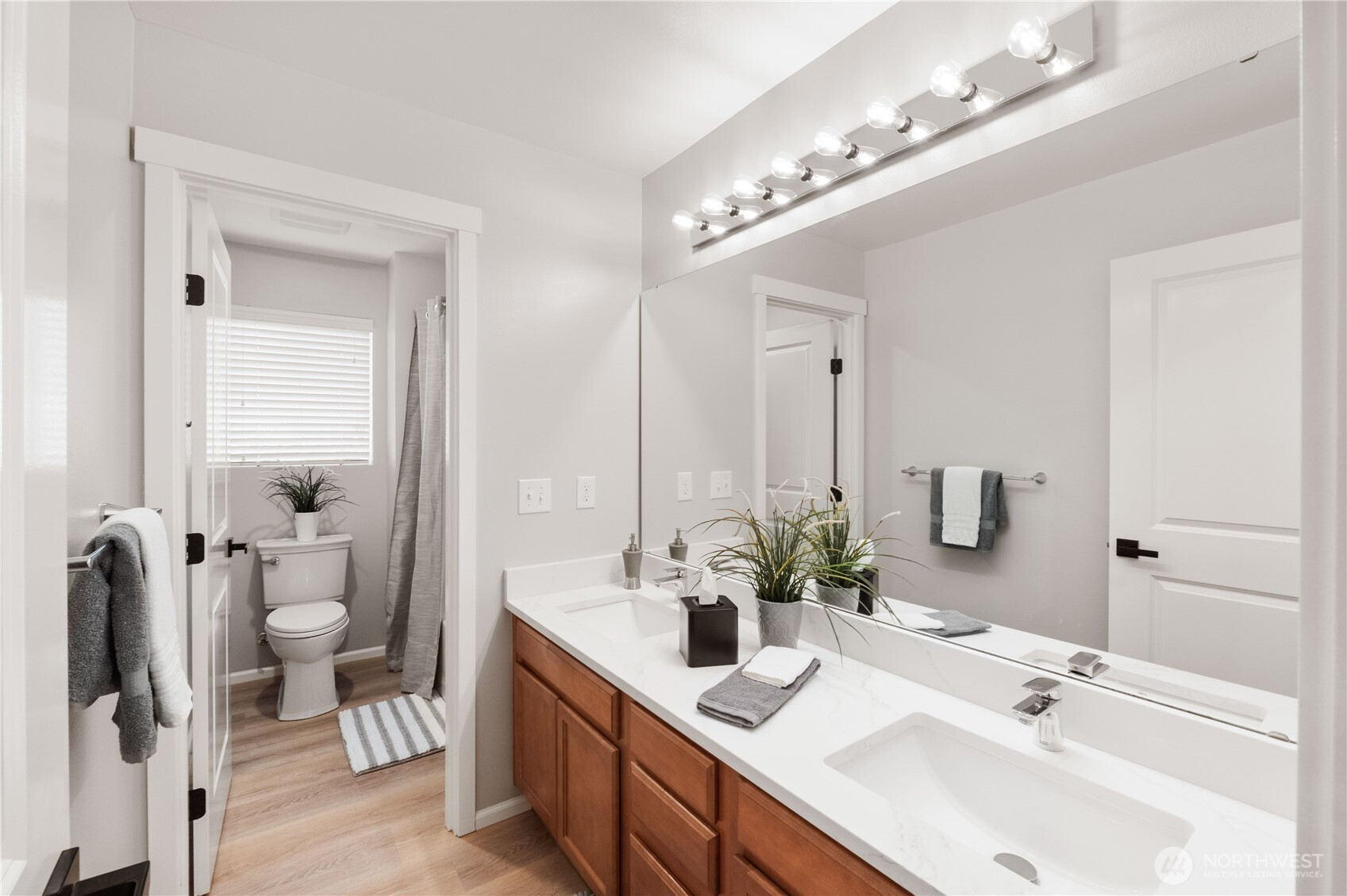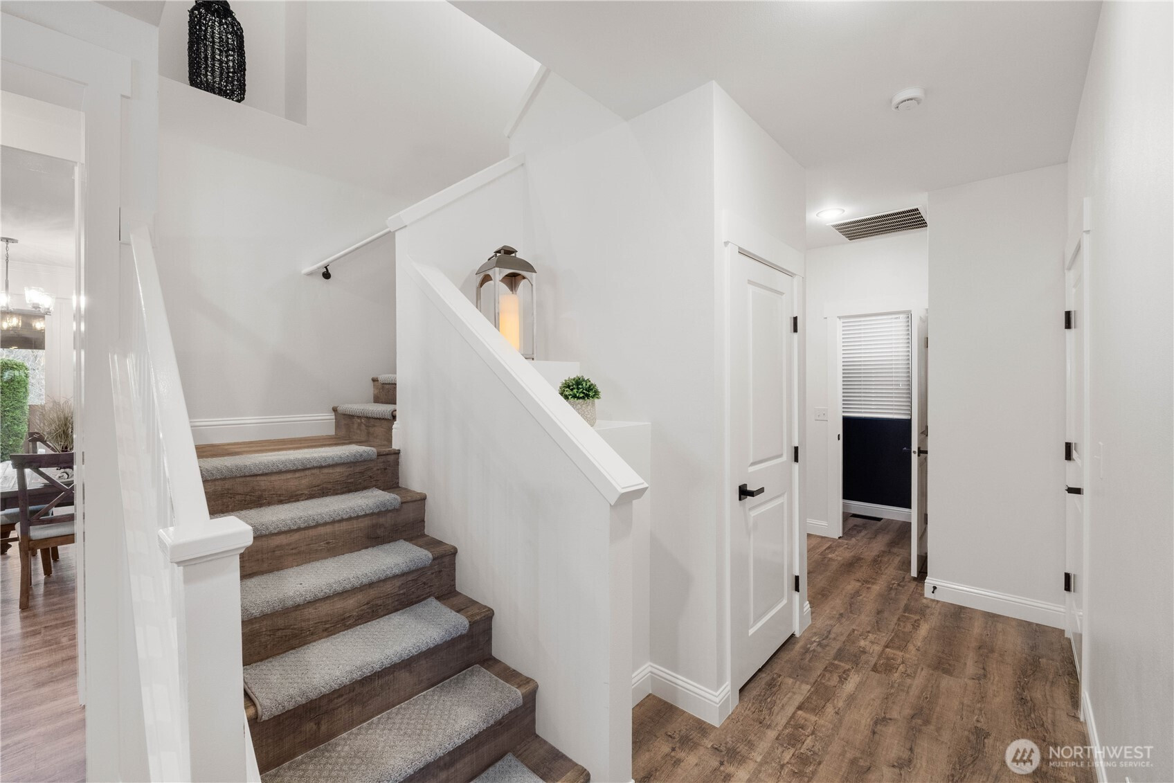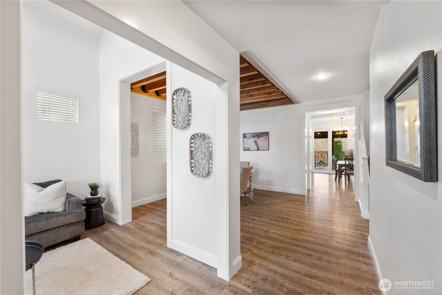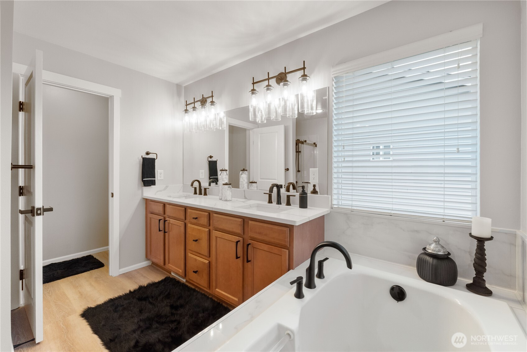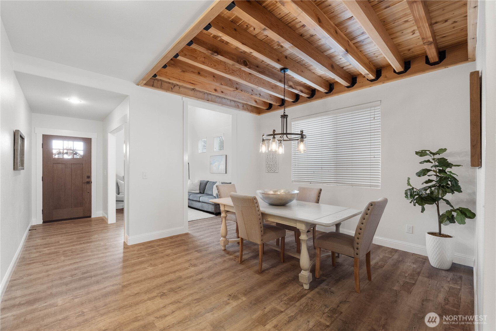 Move-in-ready home with top-shelf upgrades throughout. Covered porch welcomes you to a bright foyer, expands into the living room, featuring a vaulted ceiling with dormer windows. Designated dining room with wood coffered ceilings and a chandelier. The great room boasts a large kitchen with an island, an open dining space, and additional living space with a gas fireplace. A modern half bathroom and laundry room round out the first floor. Upstairs, you'll find an oversized primary suite with skillion ceilings, a walk-in closet, and a five-piece bathroom with a soaking tub. Two additional bedrooms and a bathroom down the hall. Do not miss this private backyard oasis, featuring a large covered patio, jacuzzi, and fire pit.