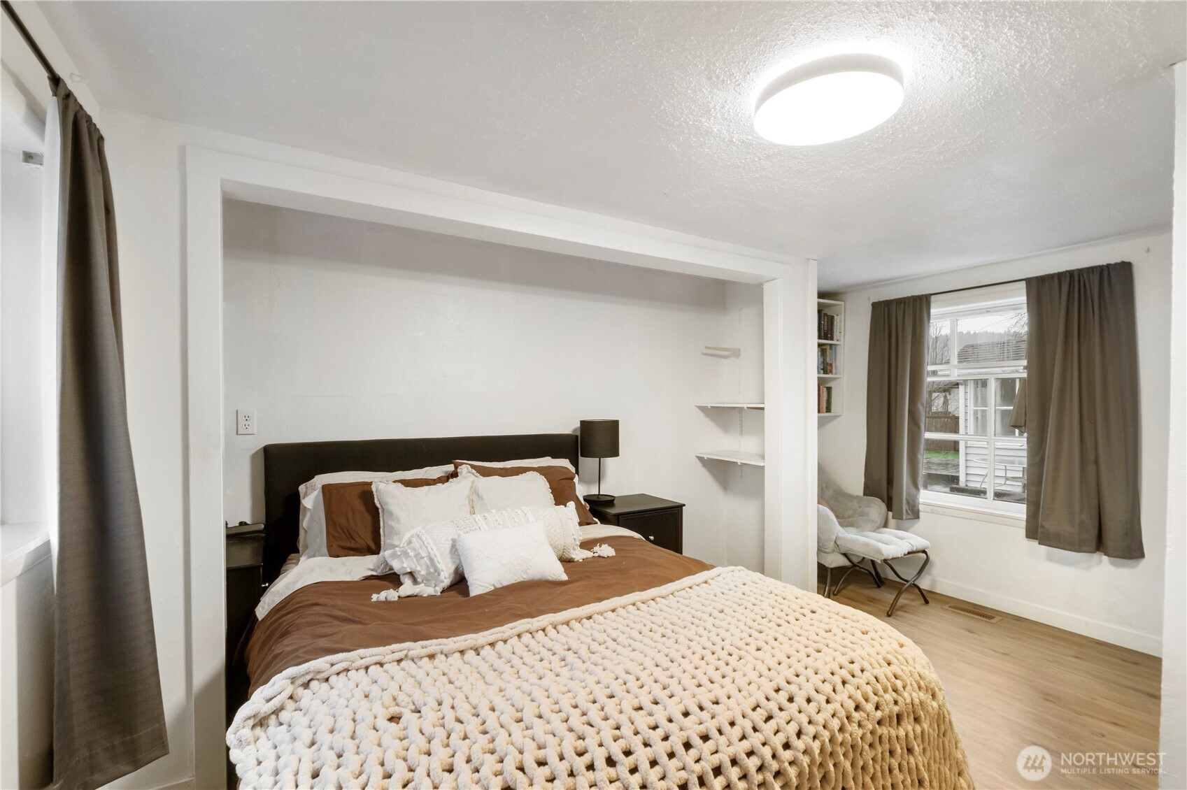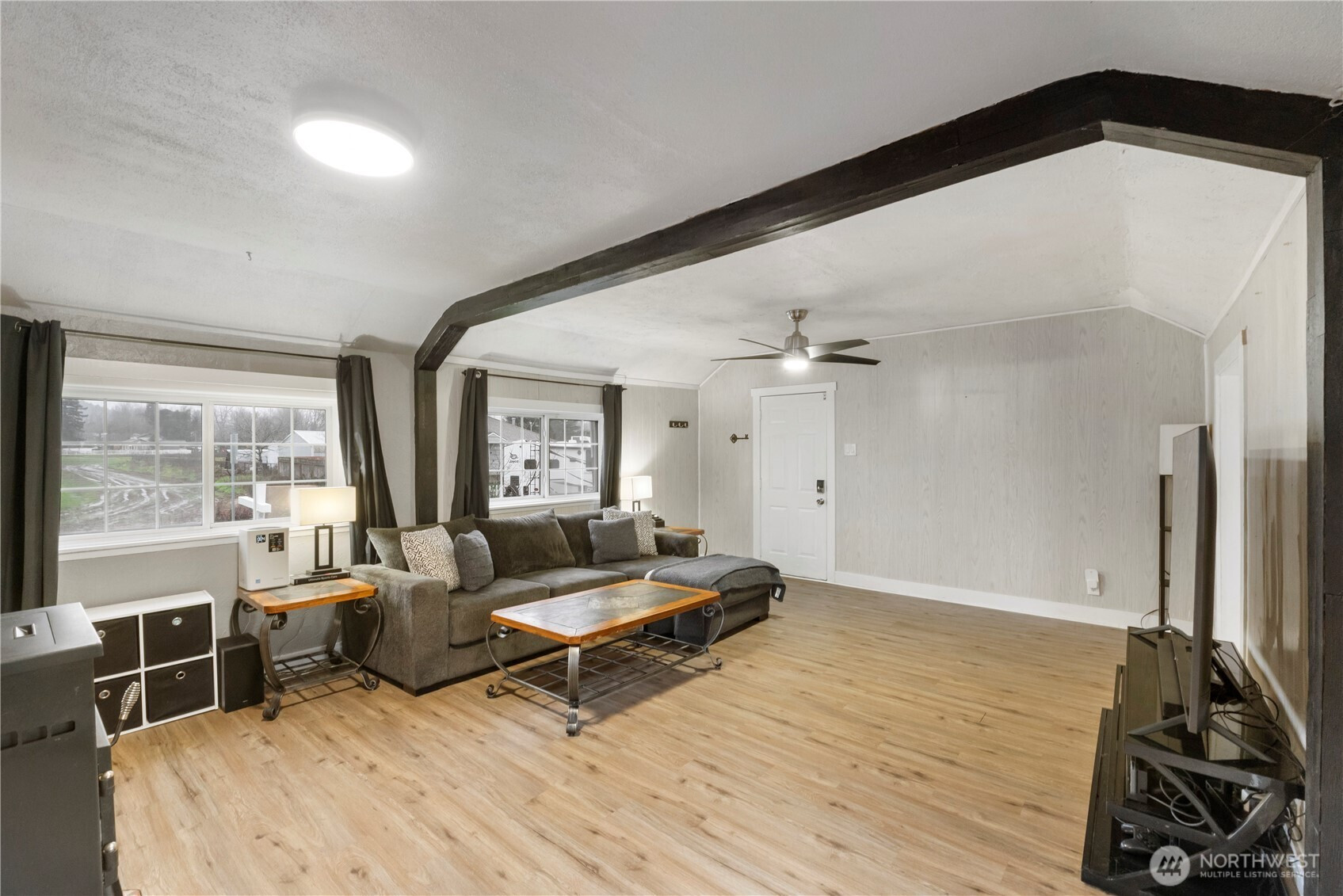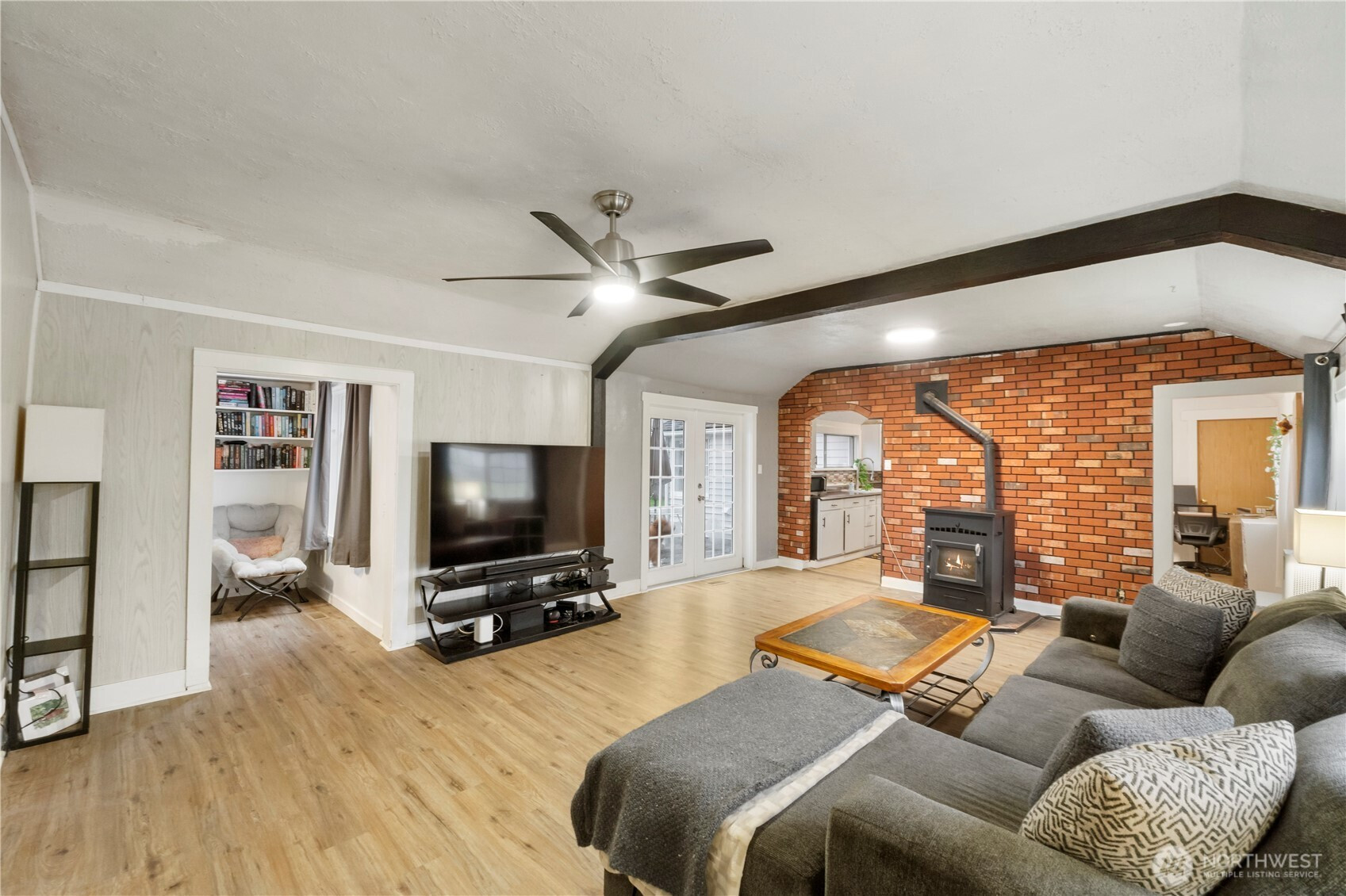 Tucked away on a private spacious lot, this charming Craftsman home with detached garage offers the perfect blend of space, seclusion, and convenience—just minutes from downtown Sumner shopping, dining, and amenities.Step through the foyer into a spacious open great room featuring arched ceilings, a cozy pellet stove, eye-catching brick accent wall, and beautiful light flooring. French doors open to the large back deck, creating an easy indoor-outdoor flow ideal for entertaining or relaxing in your own peaceful setting.The galley kitchen is designed for function and style with a farmhouse sink, generous prep space, and a window overlooking the expansive backyard. Full security system stays with the home!