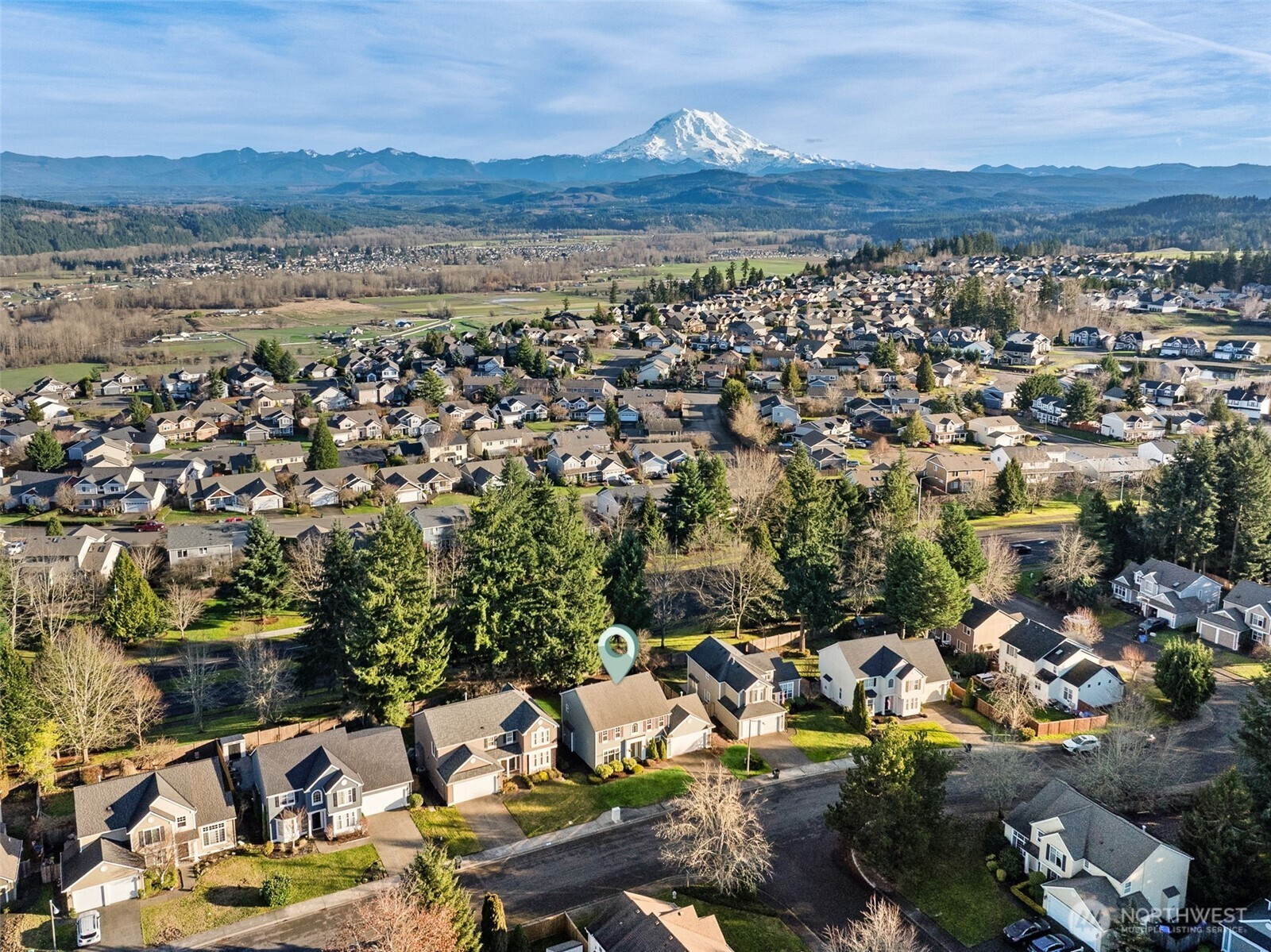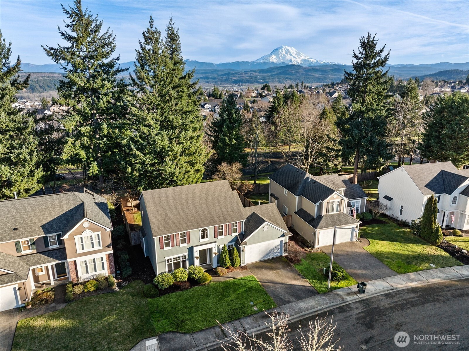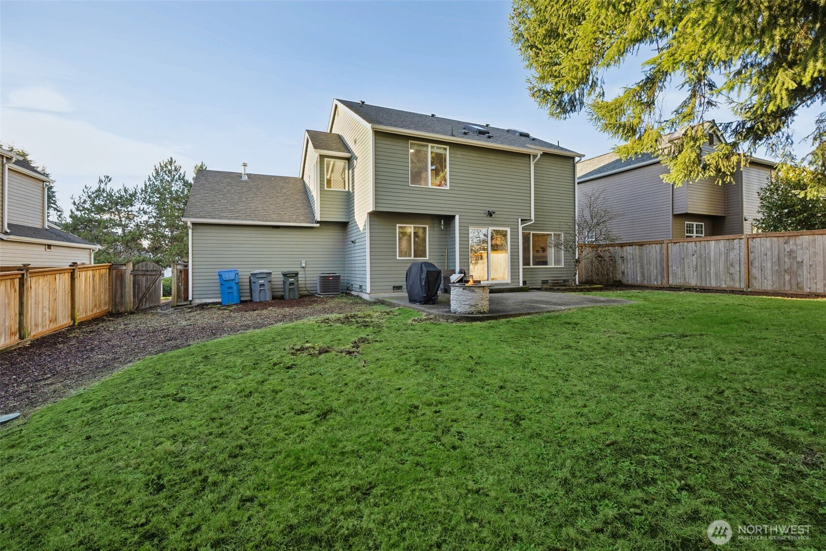 Welcome home to this beautifully maintained home in the desirable Sunrise Community backing to greenbelt! Fresh interior paint enhances the bright, functional floor plan. The main level features a formal dining room with a new light fixture, a dedicated office with French doors, and a spacious living room with a cozy gas fireplace and built-in storage. The kitchen offers laminate countertops, pantry, new kitchen faucet, and all appliances convey—including a newer refrigerator (2023). Utility room with newer W/D (2023) that convey. The second floor boasts 3 guest rooms, a full guest bath and a primary suite that impresses with vaulted ceilings, a walk-in closet, 3/4 bathroom, skylights, and abundant natural light. Additional highlights include A/C & 2-car garage with new garage motor! Enjoy a private, fully fenced backyard complete with sprinkler system, mature cherry tree, and firepit -perfect for relaxing or entertaining. The back fence was replaced approximately 3 years ago, with the side fence updated just 1 year ago. Enjoy low maintenance living with a common area maintained by the HOA and a community park conveniently located right across the street. Puyallup School District!