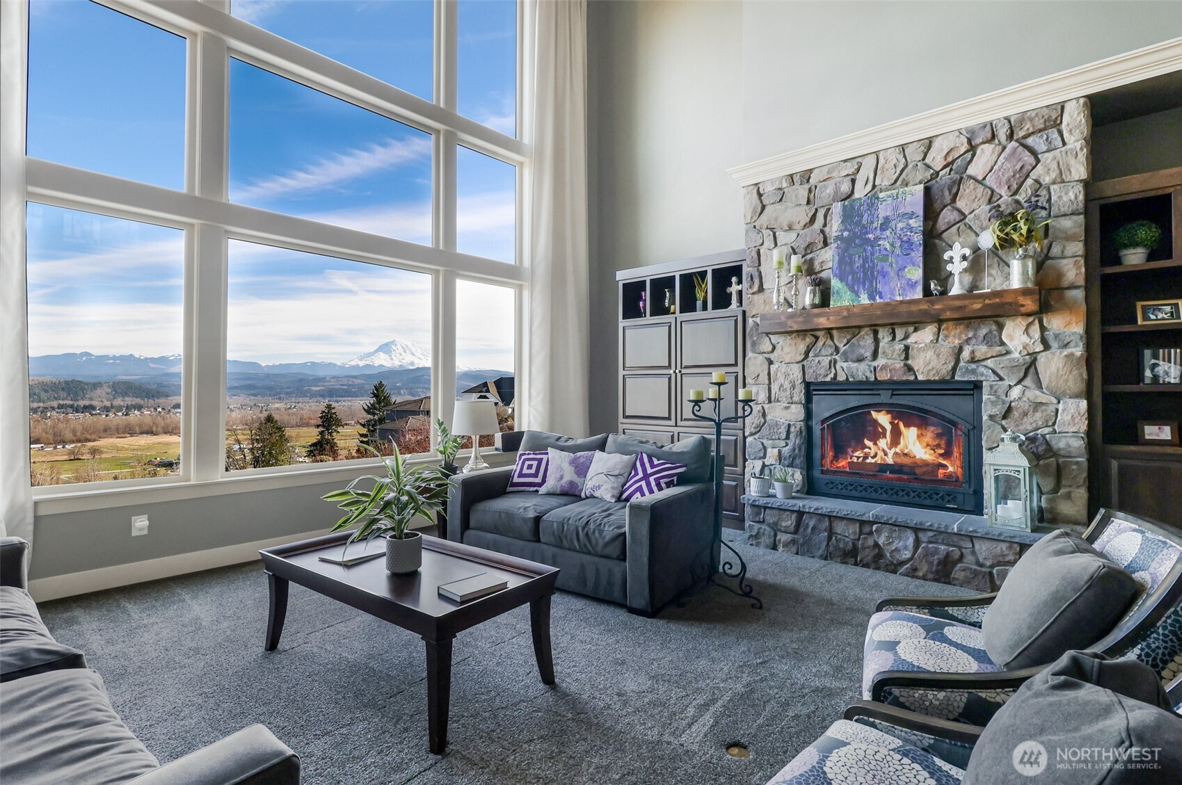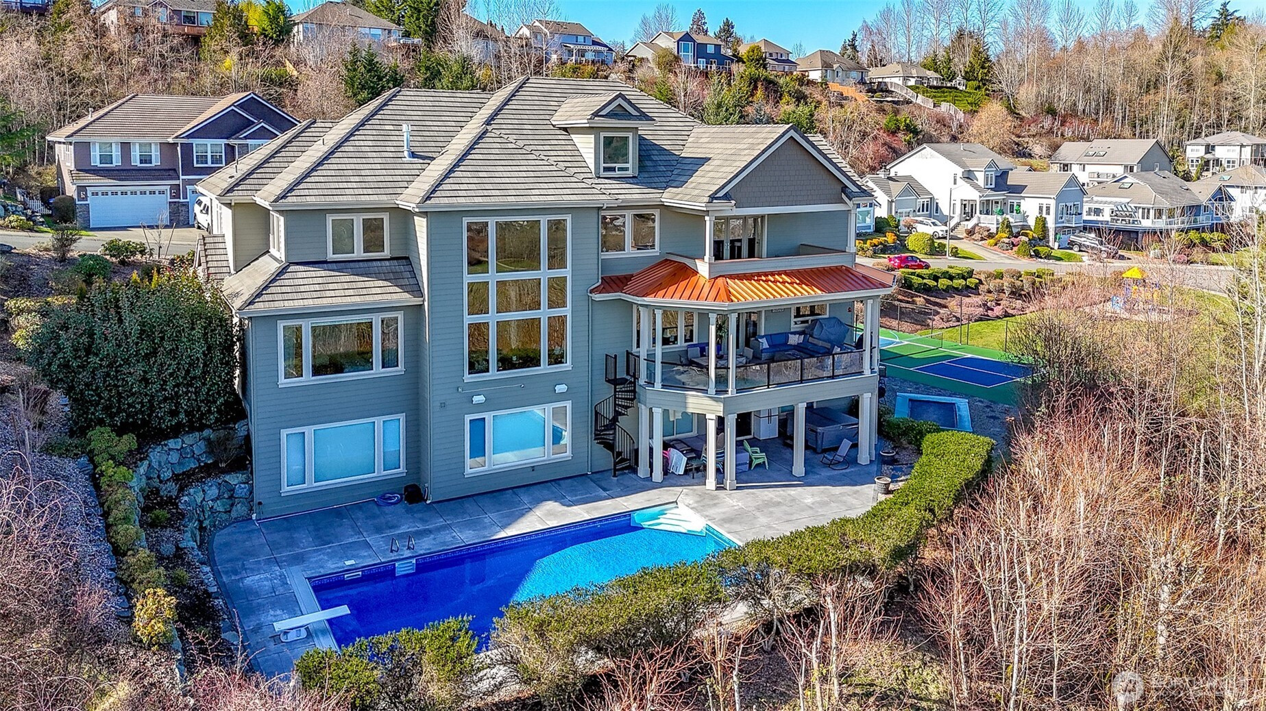 The Crown Jewel of Morning View Estates at Sunrise, an extraordinary estate offering immense size and quality for refined living with unobstructed 4 level views of Mt Rainier. 7 bdrms & 6 bths along with expansive living areas on all levels, a home designed for everyday living and large-scale entertaining. 20ft ceilings and walls of windows that frame the mountain and fill the home with natural light. Chef’s dream kitchen featuring a bespoke appliance ensemble, integrated hood vent, extensive custom cabinetry, generous prep space, and a massive walk-in pantry. Designed for both beauty and performance, presents a seamless flow into the many gathering spaces. A lux main-level primary delivers scale and comfort, beautifully appointed, spa-inspired ensuite bath like no other. Orchestral provision of flexibility for guests, multi-gen living, or work-from-home needs, met with a full office on the lower level. Entertainment spread over multiple living areas in the home and a dedicated movie theater gaming spot, with a kitchenette-perfect for movie and party nights. Quality craftsmanship is evident throughout with extensive millwork, plank/shingle siding, & a long-lasting tile roof. Brand-new HVAC and Tesla PowerShare. A spacious 3-car garage completes the home. With an in-ground pool, pickleball court, built-in tramp, and 3 view soaked covered outdoor spaces to take in all the territorial and Mt views. Homes of this scale, quality, and view are rare at best.