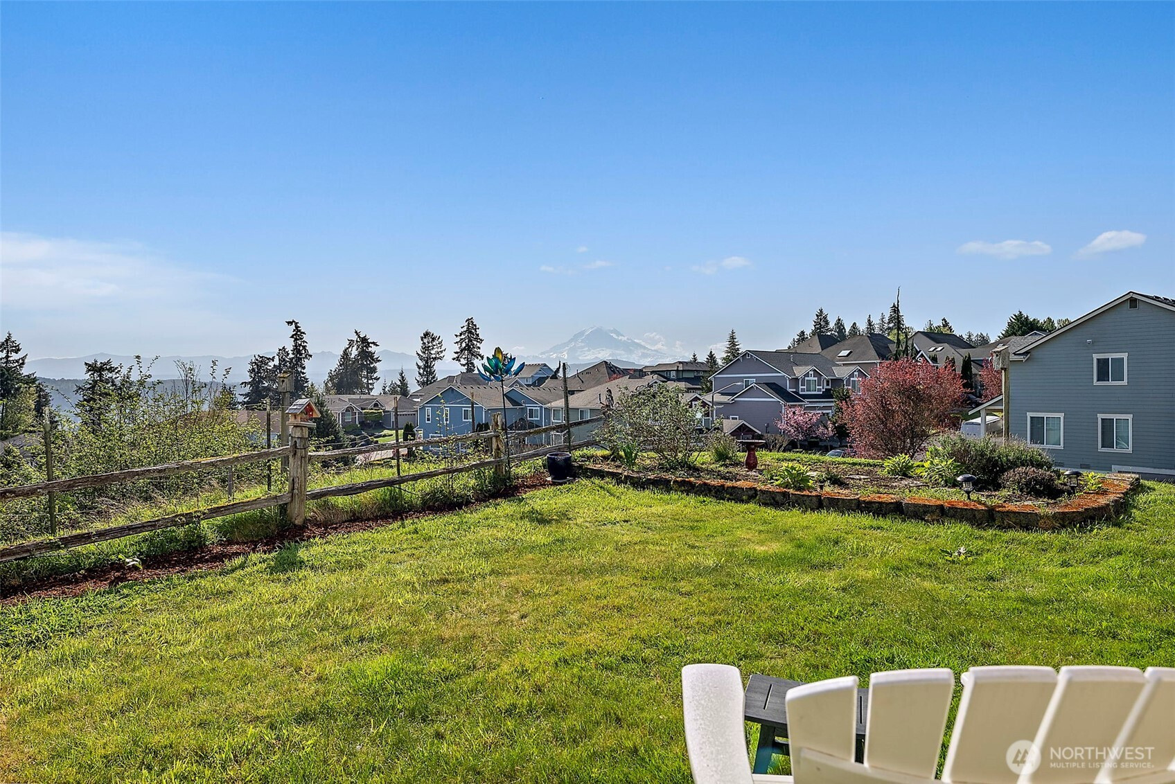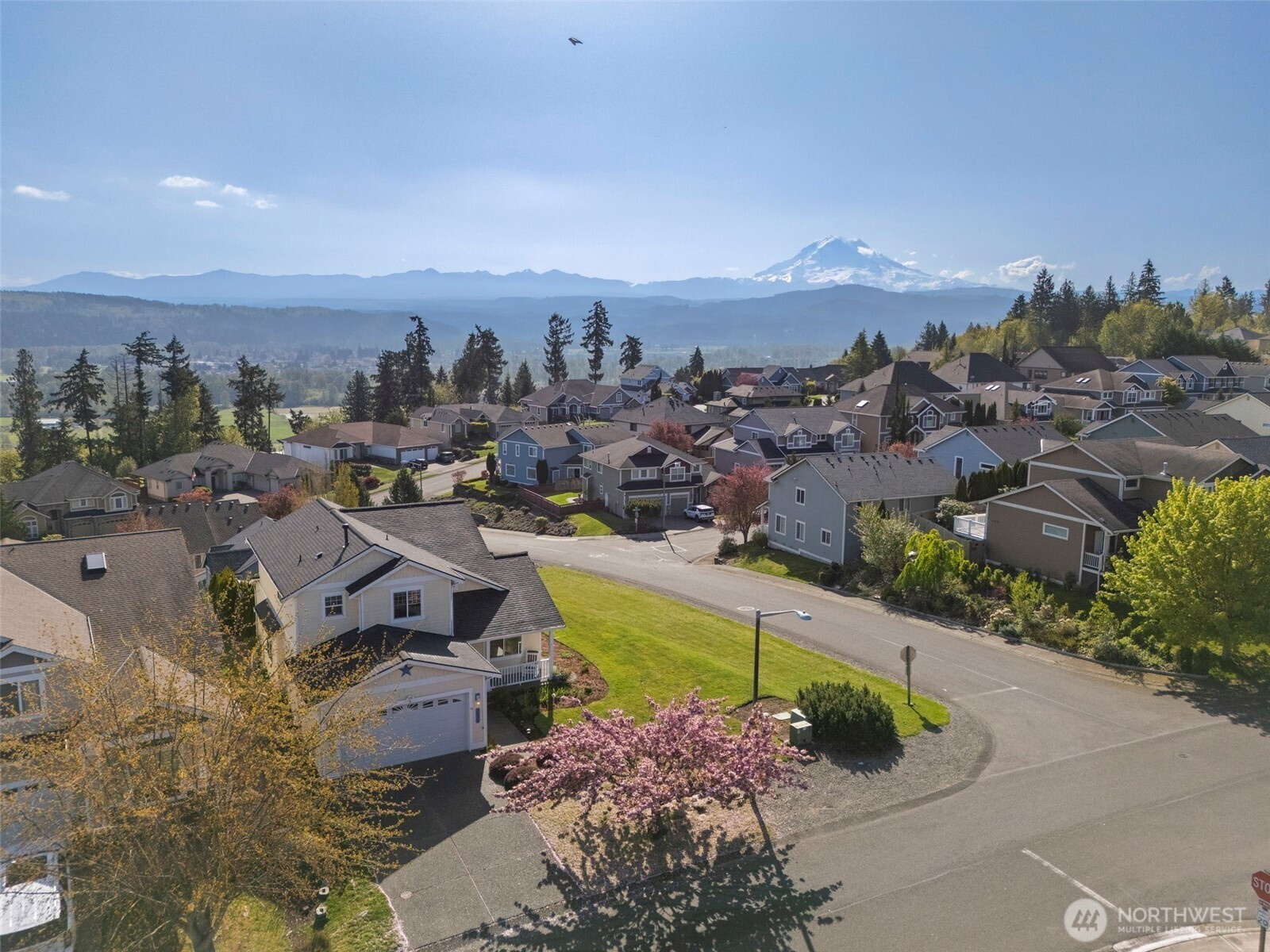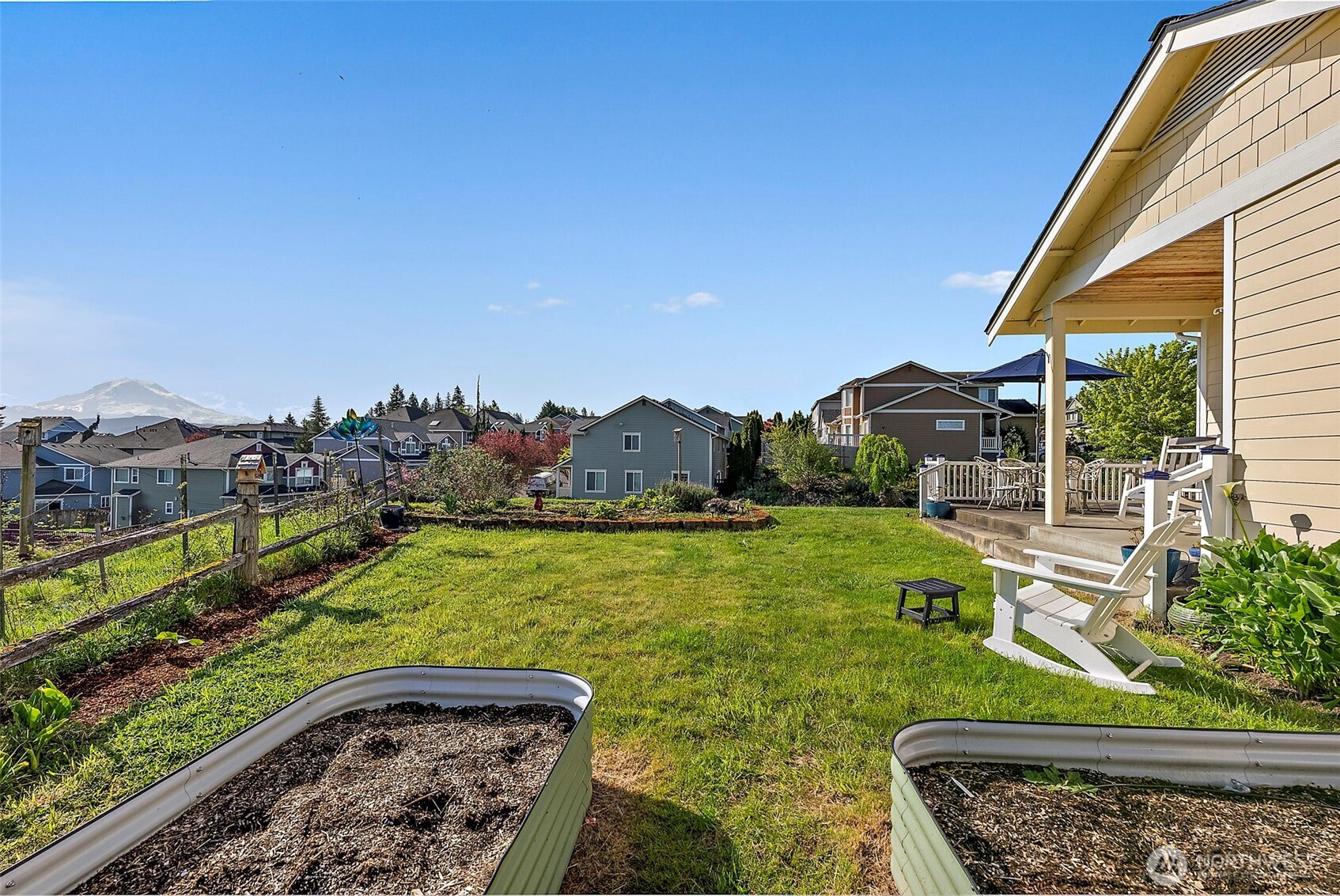 Beautiful home in the sought-after MorningView community, perfectly positioned on a spacious corner lot with stunning Mt. Rainier views from several rooms! Capture the sun rising over the mountain and valley from the windows overlooking the backyard. Step onto the covered patio and take in the scenery that makes your backyard feel like it stretches endlessly into the horizon. Inside, you’ll find 4 generously sized bedrooms, a private primary bath, and two separate living spaces—offering flexibility and room to truly spread out. Hardwood floors and updated light fixtures compliment the space. The kitchen is designed for both function and style, featuring abundant cabinetry, expansive counter space, stainless steel appliances, Quartz counter-tops, PLUS a double oven to make cooking and entertaining effortless. Everyday moments feel elevated as you take in the views from the charming farmhouse sink. The spacious primary suite is a true retreat, complete with a relaxing soaking tub and picture-perfect views of Mt. Rainier. For those with a green thumb, the backyard garden space is something special—bathed in ideal natural light and ready to thrive. Located just minutes from top-rated schools, parks, shopping, and major commuter routes, this home offers the perfect balance of convenience, comfort, and lifestyle—everything you’ve been searching for. Schedule a showing today! Did we mention the VIEW!!!