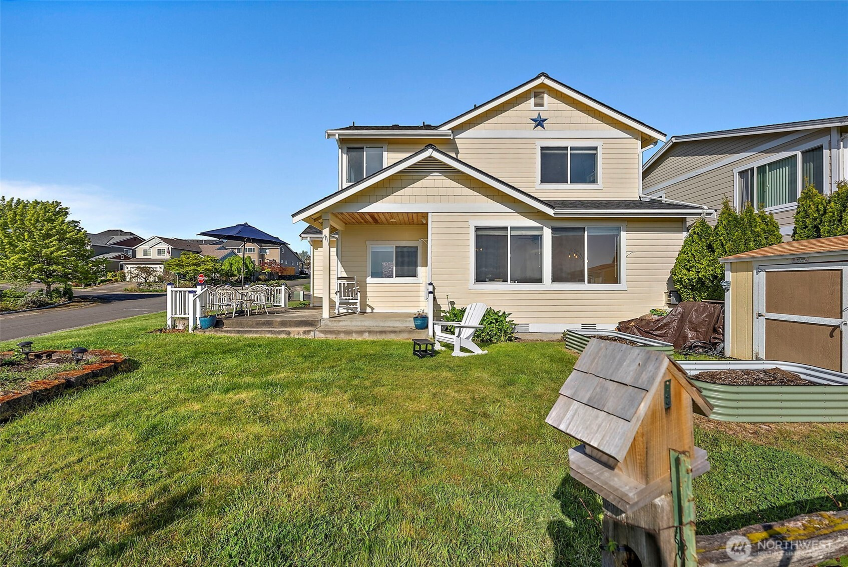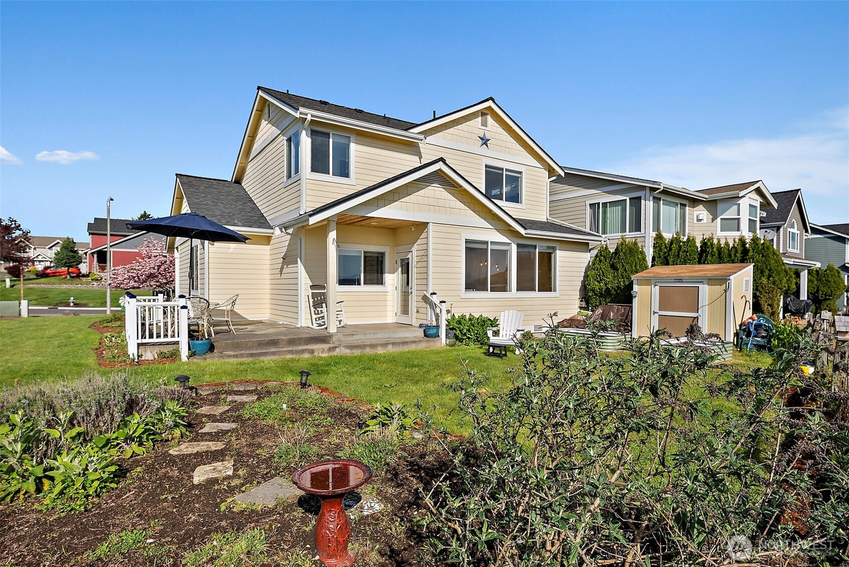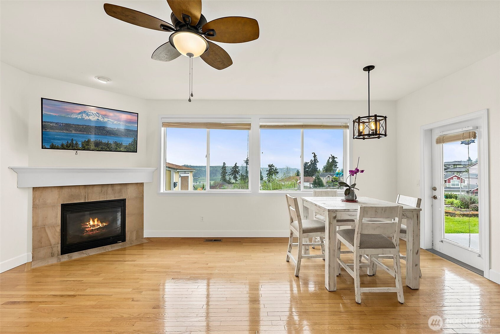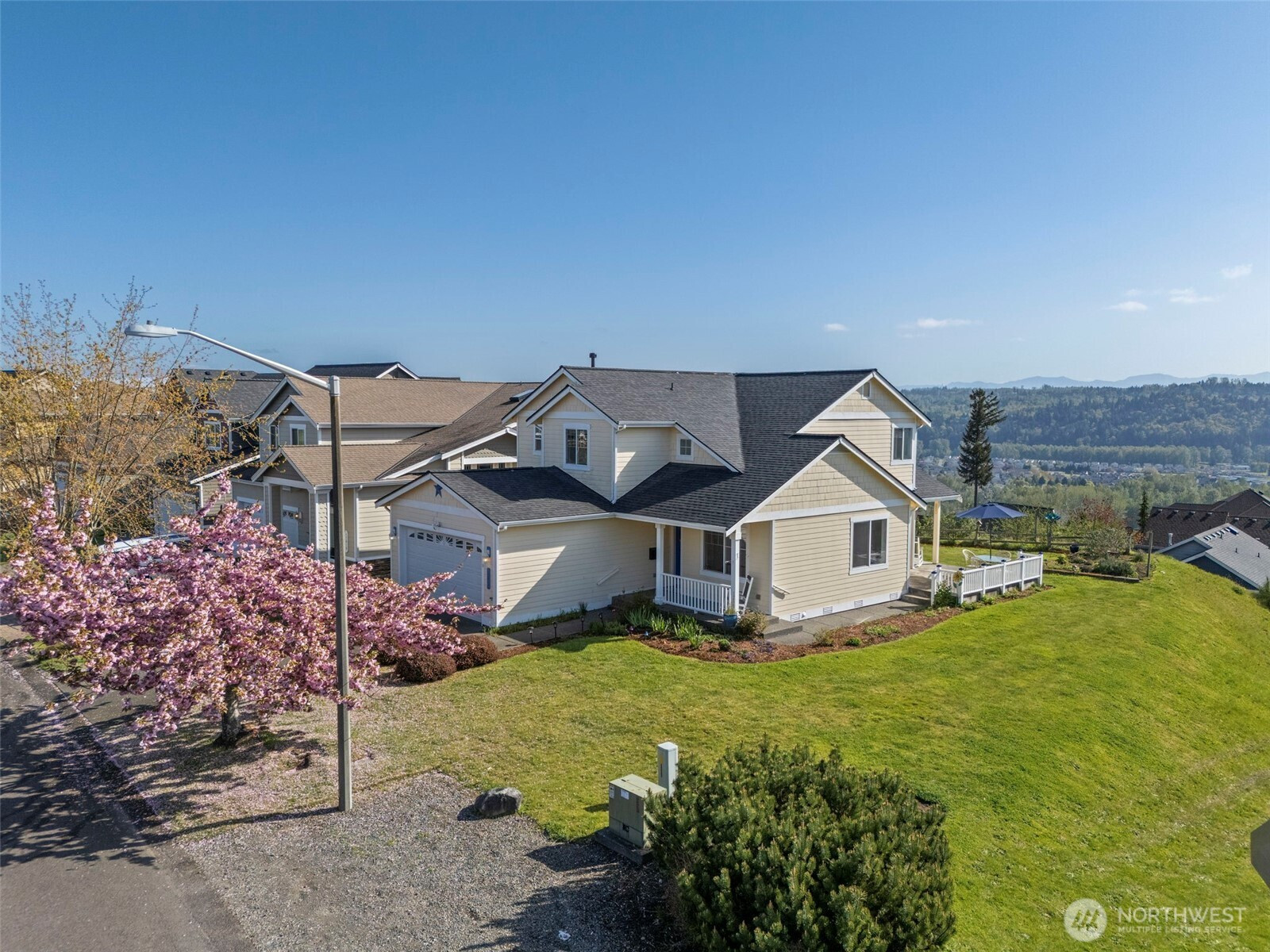 Beautiful home in the sought-after MorningView community, perfectly positioned on a spacious corner lot with stunning Mt. Rainier views from several rooms! Capture the sun rising over the mountain and valley from the windows overlooking the backyard. Step onto the covered patio and take in the scenery that makes your backyard feel like it stretches endlessly into the horizon. Inside, you’ll find 4 generously sized bedrooms, a private primary bath, and two separate living spaces—offering flexibility and room to truly spread out. Hardwood floors and updated light fixtures compliment the space. The kitchen is designed for both function and style, featuring abundant cabinetry, expansive counter space, stainless steel appliances, Quartz counter-tops, PLUS a double oven to make cooking and entertaining effortless. Everyday moments feel elevated as you take in the views from the charming farmhouse sink. The spacious primary suite is a true retreat, complete with a relaxing soaking tub and picture-perfect views of Mt. Rainier. For those with a green thumb, the backyard garden space is something special—bathed in ideal natural light and ready to thrive. Located just minutes from top-rated schools, parks, shopping, and major commuter routes, this home offers the perfect balance of convenience, comfort, and lifestyle—everything you’ve been searching for. Schedule a showing today! Did we mention the VIEW!!!