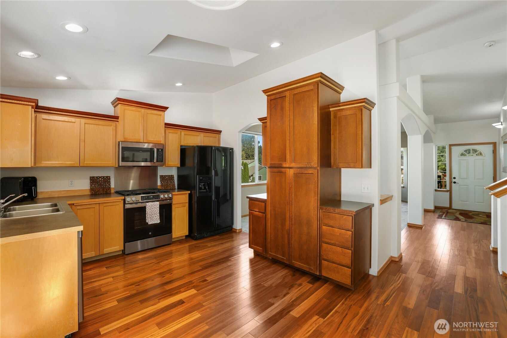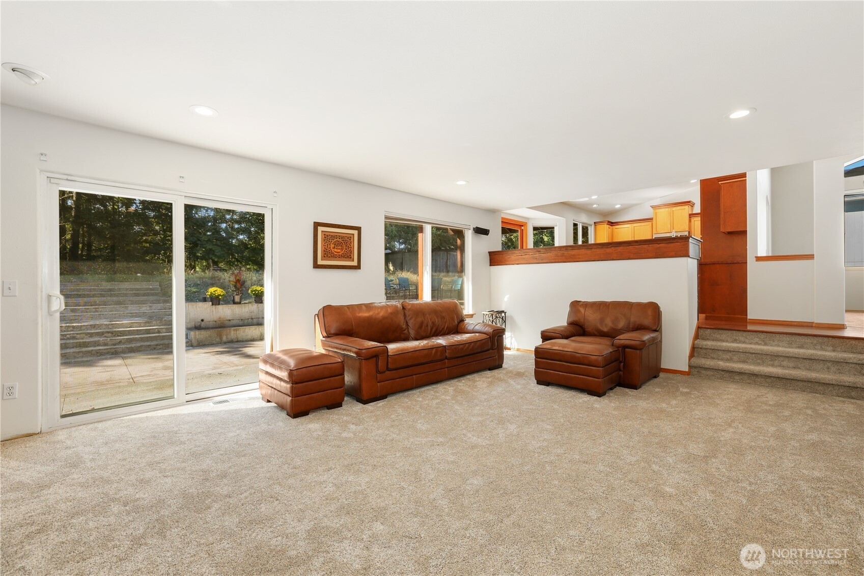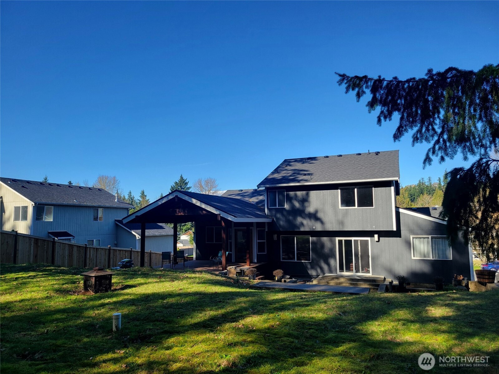 Beautifully updated move-in ready 4-bedroom, 2.5-bath tri-level home on an oversized 1/3-acre lot backing to a serene, forested greenbelt—offering privacy and natural views. The main level flows seamlessly with a living room, dining and hardwood floors lead to a bright, open kitchen with newer appliances. Downstairs features a cozy family room, a versatile bedroom/den/office, half bath, and laundry area. Upstairs are two additional bedrooms, a full bath, and a luxurious primary suite with a 5-piece bath. Enjoy peace of mind with a brand-new roof, fresh interior and exterior paint, and new carpet throughout. The spacious 3-car garage includes 380 sq. ft. of extra storage, plus a large RV pad. Entertain in style with in-wall prewired surround sound and a sliding door that opens to an oversized concrete patio and covered deck—ideal for relaxing or hosting gatherings. Filled with upgrades throughout, this home combines comfort, functionality, and charm.