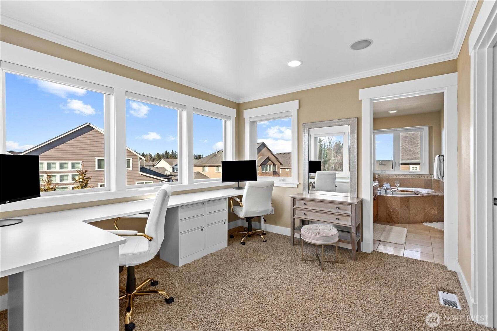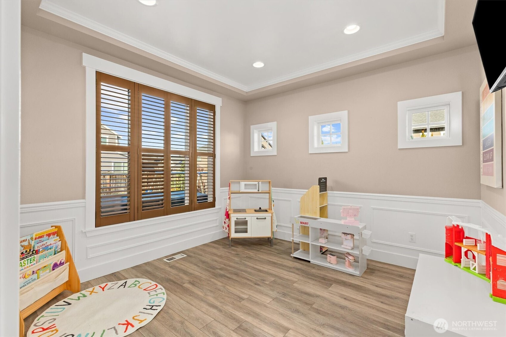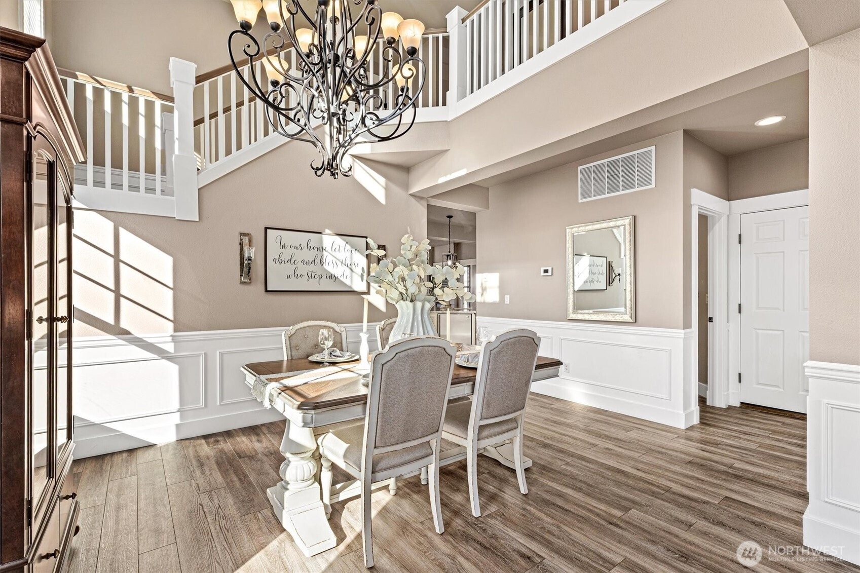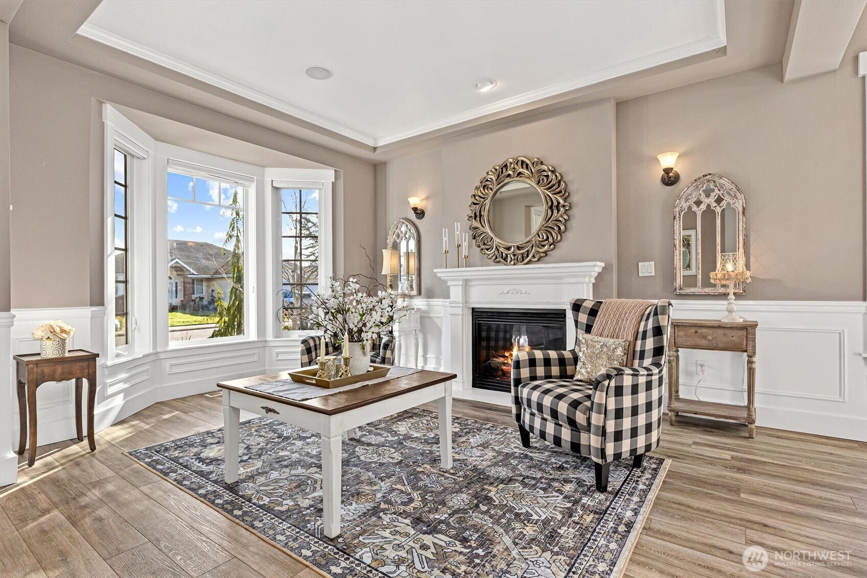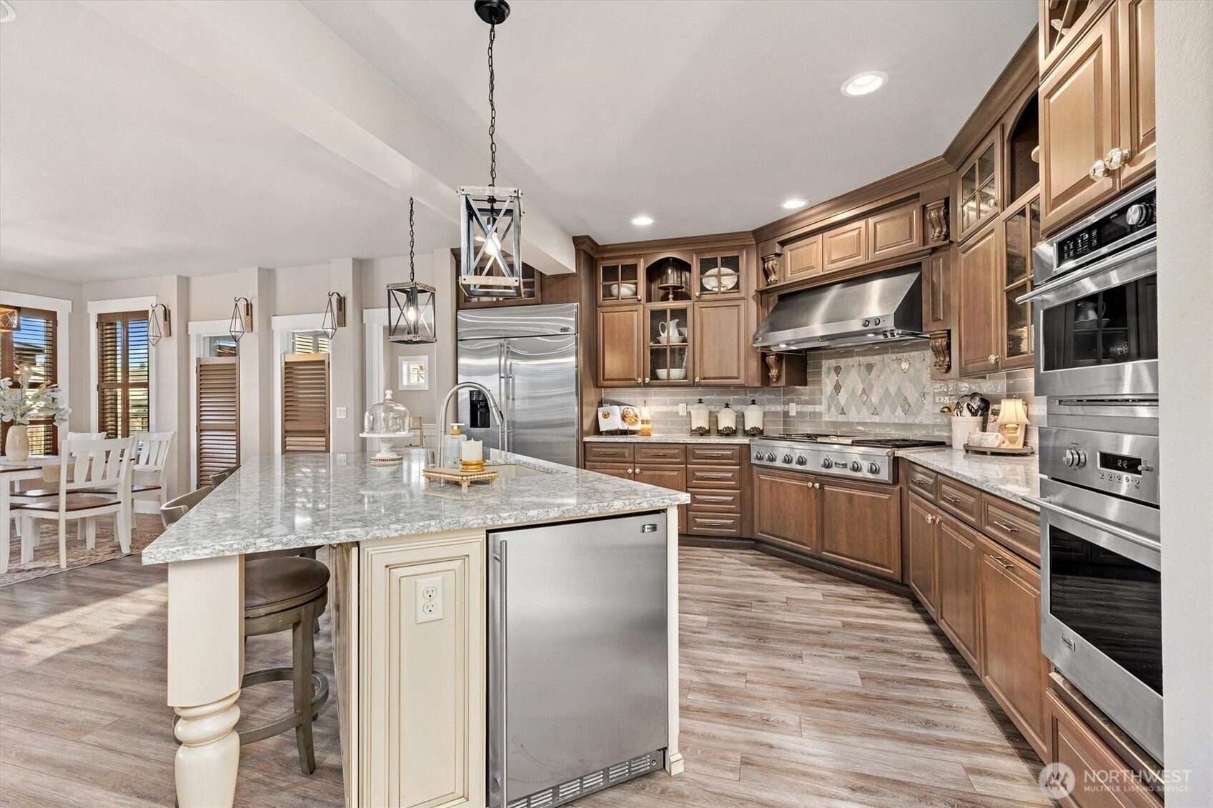 Welcome to elevated living in the highly sought-after Sunrise community, where thoughtful design meets everyday luxury. This beautifully updated 4-bdrm residence offers a rare blend of elegant entertaining spaces & comfortable modern living. At the heart of the home, a stunning chef’s kitchen showcases new custom cabinetry with display features, wine storage, quartz countertops, designer tile backsplash, stainless steel apps, and a 6-burner gas cooktop with built-in grill. The oversized island, complete with beverage fridge and glass display cabinet, creates a natural gathering place for hosting and connection. Formal living and dining rooms with vaulted ceilings add sophistication, while the inviting family room features custom built-ins, a gas fireplace, and updated vinyl plank flooring throughout. Upstairs, a spacious bonus/media room provides flexible living, while the private primary retreat offers a built-in workspace, jetted soaking tub, and double-head shower for a spa-like experience. Three gas fireplaces throughout the home add warmth and ambiance. Outdoor living shines with a covered gazebo patio, bar seating, hot tub, and generous space for entertaining, gardening, playing, or relaxing. A rare 4-car tandem garage offers a finished flexible use space for hobbies, fitness, or storage. Ideally located near Sunrise park, multiple playgrounds, tennis courts, clubhouse amenities, schools, shopping, & dining, with peekaboo Mt. Rainier views completing the experience!