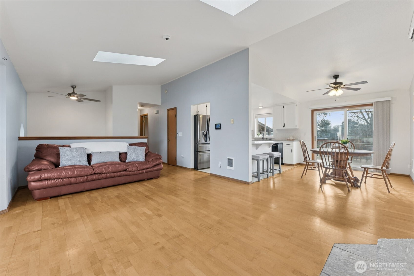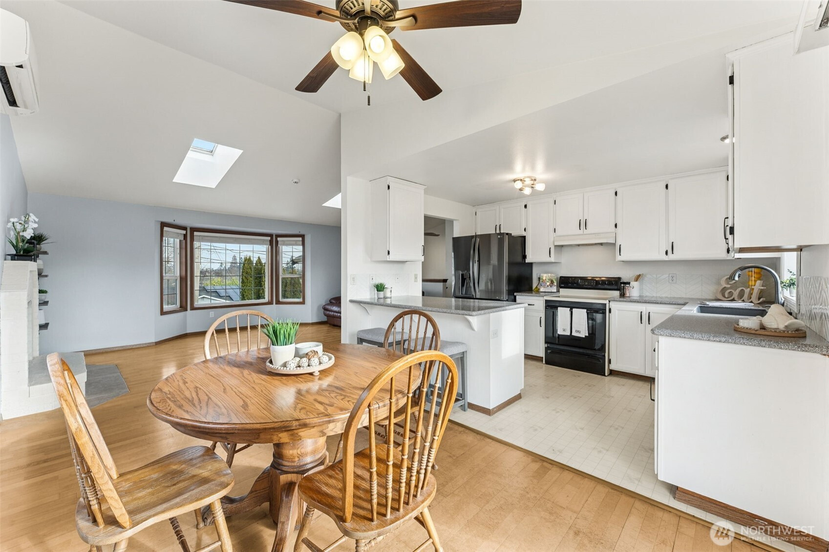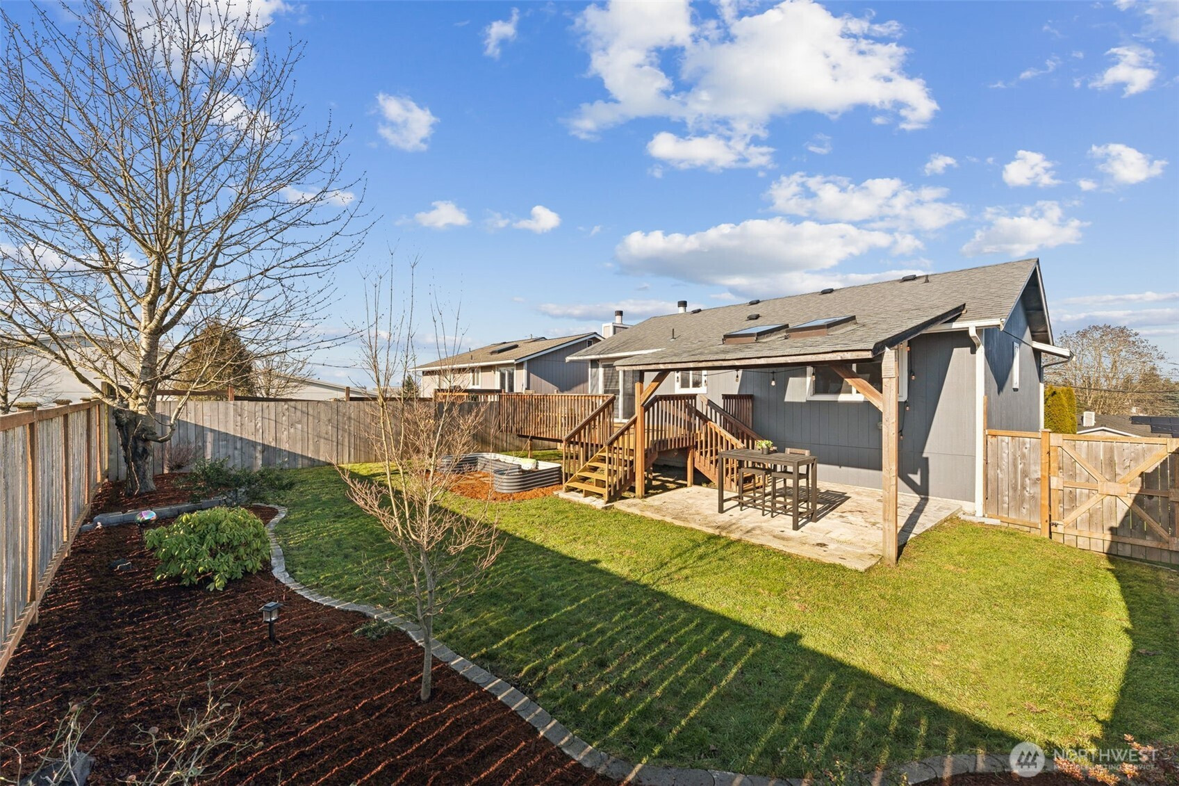 Welcome to this beautiful, light and bright, 3 bedroom, 1.75 bath home with a great split-level layout and spaces for everyday living and entertaining. Upstairs offers 2 bedrooms, a full bath, vaulted ceilings with skylights, and an inviting living room with fireplace and dining area next to an updated kitchen with ample counter space, peninsula island and bar seating. Enjoy the downstairs bonus room, great for media, gym, or extra space along with the 3rd bedroom and 3/4 bath. Mini-splits located upstairs and downstairs for your heating and cooling needs along with a built-in security system. On a clear day, enjoy the Olympic Mountain view from the living room. Enjoy year-round outdoor living with a spacious upper deck for gatherings plus a covered lower patio that’s ideal for rainy days. Fully fenced backyard with grass, flower beds and a raised garden bed for easy gardening. Large 2-car garage (washer & dryer) stay! Convenient location close to JBLM, freeway access, shopping, and restaurants.