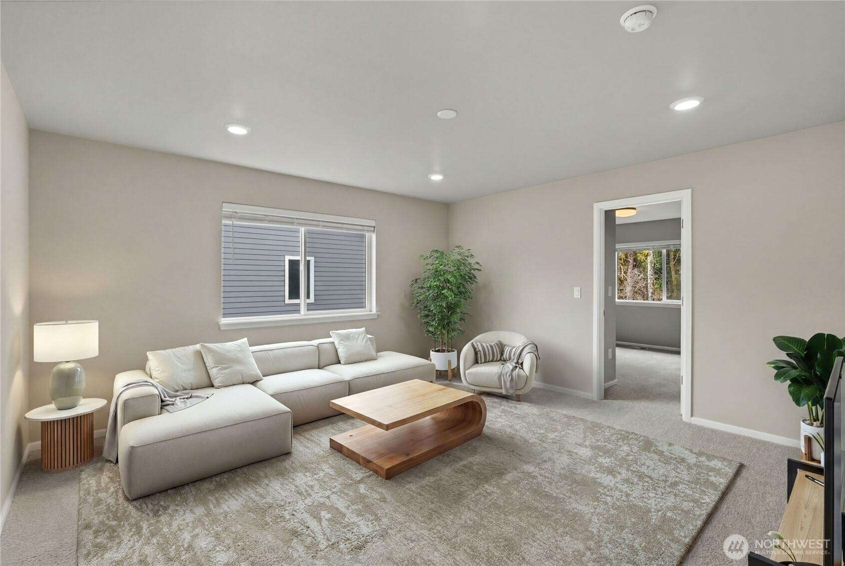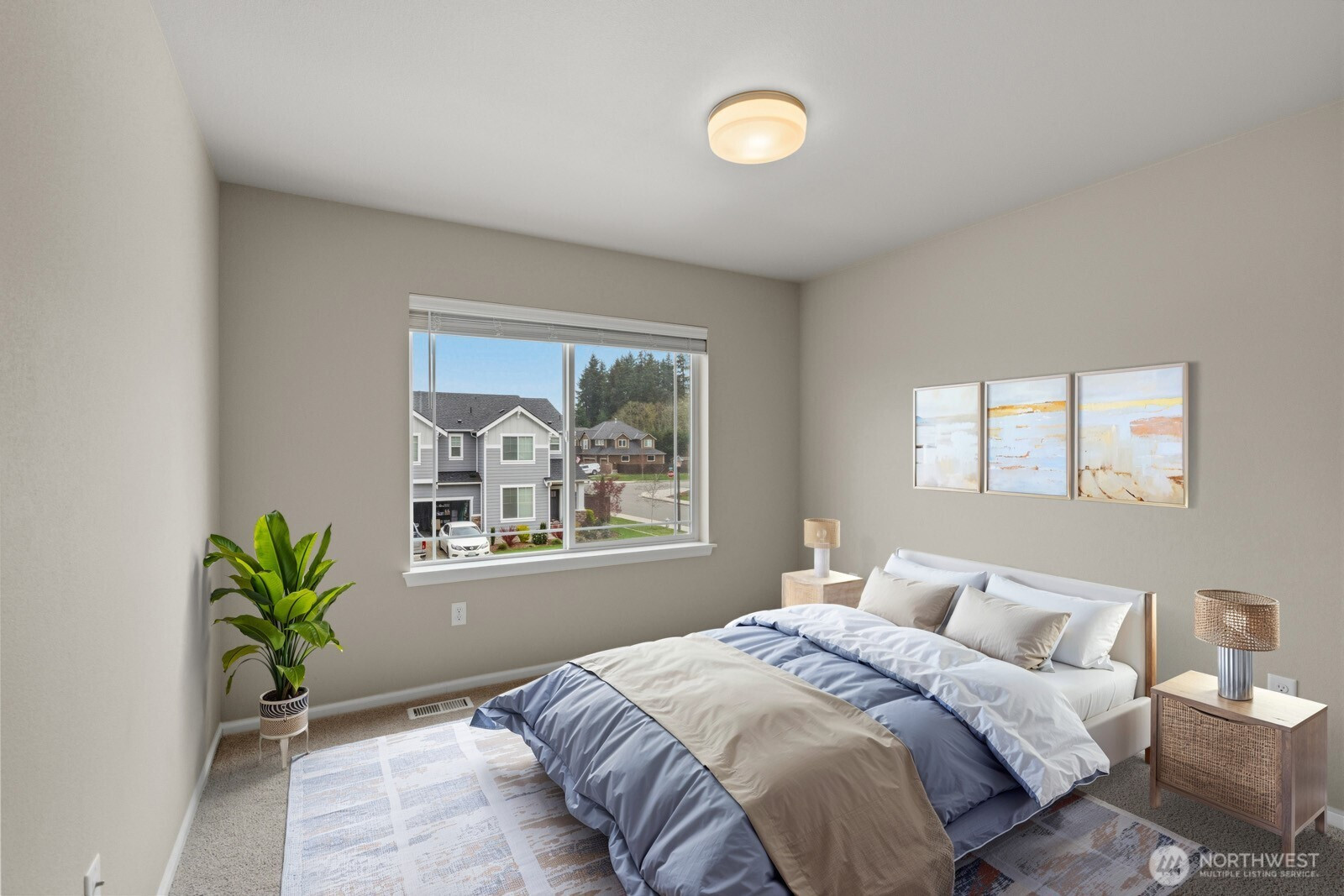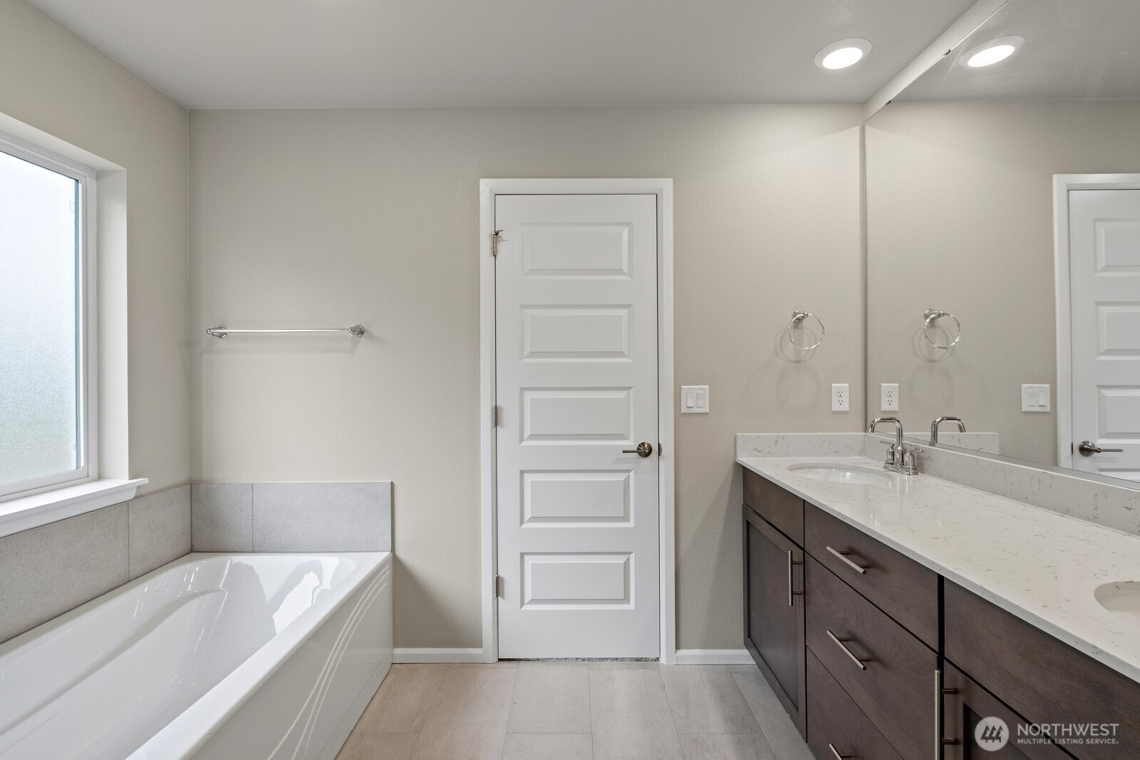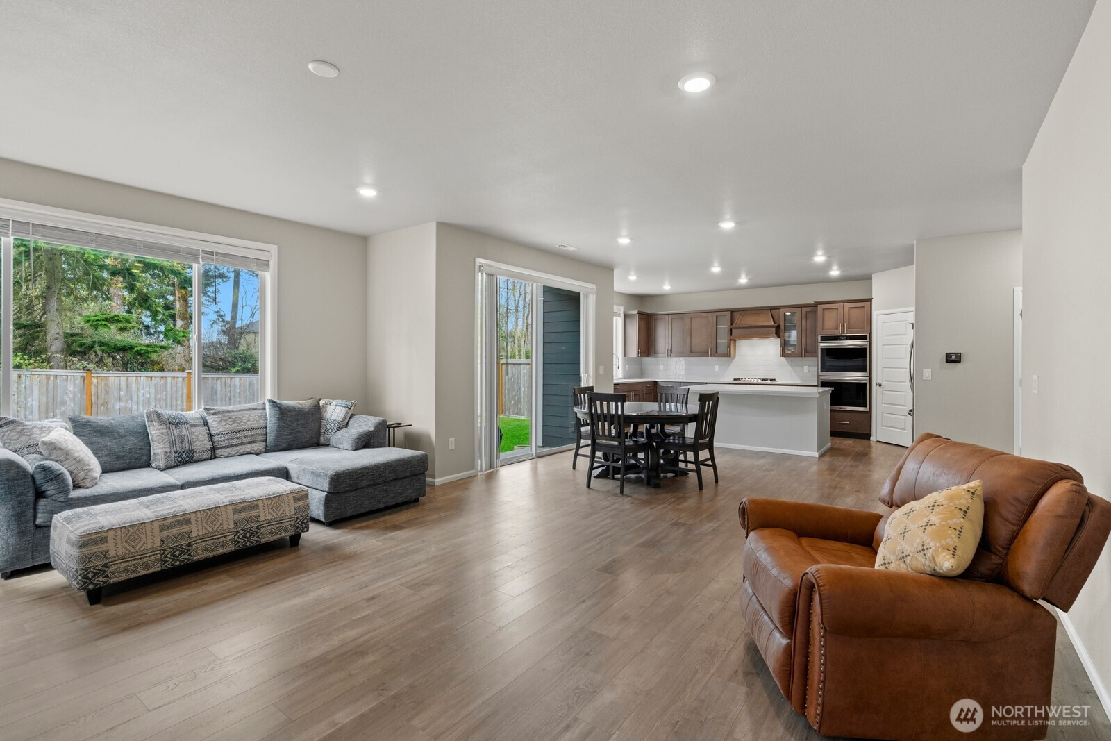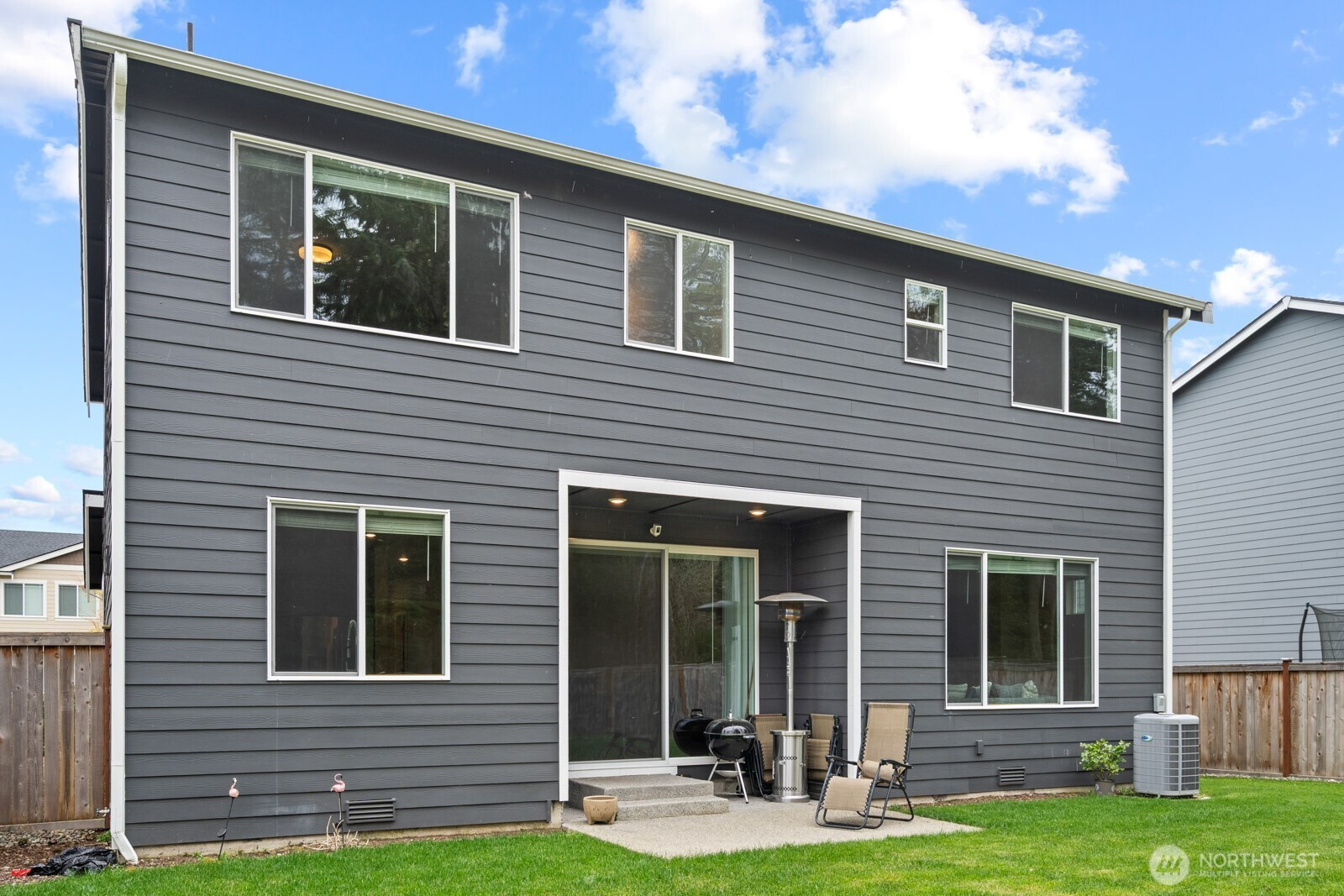 Welcome to refined living in the coveted Crossings at Sunrise—where comfort, style, and thoughtful design come together in a home that truly stands out. This beautifully maintained, nearly new home features a thoughtfully designed open-concept floor plan filled with natural light offering the perfect balance of modern luxury and everyday functionality. At the heart of the home is an expansive great room that exudes warmth and sophistication with a cozy gas fireplace and high ceilings that flows seamlessly into a gourmet kitchen complete with quartz countertops, stainless steel appliances, and even a double oven—perfect for both entertaining and daily living. The main-level includes an office room ideal for flexibility for either work or leisure. Upstairs, the spacious primary suite provides a private retreat with a large walk-in closet and a spa-like five-piece bath featuring a frameless glass shower and soaking tub and refined finishes that create a true sense of relaxation and retreat. Additional living space upstairs adds versatility for a media room, play area, or lounge. Upstairs laundry room is a plus. Enjoy outdoor living in the fully fenced backyard backing to a private greenbelt, offering both space and serenity. A spacious three-car garage and high-efficiency HVAC system with A/C ensure year-round comfort and convenience. Located near Sunrise Park, shopping, schools, and more—with stunning Mount Rainier views as you come and go—this home truly has it all.