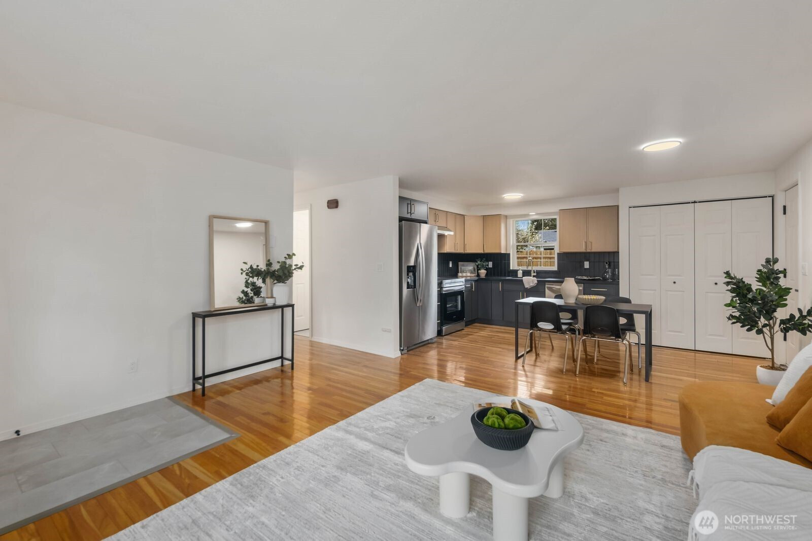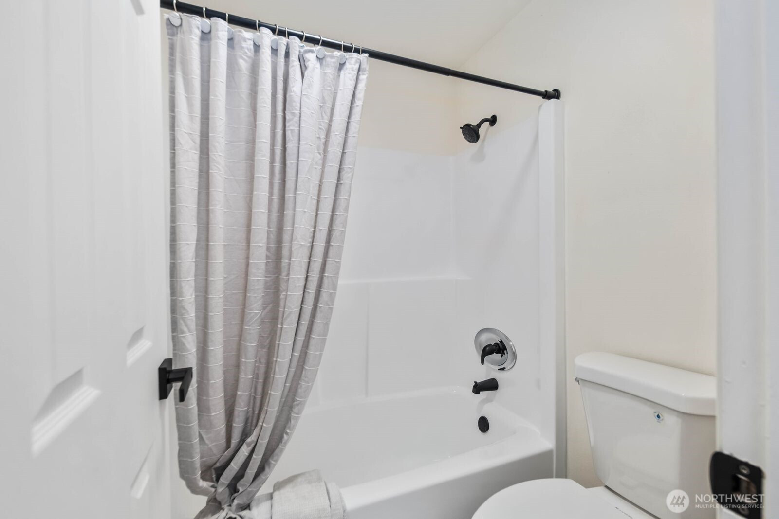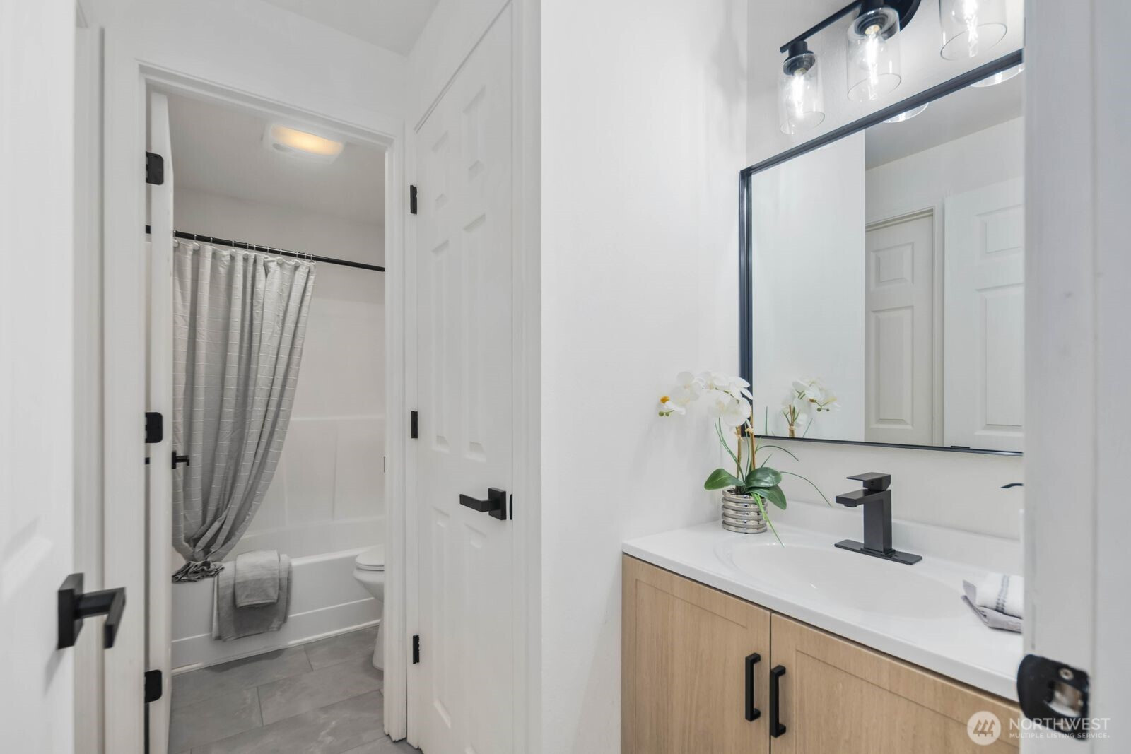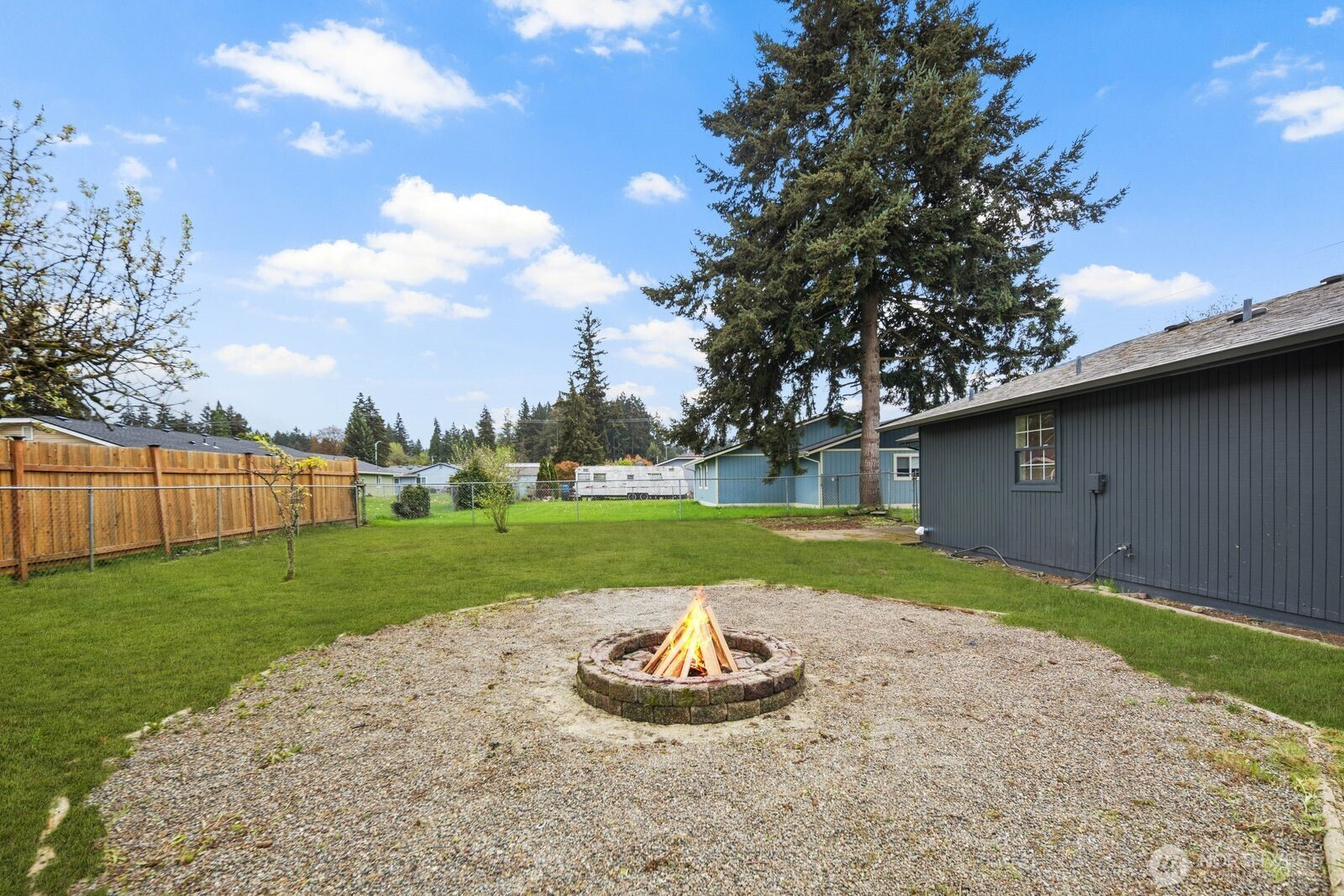 Fully updated and move-in ready, this sharp Spanaway home delivers modern design at an accessible price point. The striking charcoal exterior with warm wood entry detail makes a strong first impression, set on a 7,500 sq ft lot with a spacious yard and a dedicated fire pit area perfect for outdoor entertaining. Inside, the open concept layout flows seamlessly from the living area into a fully renovated kitchen featuring two-tone cabinetry, dark countertops, subway tile backsplash, and stainless appliances. The full bathroom connects directly to the primary bedroom, offering an en suite feel with updated wood-tone vanity, matte black fixtures, and clean white finishes. Three comfortable bedrooms with fresh carpet complete the accommodations. At 1,016 square feet, the layout is efficient and well-executed, with quality finishes throughout that punch well above the price. Easy access to Joint Base Lewis-McChord, shopping, and South Sound commute routes. A turnkey opportunity in Spanaway that shows exceptionally well.
