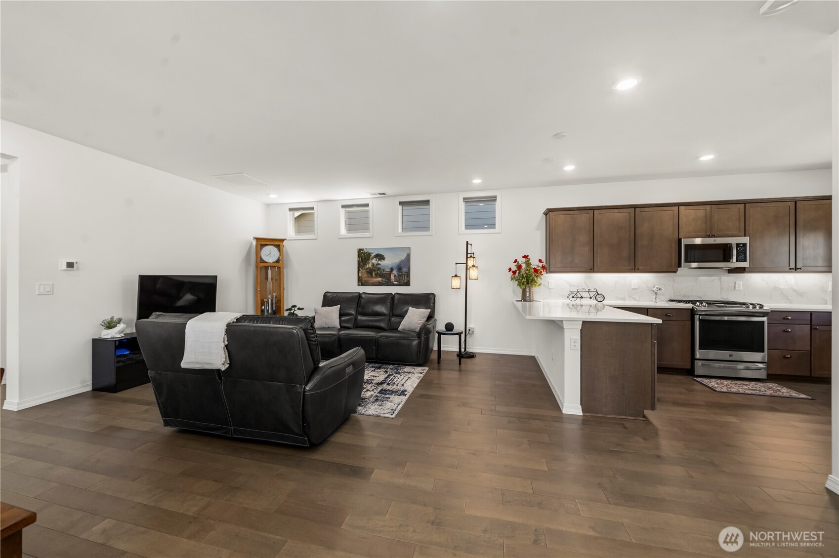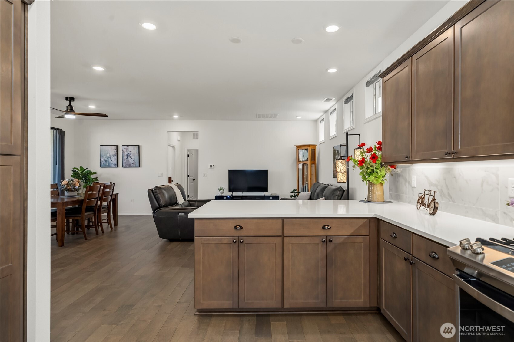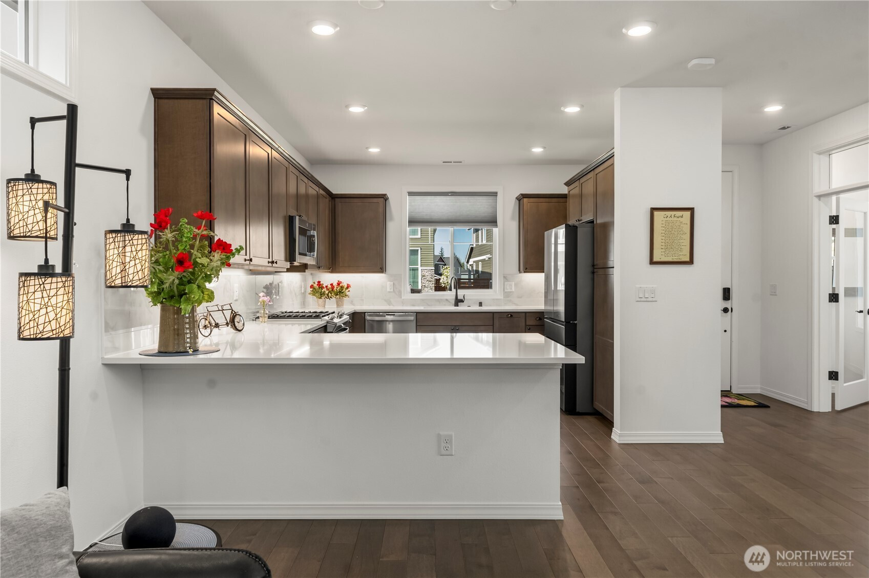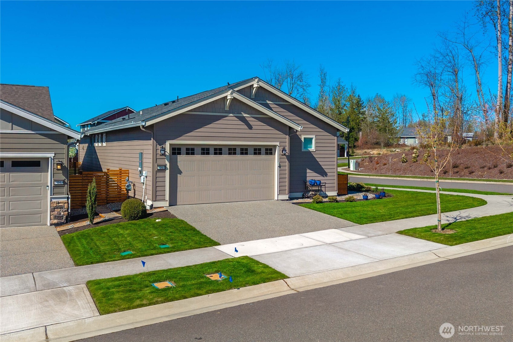 Resort 55+ living at Trilogy at Tehaleh! This better-than-new residence is ideally positioned on a premium corner lot with serene views of a protected natural preserve. Showcasing over $100,000 in Shea & owner upgrades, this home is a masterclass in 'Classic Chic' design. Beautiful, engineered hardwood flooring flows seamlessly throughout. The stunning kitchen features premium quartz counters, full-height backsplash, soft-close cabinetry, crown molding, & under-lighting. High-performance GE appliances are anchored by a Samsung Smart Refrigerator with Beverage Center, with the seating bar providing a natural social hub. The open-concept design offers a spacious great room and dining area. In addition to a convenient powder room, the primary suite is a true retreat with a private entrance to a spa-inspired ensuite featuring quartz counters, double sinks, a frameless glass shower & designer tile. The laundry/mudroom includes a Samsung washer & dryer with smart storage. And let’s not forget the versatile second bedroom/den with French doors, perfect for a guest suite or home office. Step outside to your private oasis & enjoy a glimpse of Mt. Rainier & the beautiful outdoors from your composite deck, featuring river rock beds, a paver sidewalk, & a soothing water fountain. With HOA-maintained yard care doing the heavy lifting, you’re free to relax and enjoy the 40 miles of trails, parks, & your private Seven Summits Club—the ultimate lock-and-leave luxury lifestyle.