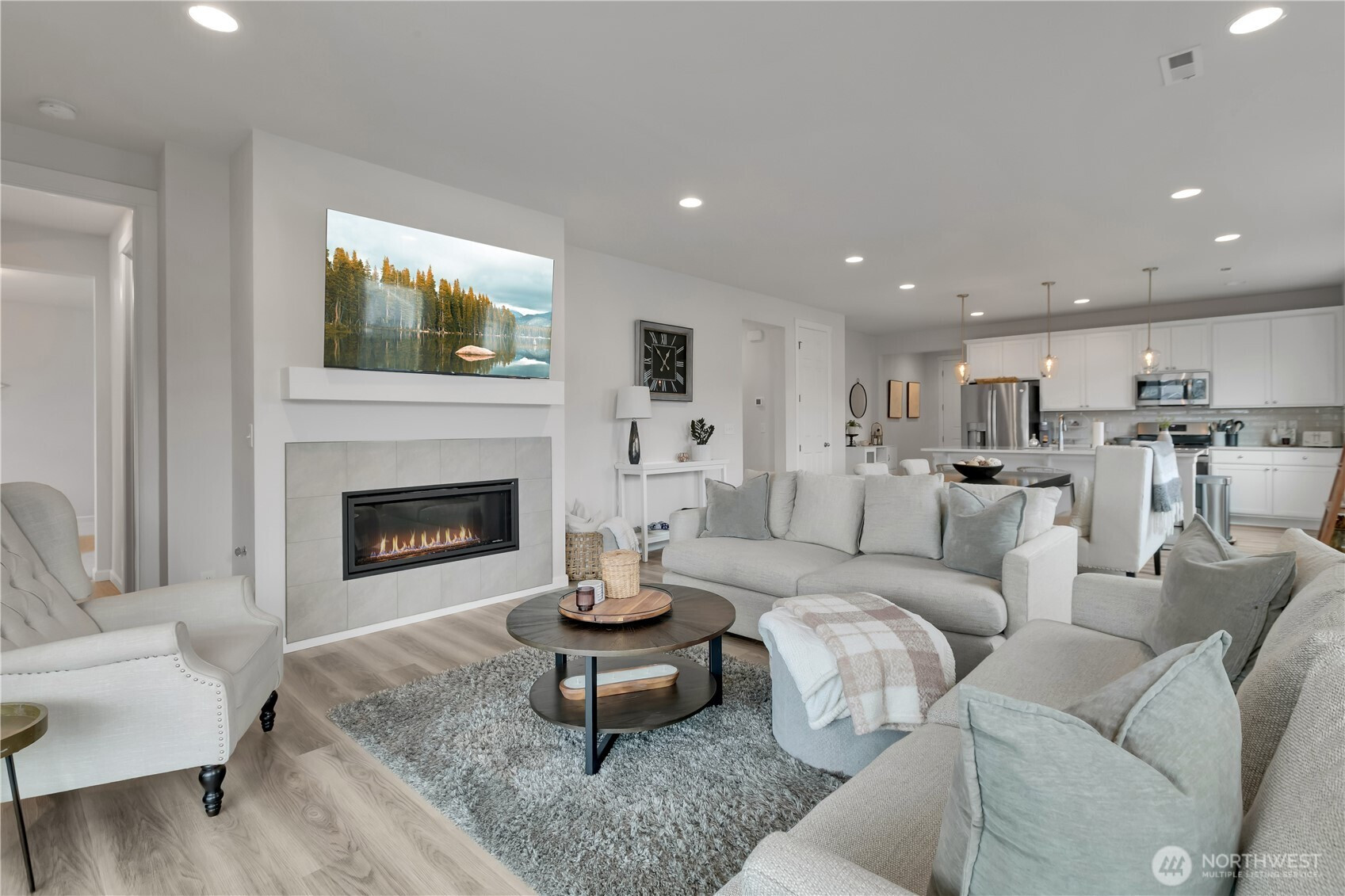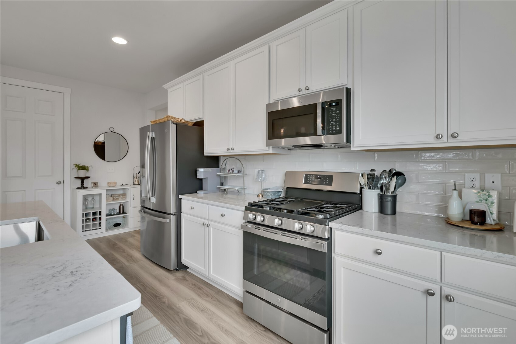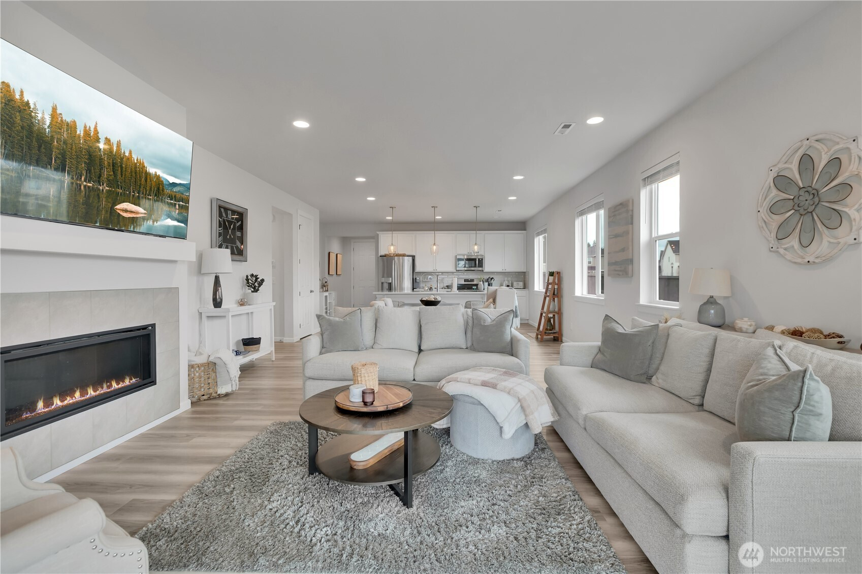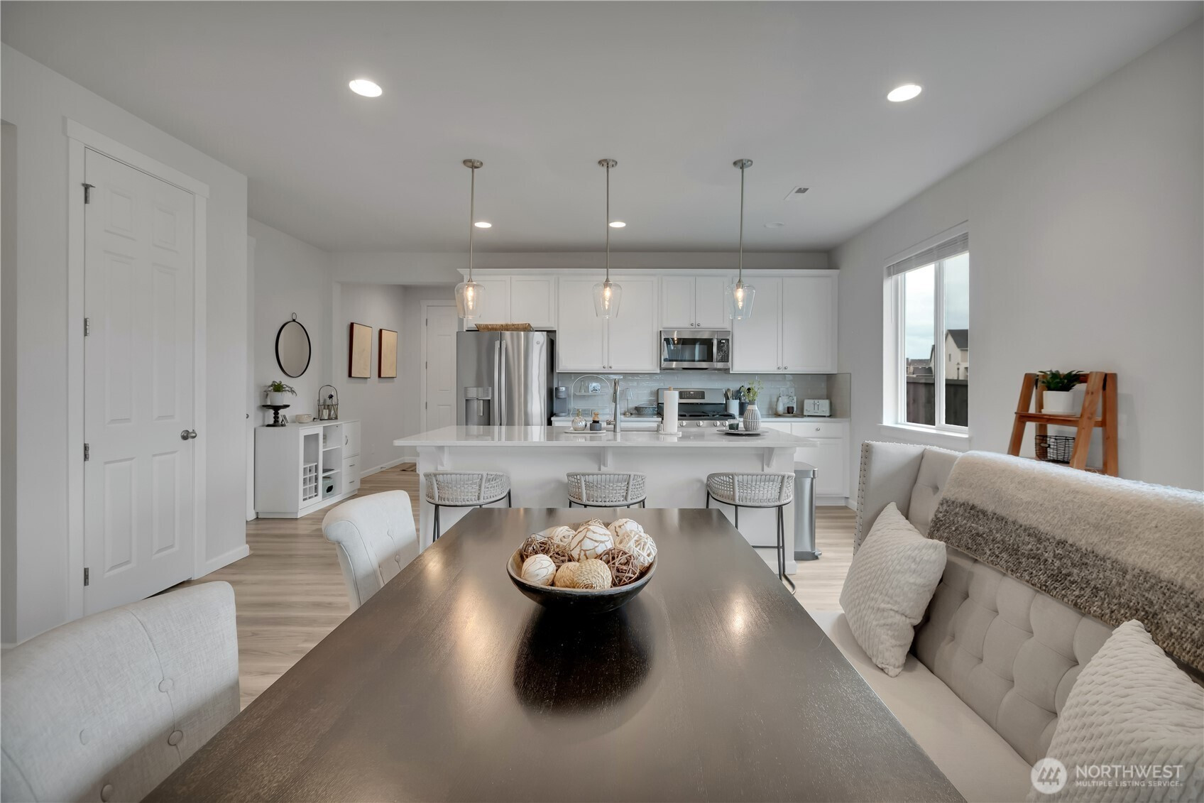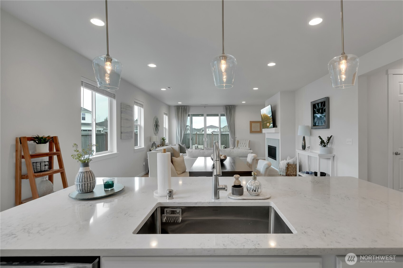 BEAUTIFUL 4 bedroom Puyallup rambler on a large corner lot with a 3 car garage! Fantastic open floor plan offers a spacious living room w/cozy gas fireplace, dining room & kitchen with quartz counters, tile backsplash, white cabinetry, island that has seating, pendant lights, light LVP flooring, stainless steel appliances including a counter-depth fridge, a pantry, & lots of windows for natural light. Nicely sized primary suite with walk in closet & bath with a walk-in shower. Three more bedrooms & a full bath for guests. Laundry room with washer & dryer that stay. Covered front entry & back porch, fully fenced private yard! (surrounded by mostly ramblers) Sunrise community offers parks, trails, dog parks, a splash pad, & zipline!
