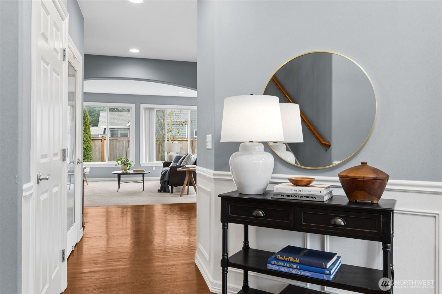 6 bedrooms • Main-level bedroom + full bath • 3-car tandem garage • Fenced yard • 1.5 mi to WA-512: Charming, sophisticated, and timeless 6-bedroom, 3-bath residence on a corner lot in a desirable Puyallup location. Grand entry with hardwood flooring, classic wainscoting, and soaring two-story ceilings. Open-concept design connects kitchen, dining, and living areas, offering a spacious and refined layout for everyday living and entertaining. Gourmet kitchen with stainless steel appliances and generous prep space. Front room provides flexible use for office, den, or formal living or dining. Main-level bedroom with adjacent full bath. Upper level features a generous primary suite with 5-piece bath and soaking tub, along with additional bedrooms and bonus room with closet, supporting 6 total bedrooms. Fresh interior paint and brand-new carpeting throughout. Fully fenced backyard. 3-car tandem garage with ample space for parking and storage. Community playground/park. Located approximately 1.5 mi to WA-512, 2.5 mi to South Hill Mall, and 1.2 mi to Bradley Lake Park, with access to retail, parks, and commuter routes. Be sure to see the attached virtual tour and ask your agent for the full list of special features.
