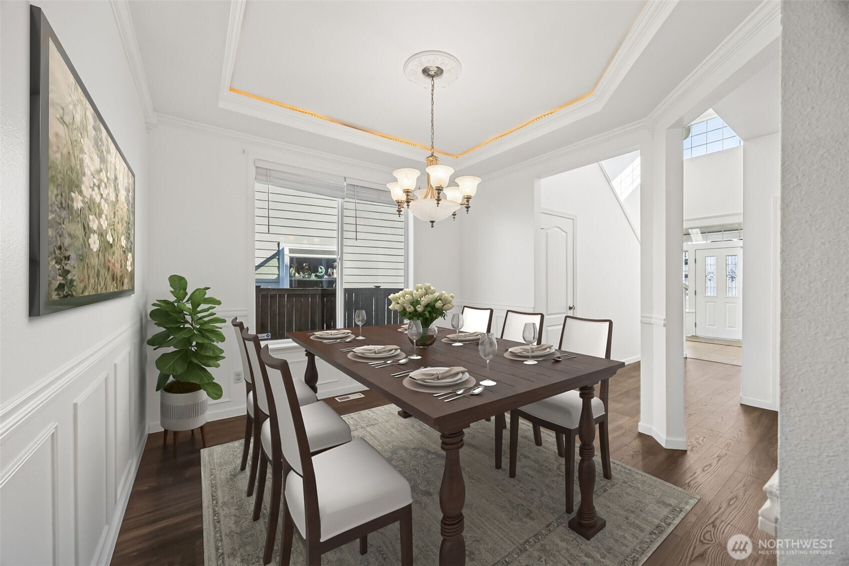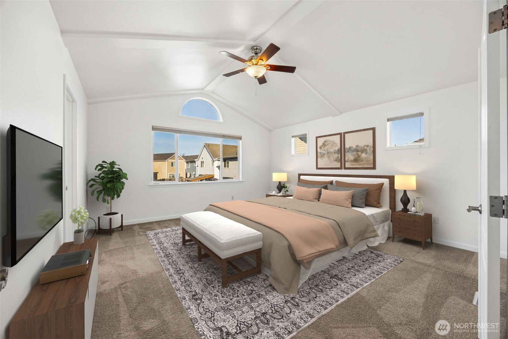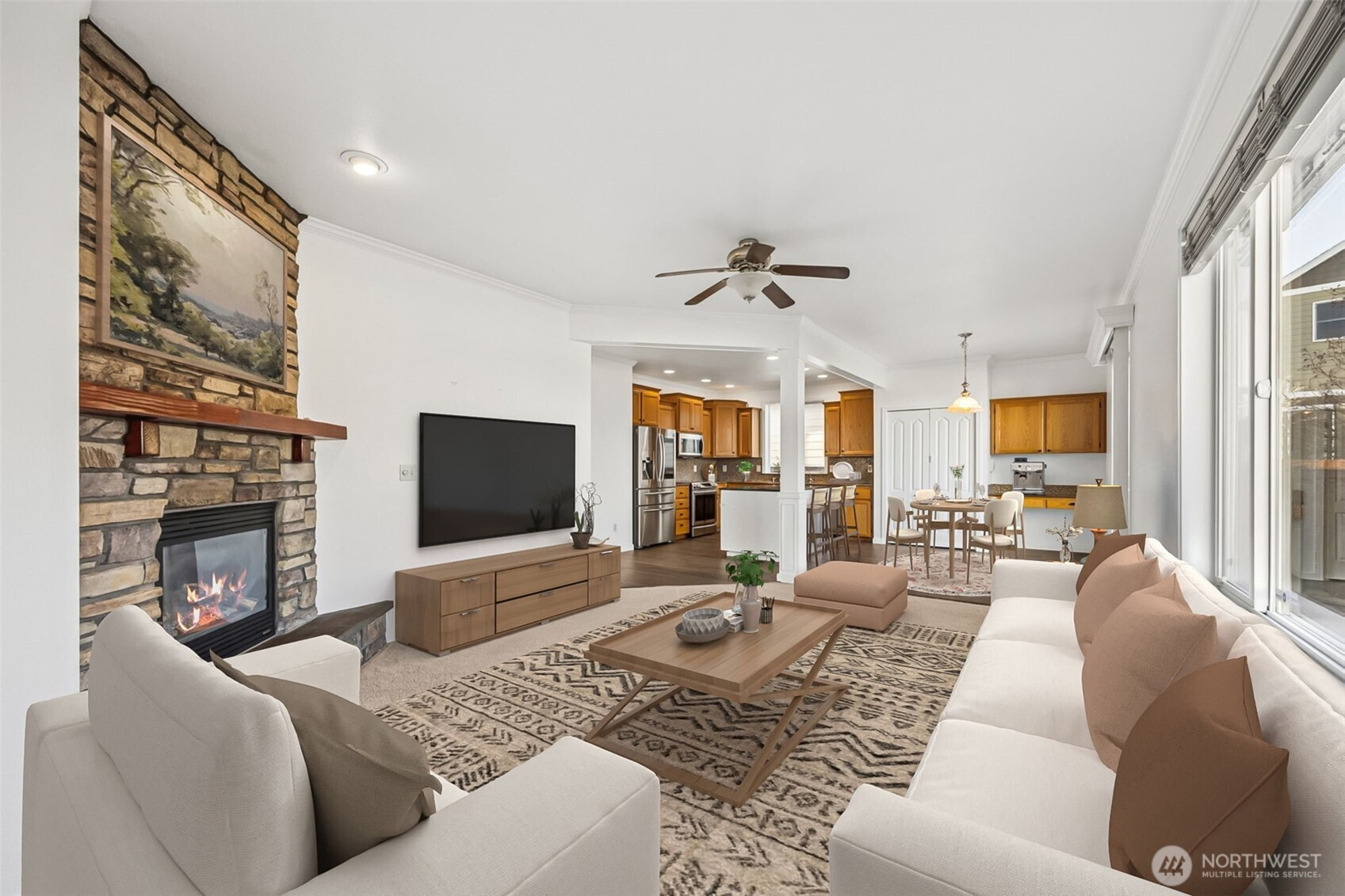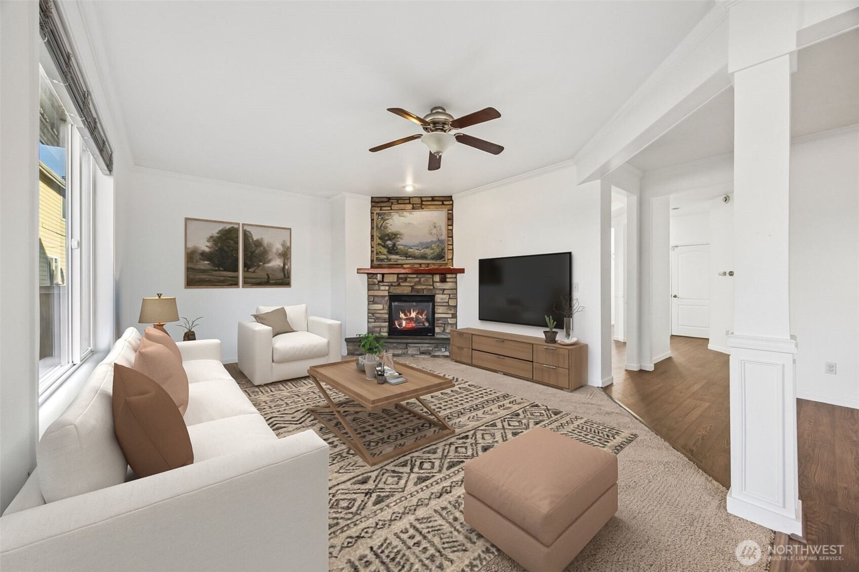 Tastefully updated home in the desirable Lipoma Firs North community featuring a grand entry with soaring vaulted ceilings! Elegant formal dining room with new LVP floors and crown molding. Main floor office/den with glass door. Inviting living room showcases a stunning floor-to-ceiling stacked stone gas fireplace with custom mantle and ceiling fan. Convenient nook with built-in desk/tech space. The kitchen is a standout with granite countertops, full-height glass tile backsplash, pantry, newer stainless-steel appliances, and crown molding on cabinetry. Upstairs offers three spacious guest bedrooms, plus full guest bath ft. quartz counters and painted cabinetry plus laundry room with washer and dryer included. The luxurious primary suite features French doors, vaulted ceilings, ceiling fan, and a walk-in closet with custom built-ins- plus a Spa-like 5-piece primary bath with ceramic tile floors and a relaxing jetted soaking tub. Enjoy the fully fenced backyard with patio space and a low-maintenance yard—perfect for relaxing or entertaining. Additional highlights include fresh interior and exterior paint, carpet and A/C for year-round comfort all installed in 2024. Pre-wired for Generator. Centrally located near community parks, shopping, schools, and entertainment!