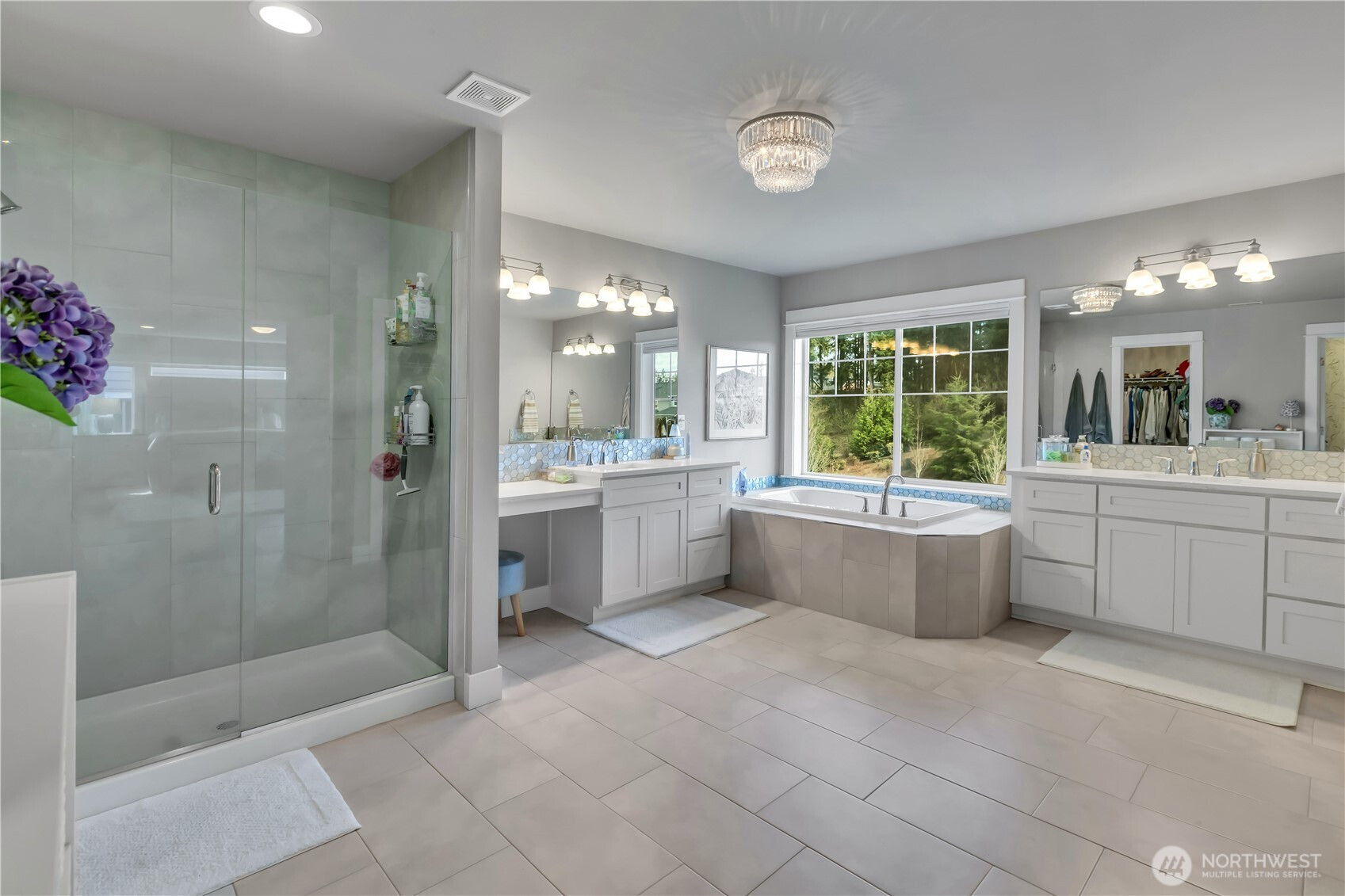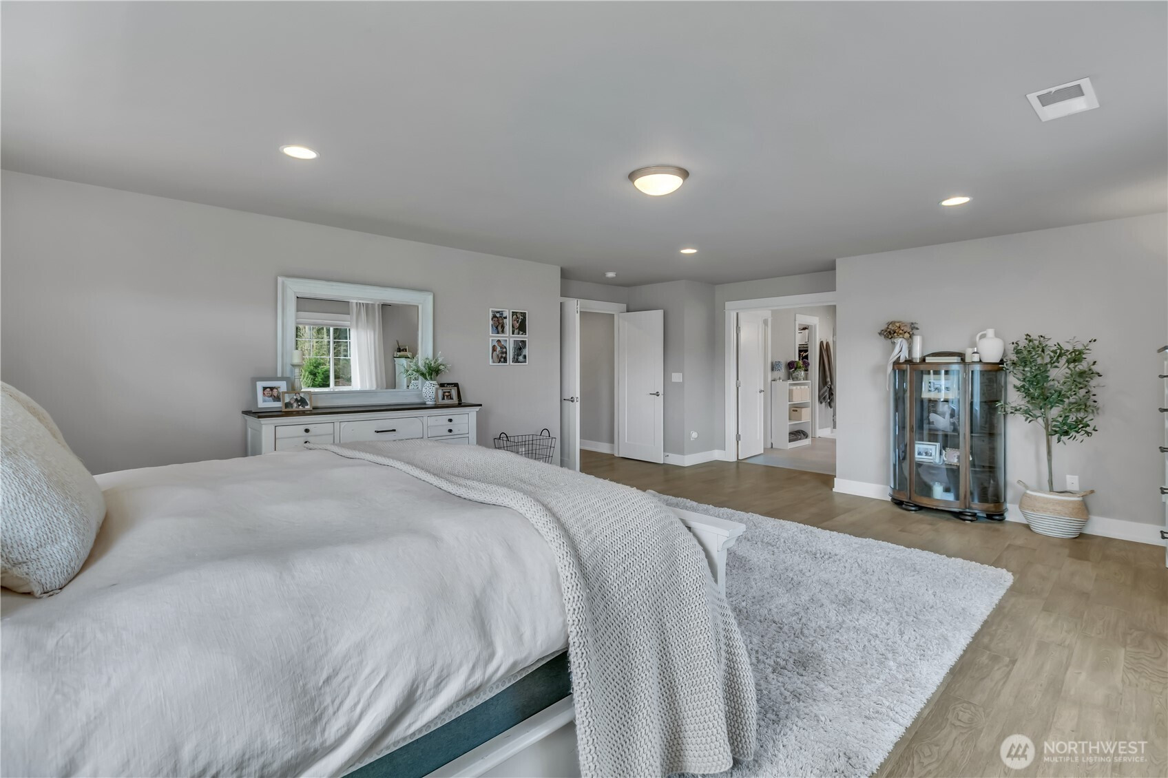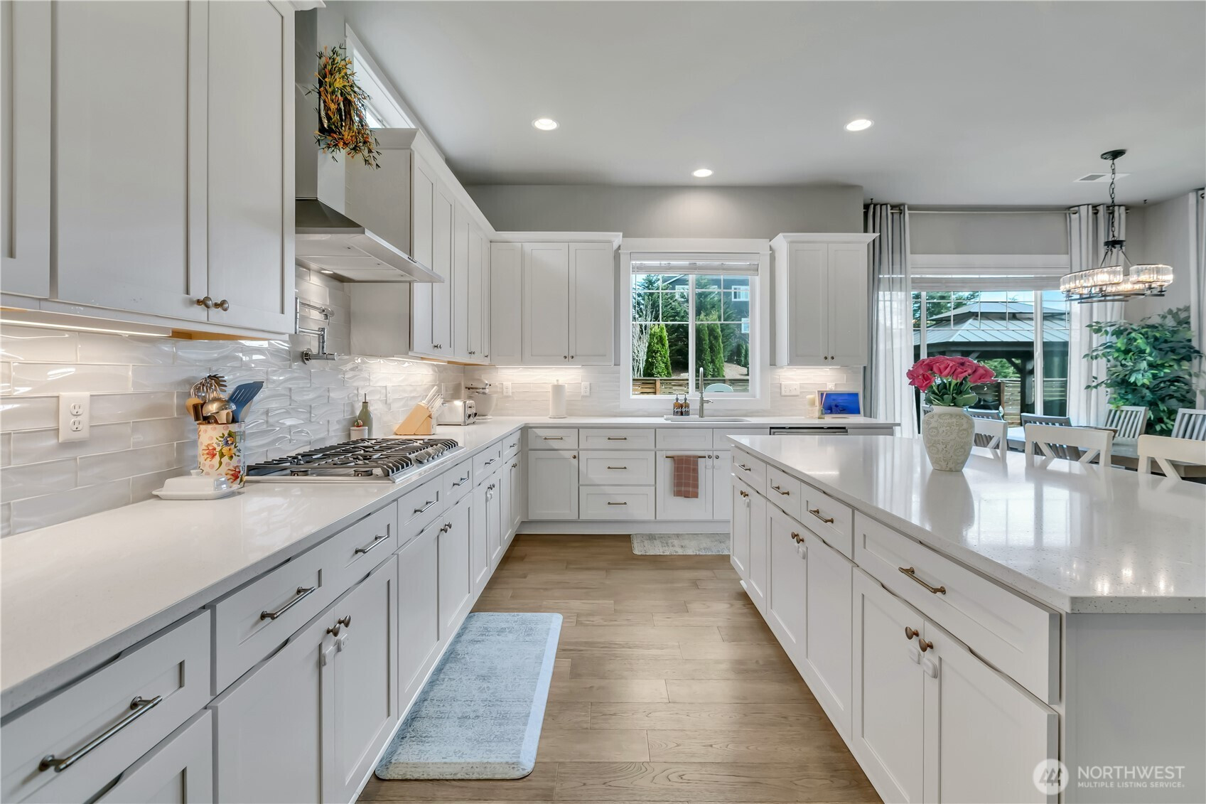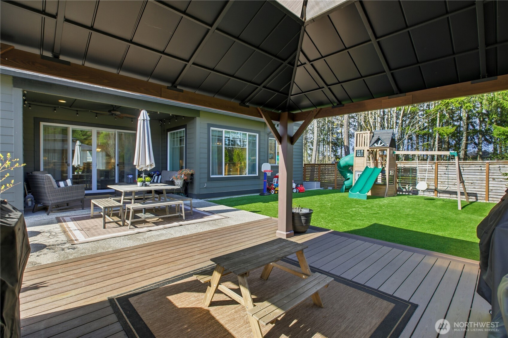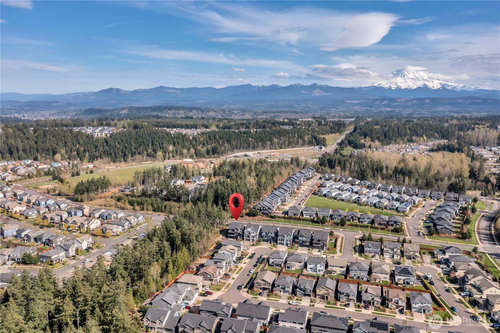 Set at the end of a quiet dead-end street beside a forested greenbelt, this impressive multi-level home offers a rare balance of privacy, style, and intention. A welcoming double-door entry opens to a seamless main-floor design, where a floor-to-ceiling stone fireplace anchors the Great Room and French sliders lead to an extended covered patio with its own fireplace—ideal for year-round entertaining. The kitchen is as functional as it is striking, featuring stainless appliances, a commercial-grade refrigerator, pot filler over the gas range, expansive island, and a walk-in pantry that rivals the size of most kitchens. A main-level fourth bedroom or office adds flexibility, complete with French doors to a private balcony. Upstairs, the grand primary suite offers a true retreat with a five-piece bath, dual vanities, and two closets. A large bonus room, two additional bedrooms, and an upstairs laundry room with ample counter space and cabinet storage complete the level. Not a stitch of carpet throughout; engineered hardwood & ceramic tile. ~ $40,000 in upgrades—primarily in professional landscaping—enhance the fully fenced backyard with artificial turf, pergola, and playset. A rooftop deck captures partial Mt. Rainier views and includes furniture. With central A/C, a 3-car garage, finished mudroom, Govee outdoor lights, and access to Tehaleh’s trails and parks in the Sumner-Bonney Lake School District, this home delivers.