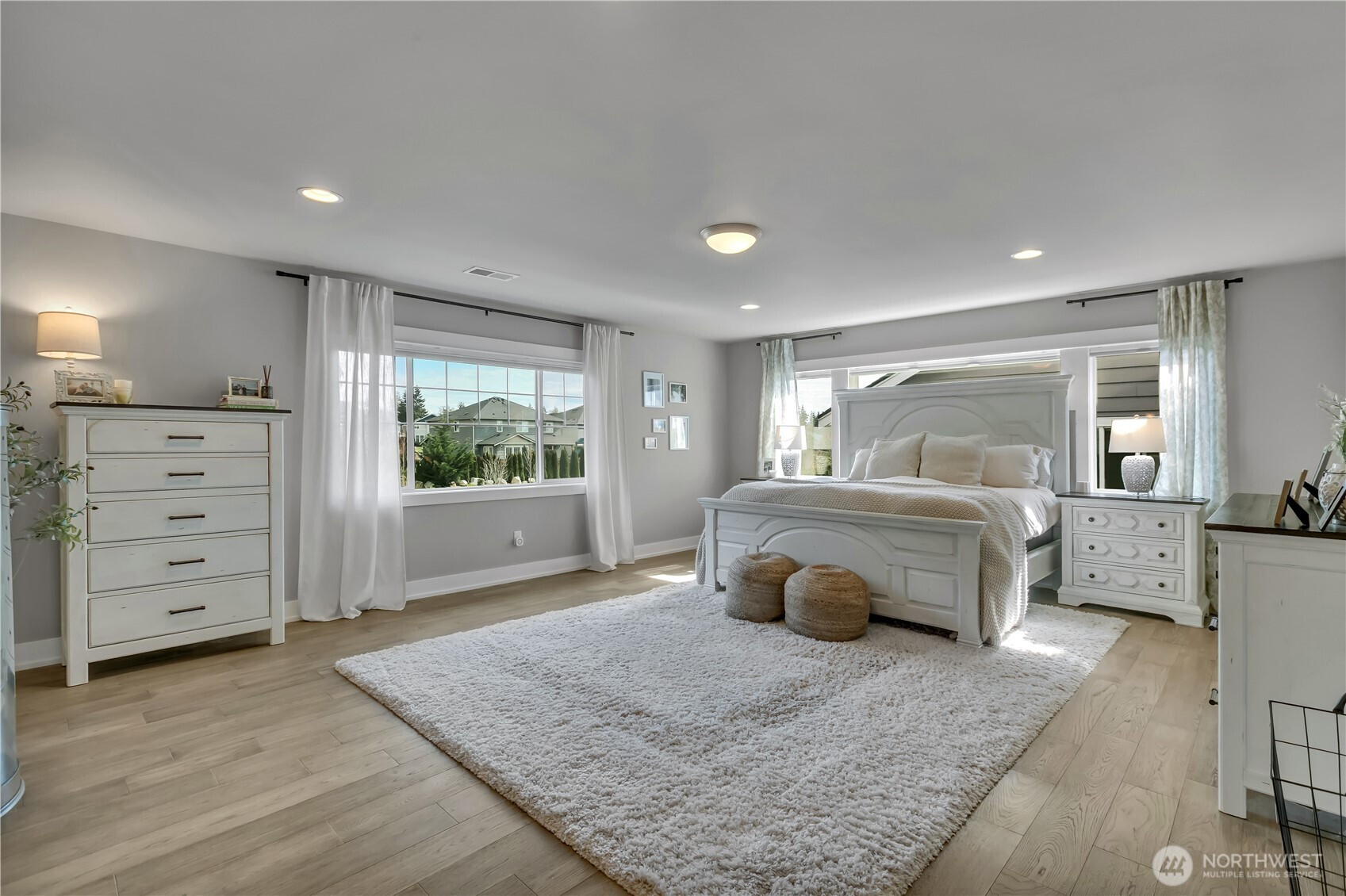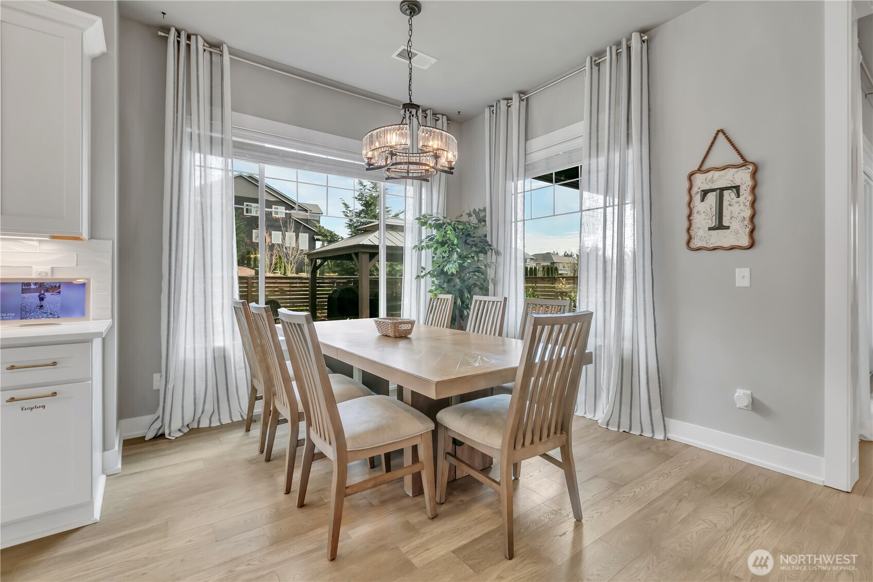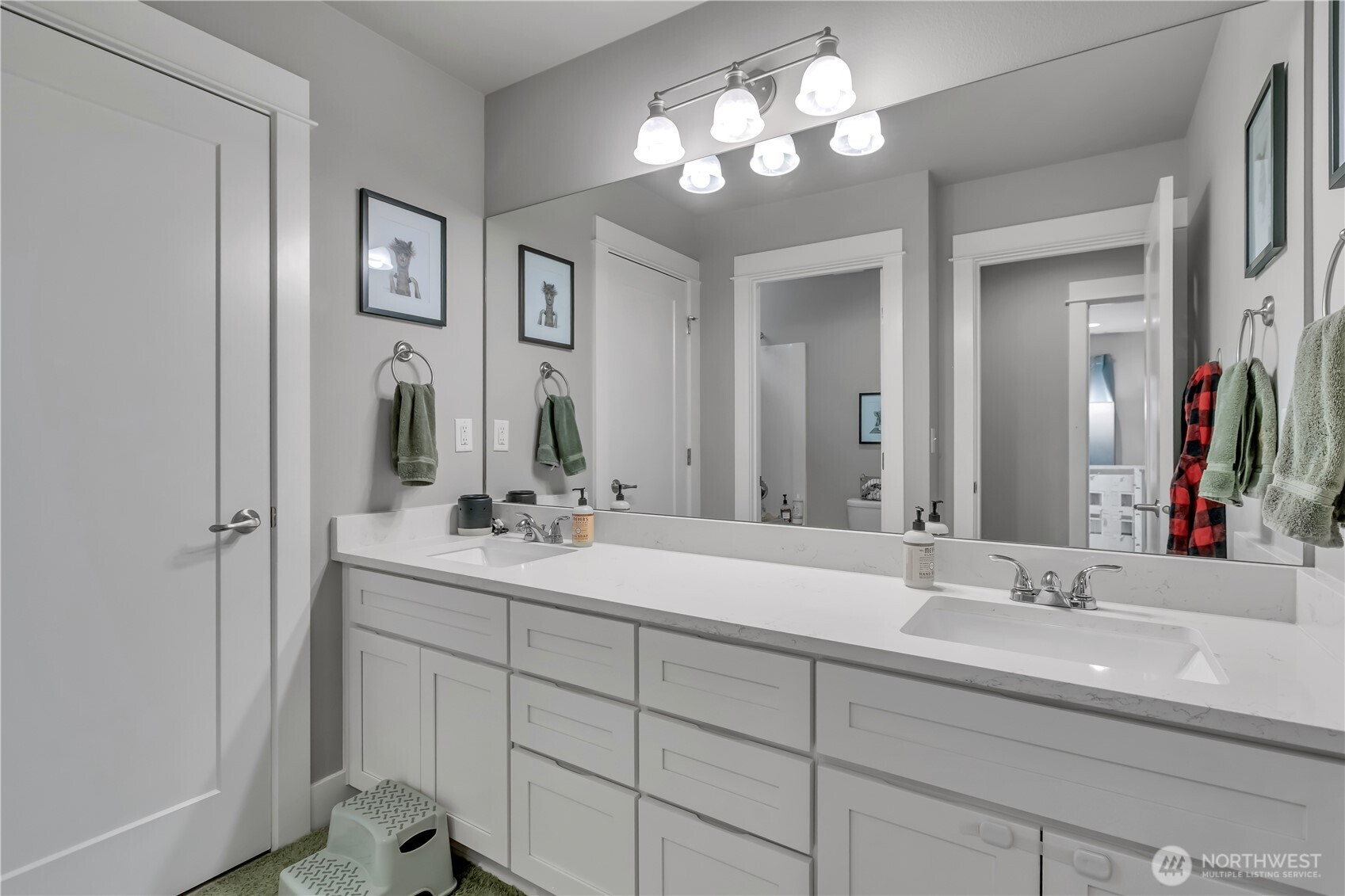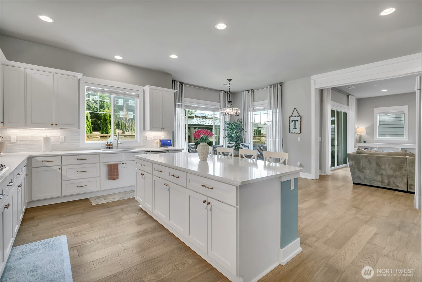 Set at the end of a quiet dead-end street beside a forested greenbelt, this impressive multi-level home offers a rare balance of privacy, style, and intention. A welcoming double-door entry opens to a seamless main-floor design, where a floor-to-ceiling stone fireplace anchors the Great Room and French sliders lead to an extended covered patio with its own fireplace—ideal for year-round entertaining. The kitchen is as functional as it is striking, featuring stainless appliances, a commercial-grade refrigerator, pot filler over the gas range, expansive island, and a walk-in pantry that rivals the size of most kitchens. A main-level fourth bedroom or office adds flexibility, complete with French doors to a private balcony. Upstairs, the grand primary suite offers a true retreat with a five-piece bath, dual vanities, and two closets. A large bonus room, two additional bedrooms, and an upstairs laundry room with ample counter space and cabinet storage complete the level. Not a stitch of carpet throughout; engineered hardwood & ceramic tile. ~ $40,000 in upgrades—primarily in professional landscaping—enhance the fully fenced backyard with artificial turf, pergola, and playset. A rooftop deck captures partial Mt. Rainier views and includes furniture. With central A/C, a 3-car garage, finished mudroom, Govee outdoor lights, and access to Tehaleh’s trails and parks in the Sumner-Bonney Lake School District, this home delivers.