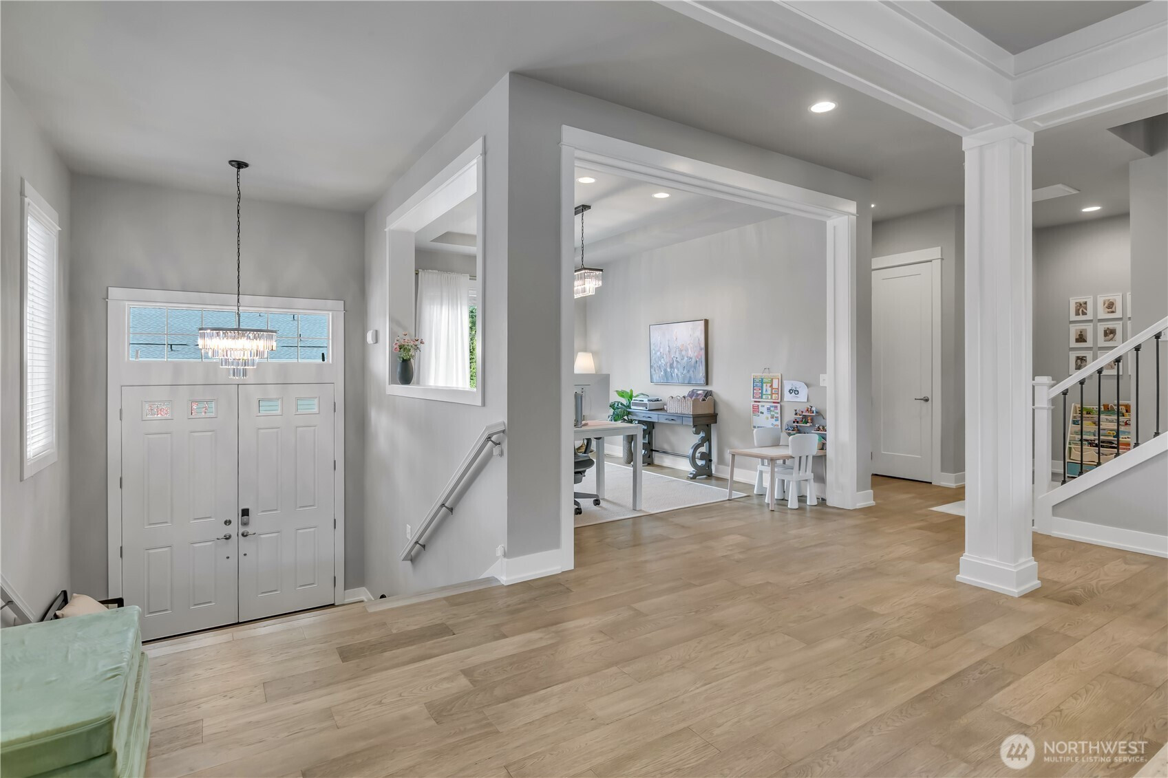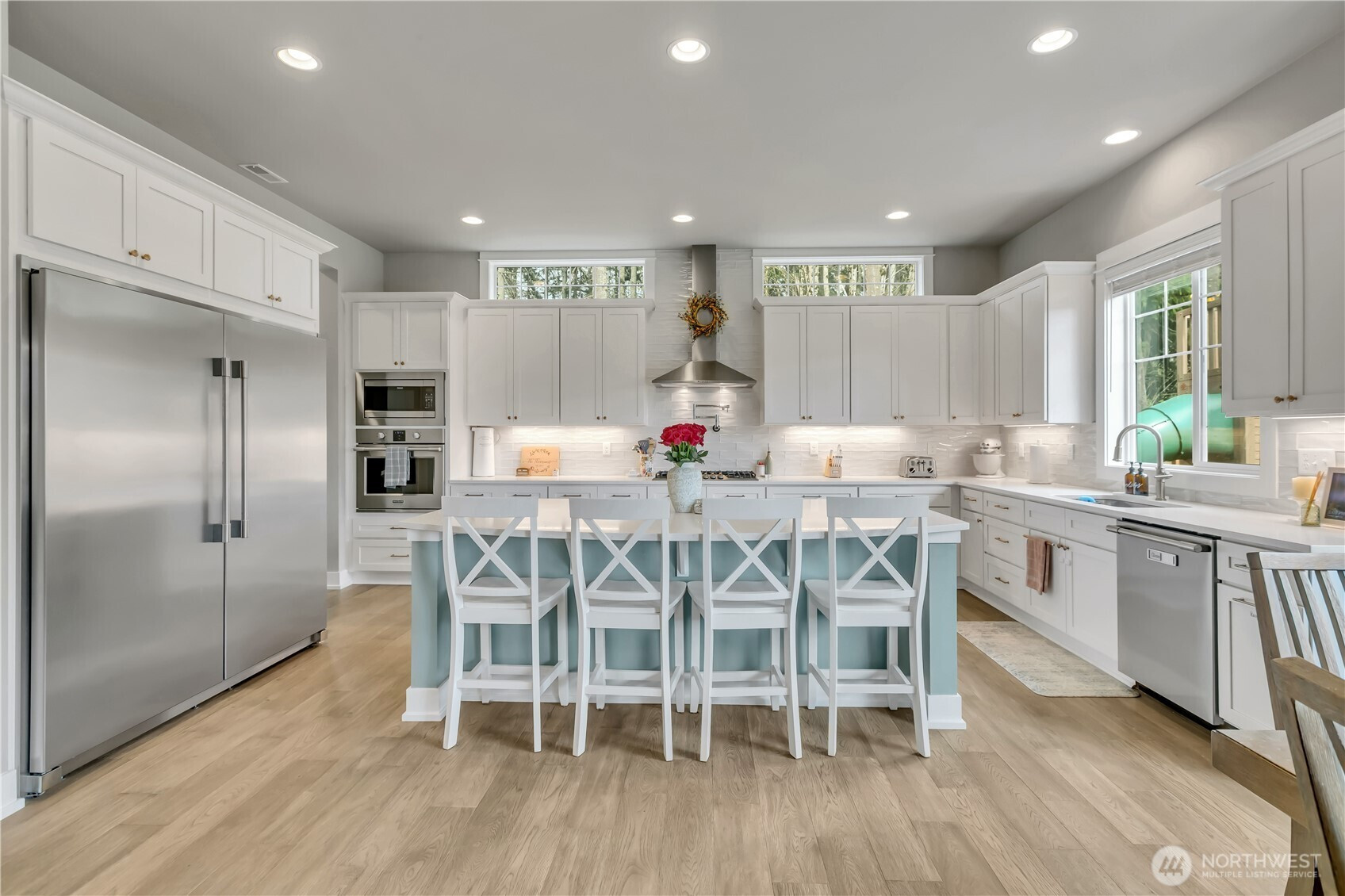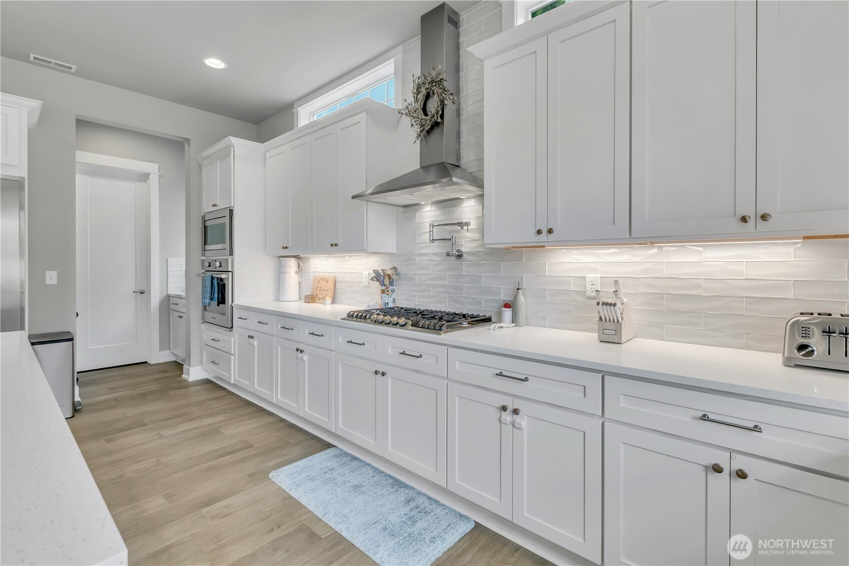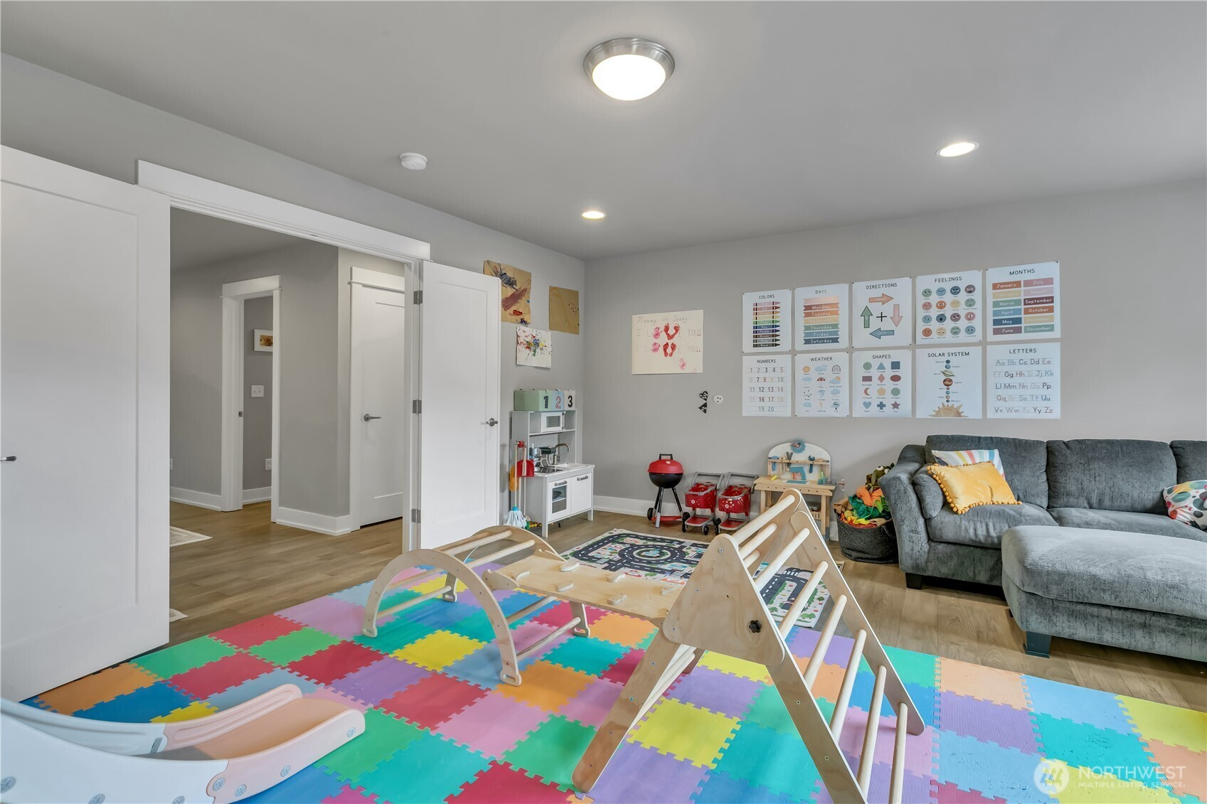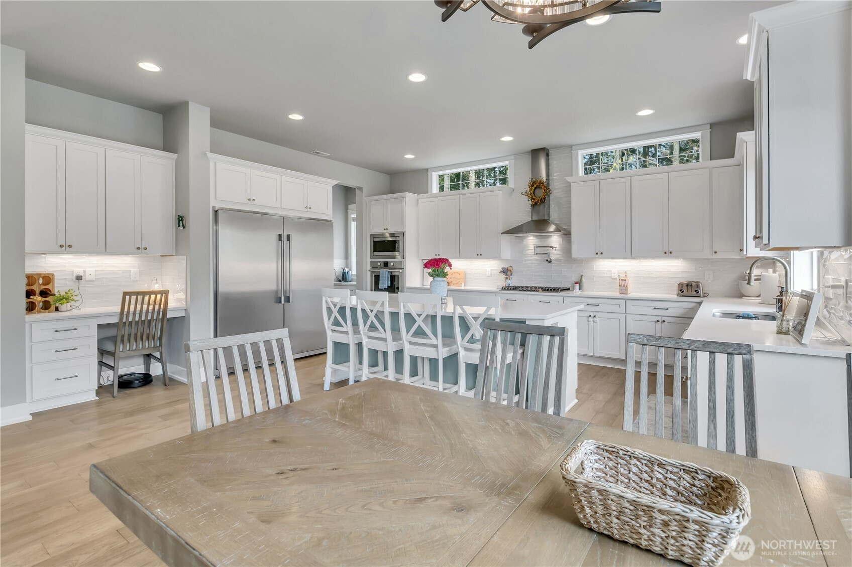 Set at the end of a quiet dead-end street beside a forested greenbelt, this impressive multi-level home offers a rare balance of privacy, style, and intention. A welcoming double-door entry opens to a seamless main-floor design, where a floor-to-ceiling stone fireplace anchors the Great Room and French sliders lead to an extended covered patio with its own fireplace—ideal for year-round entertaining. The kitchen is as functional as it is striking, featuring stainless appliances, a commercial-grade refrigerator, pot filler over the gas range, expansive island, and a walk-in pantry that rivals the size of most kitchens. A main-level fourth bedroom or office adds flexibility, complete with French doors to a private balcony. Upstairs, the grand primary suite offers a true retreat with a five-piece bath, dual vanities, and two closets. A large bonus room, two additional bedrooms, and an upstairs laundry room with ample counter space and cabinet storage complete the level. Not a stitch of carpet throughout; engineered hardwood & ceramic tile. ~ $40,000 in upgrades—primarily in professional landscaping—enhance the fully fenced backyard with artificial turf, pergola, and playset. A rooftop deck captures partial Mt. Rainier views and includes furniture. With central A/C, a 3-car garage, finished mudroom, Govee outdoor lights, and access to Tehaleh’s trails and parks in the Sumner-Bonney Lake School District, this home delivers.
