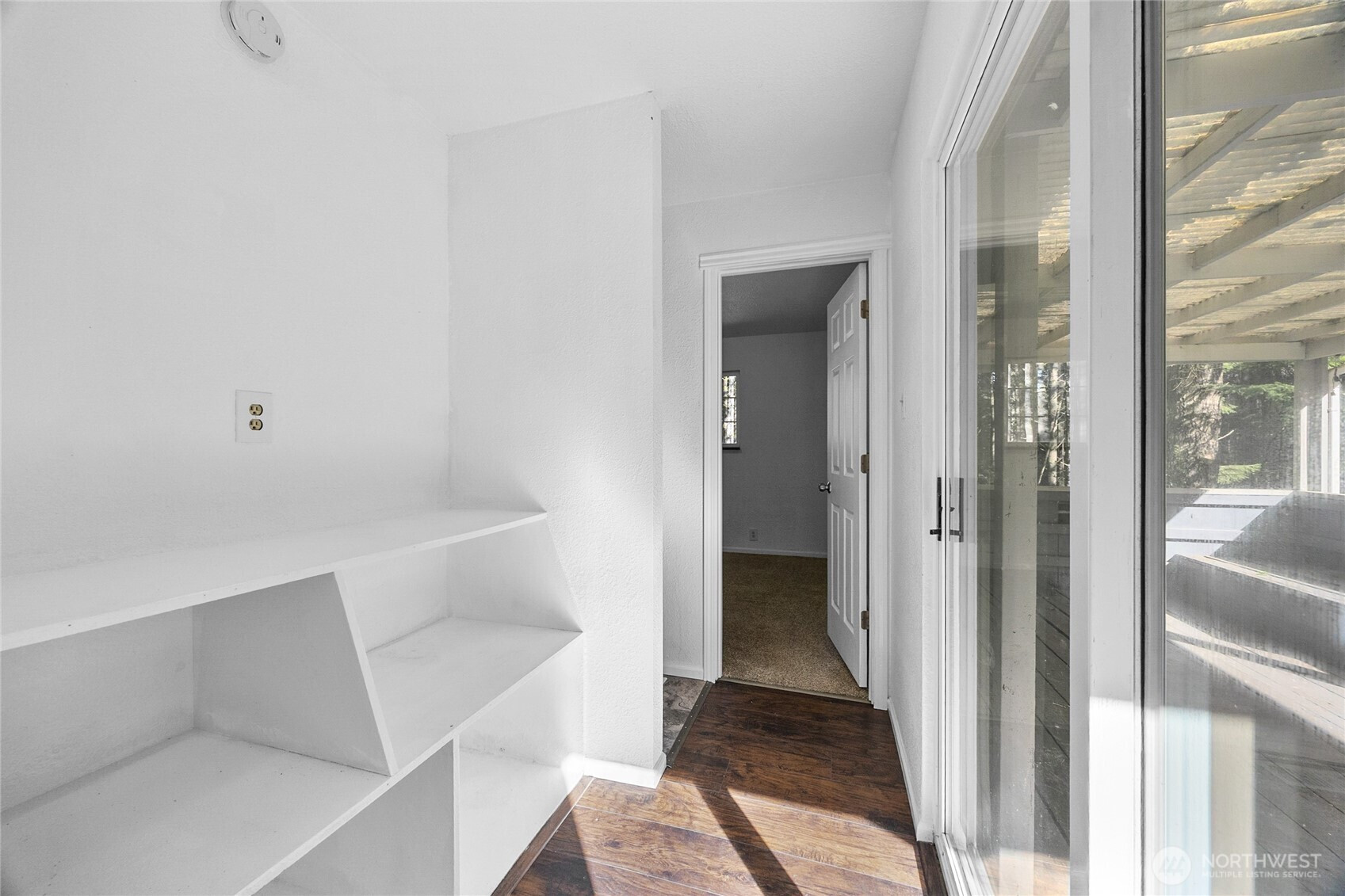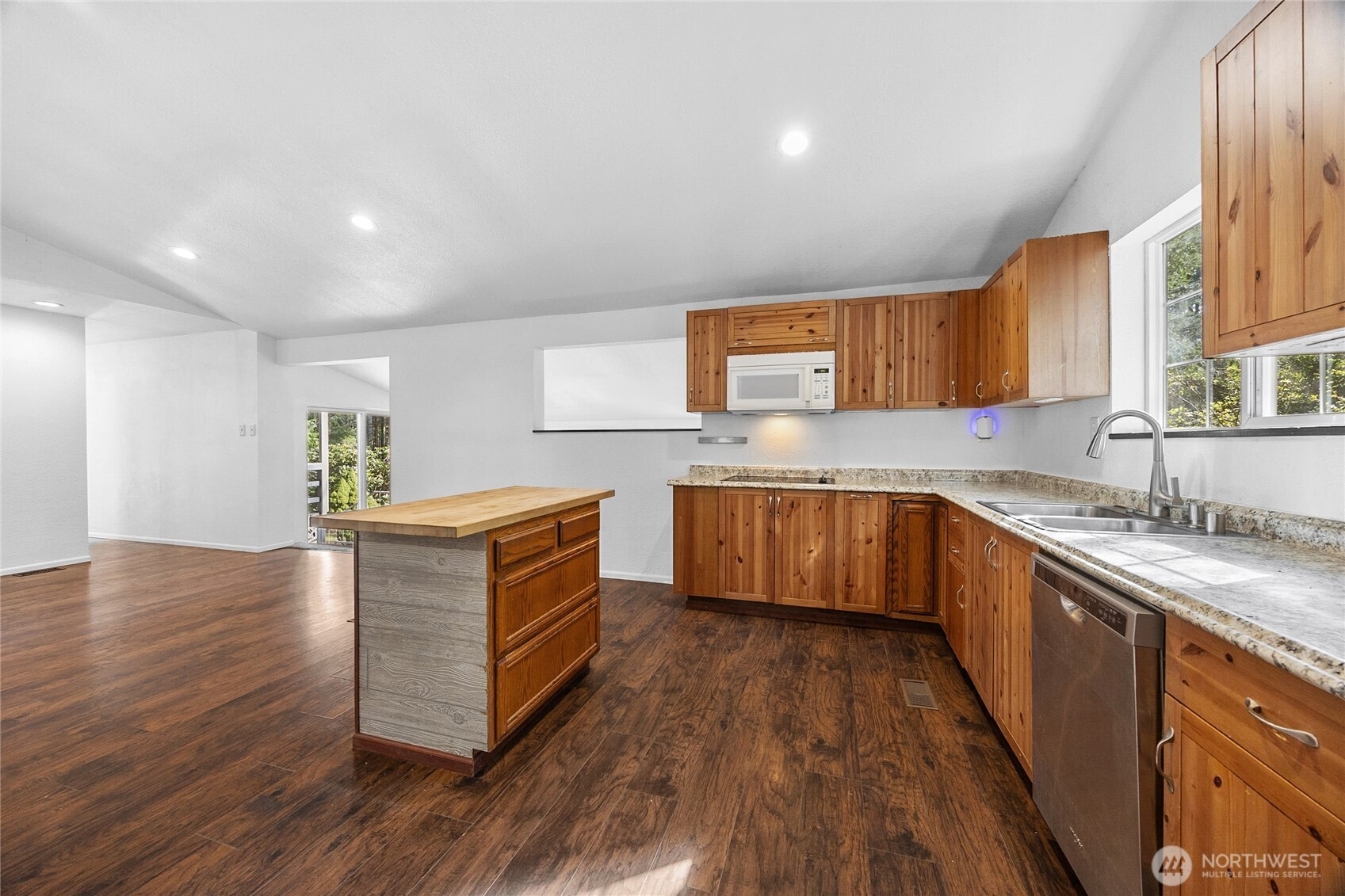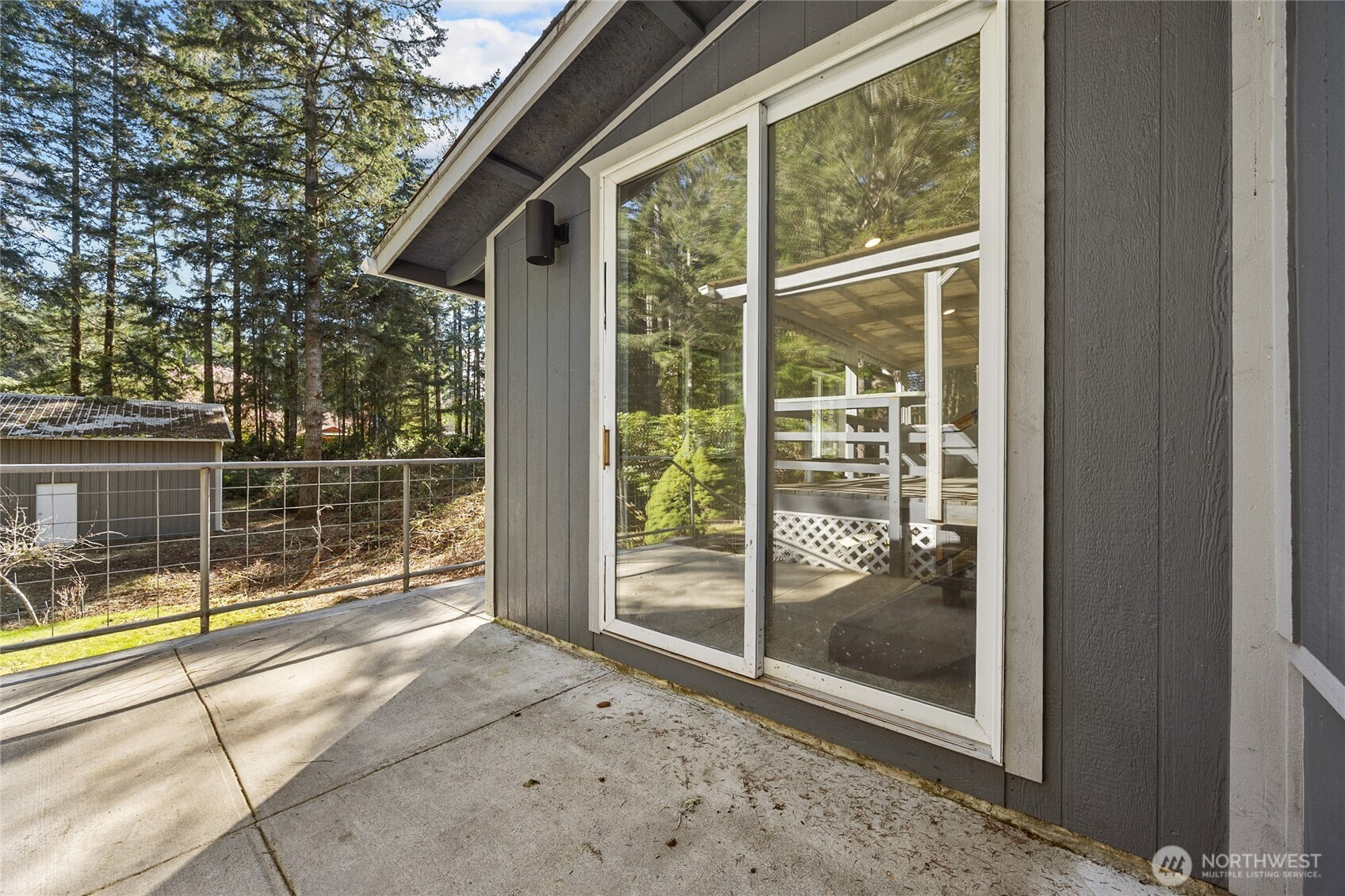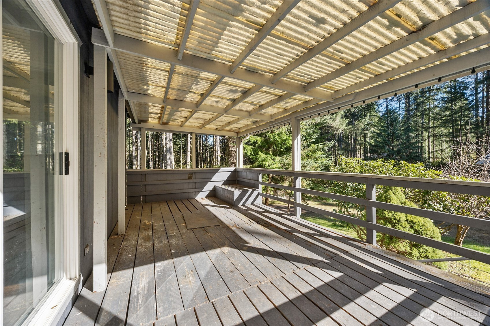 Tucked behind a gated entry on a beautiful, private wooded lot, this Lakebay property offers a peaceful setting surrounded by mature trees and natural beauty, along with ample RV parking for added flexibility. Step inside to find dark vinyl plank flooring that flows throughout the main living areas, complemented by abundant natural light streaming through the windows. Living space opens into a warm and functional kitchen featuring knotty pine cabinetry, a rustic island with built-in drawers for added storage, and a double oven. Primary bedroom offers a 3/4 bathroom, and an additional bedroom offers a unique retreat with direct access to a built-in deck, creating a quiet outdoor escape. A covered deck porch extends your living space year-round, ideal for relaxing and enjoying the tranquil surroundings. Outside, the property continues to impress with two versatile outbuildings: a 23’ x 18’ shop with power and a door for easy access, and a spacious 37’ x 30’ garage offering ample storage or workspace (no power). A rare combination of privacy, functionality, and natural charm—this property is ready to fit a variety of lifestyles.