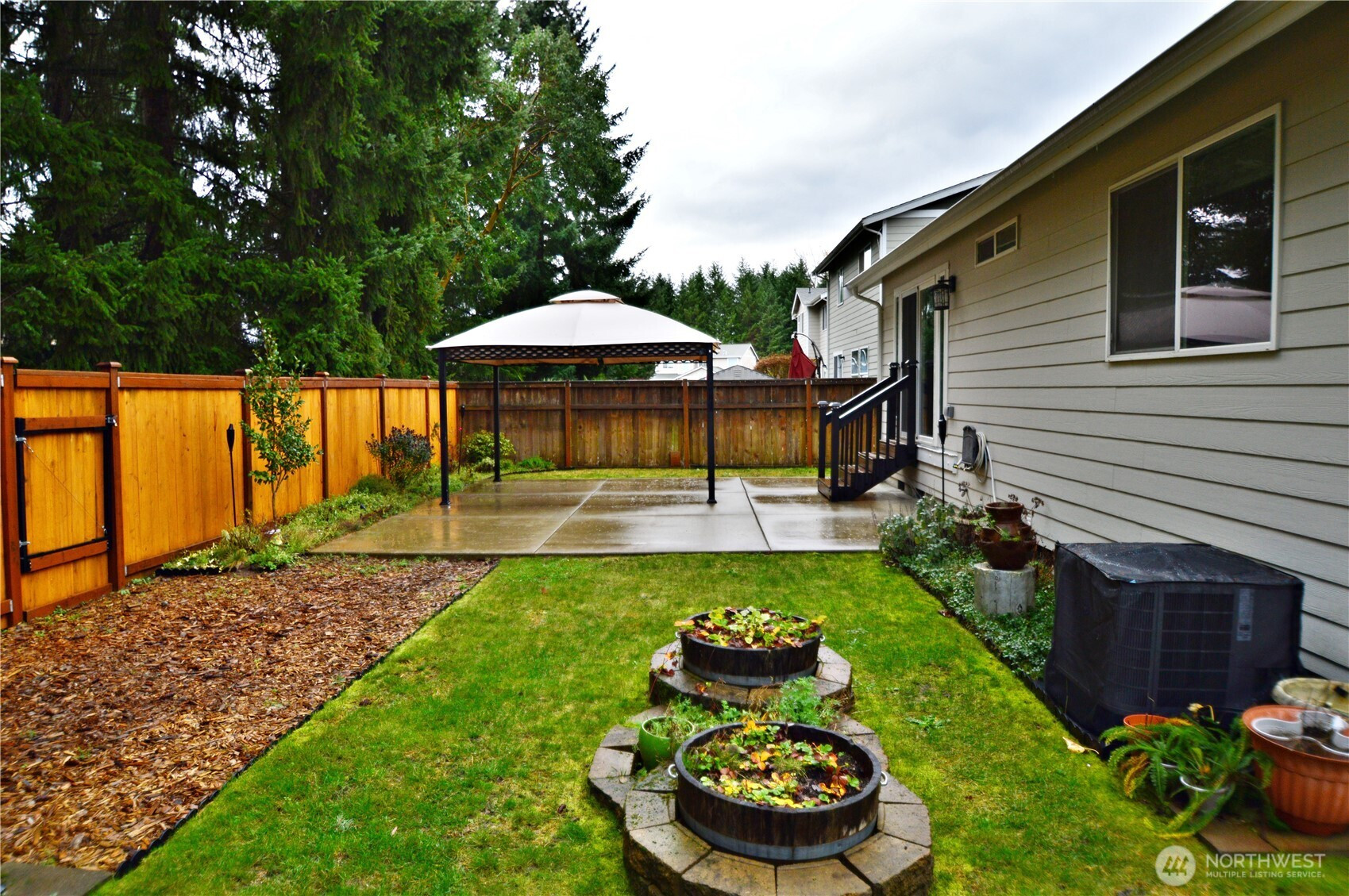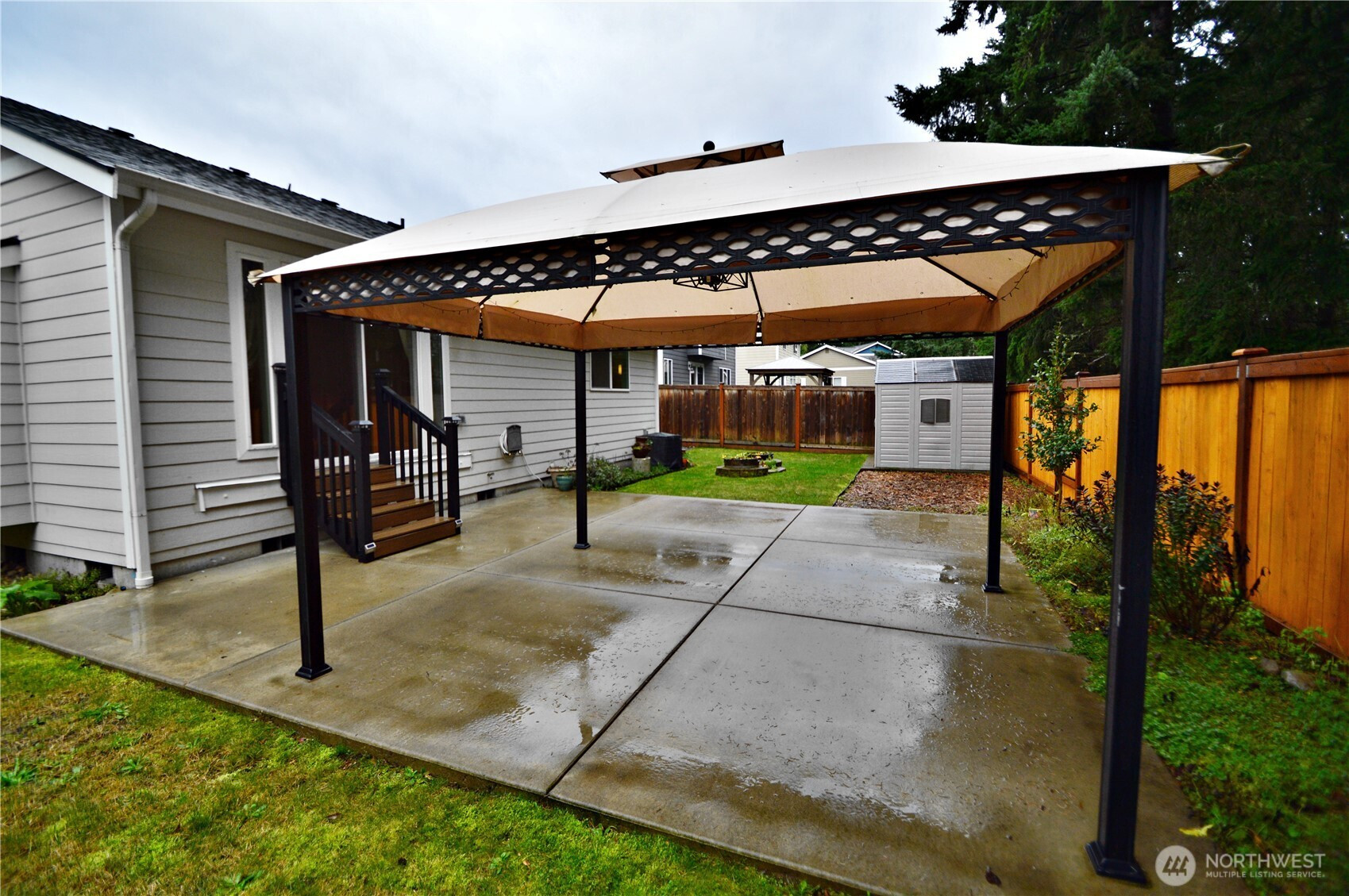 Price to sell! Desirable gated neighborhood (The Buttes) sitting above the Orting Valley and backs up to a green belt in the back yard for Privacy. Open Great Room concept has a vaulted ceiling, a gas fireplace for enjoying those cold winter nights. A bright kitchen w/ample counter space, multiple cabinets, & all the SS appliances stay! Spacious Primary Bedroom includes a Walk-in closet & its own bath w/double sinks. Good sized Secondary bedrooms are near main bath. Fenced back yard with features oversized patio, gazebo for entertaining, garden beds and a newer shed for extra storage. Fenced RV parking! This home won't last.