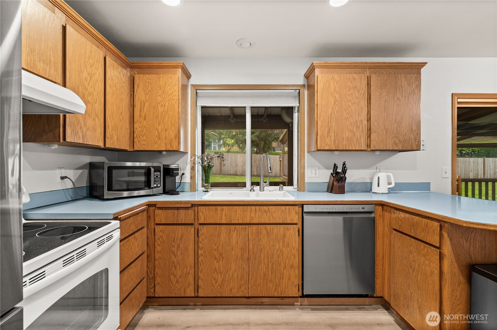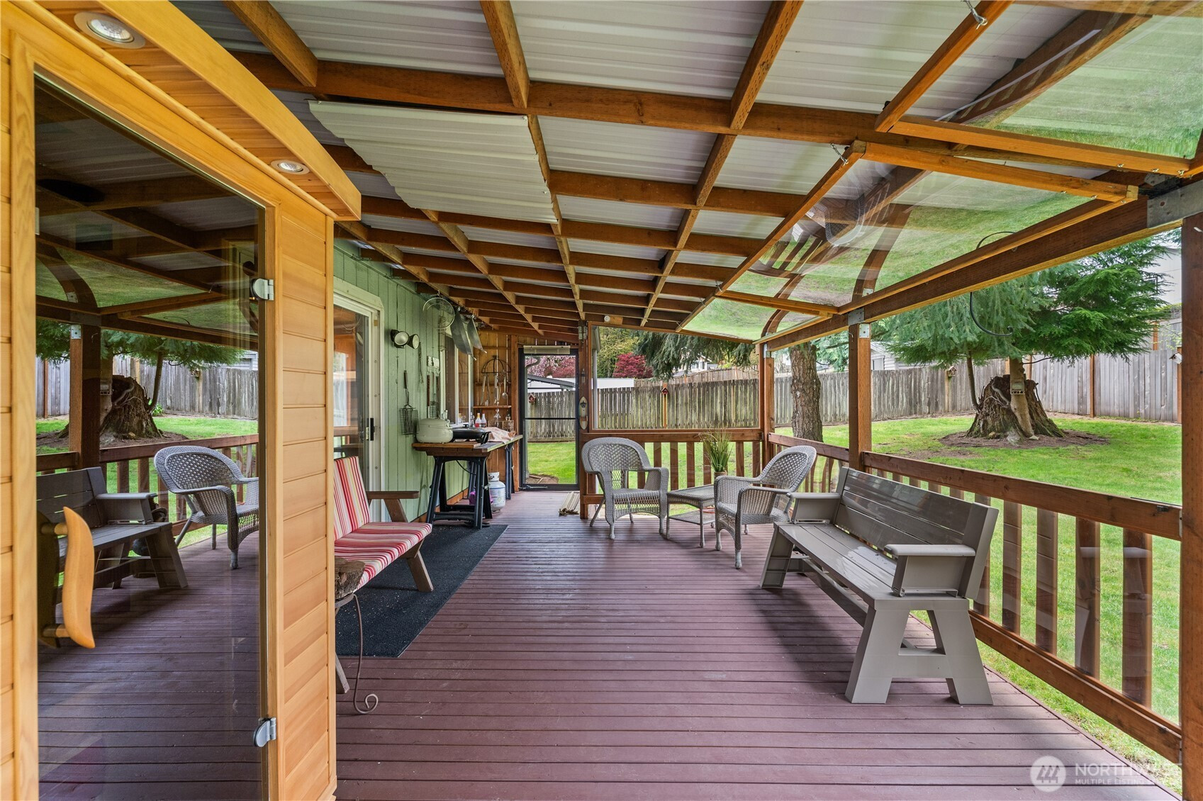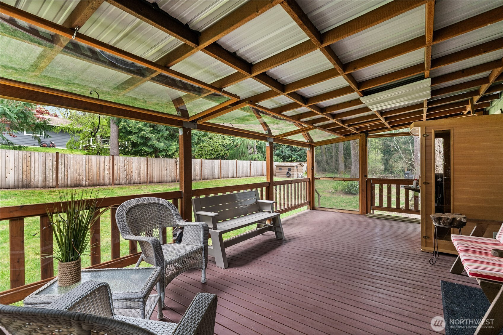 Welcome home to this beautifully updated 3-bedroom, 2-bath home situated on a spacious half-acre lot, offering comfort, functionality, and room to breathe. Thoughtfully designed, the home features a desirable layout with a large primary suite on one end, complete with a full bathroom and walk-in closet, while two additional bedrooms and a second full bath are located on the opposite side for added privacy. At the heart of the home, you’ll find a cozy living room, with vaulted ceilings, that flows seamlessly into the sizable kitchen with dedicated eating and dining space, perfect for everyday living and entertaining. Step outside to the expansive covered deck, designed for year-round enjoyment with adjustable windows that open and close, creating the perfect indoor-outdoor experience. Recent updates include new LVP flooring and fresh interior paint, providing a modern and move-in ready feel. The home is equipped with a durable 40-year roof installed just 7 years ago. Additional features include a large attached garage, RV parking, designated laundry room, and your very own sauna, perfect for relaxing after a long day. Ideally located near schools, parks, shopping, restaurants, and entertainment, this property offers the perfect blend of peaceful living with convenient access to everything you need.