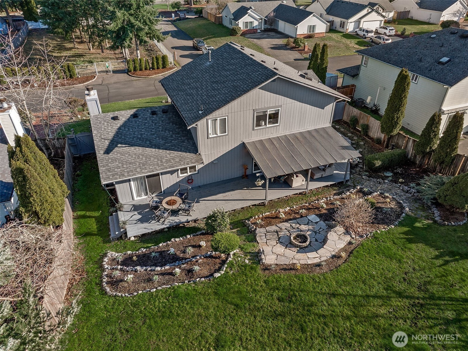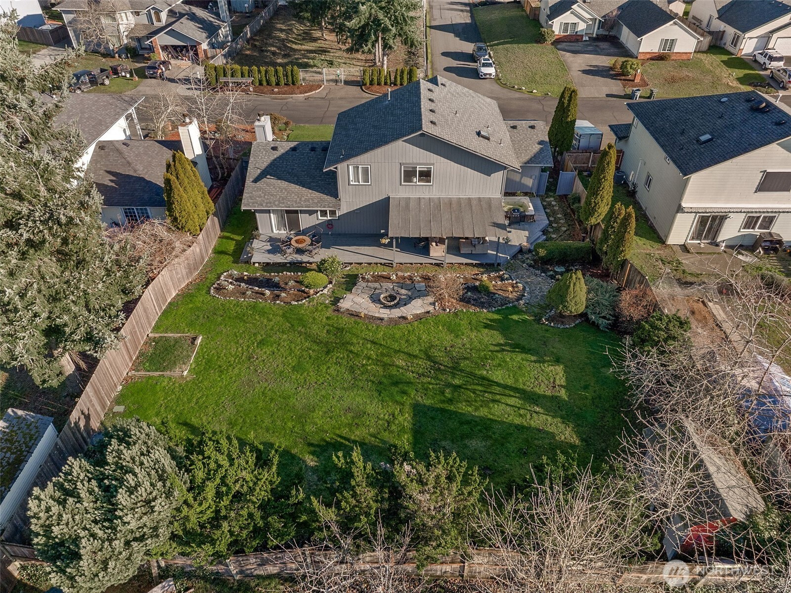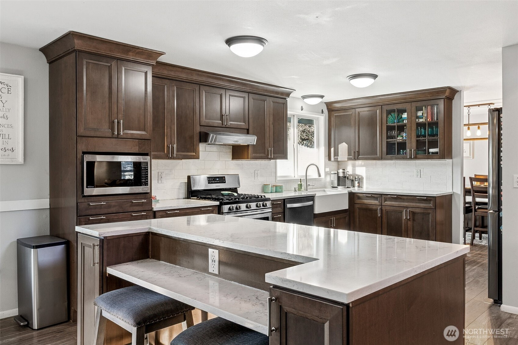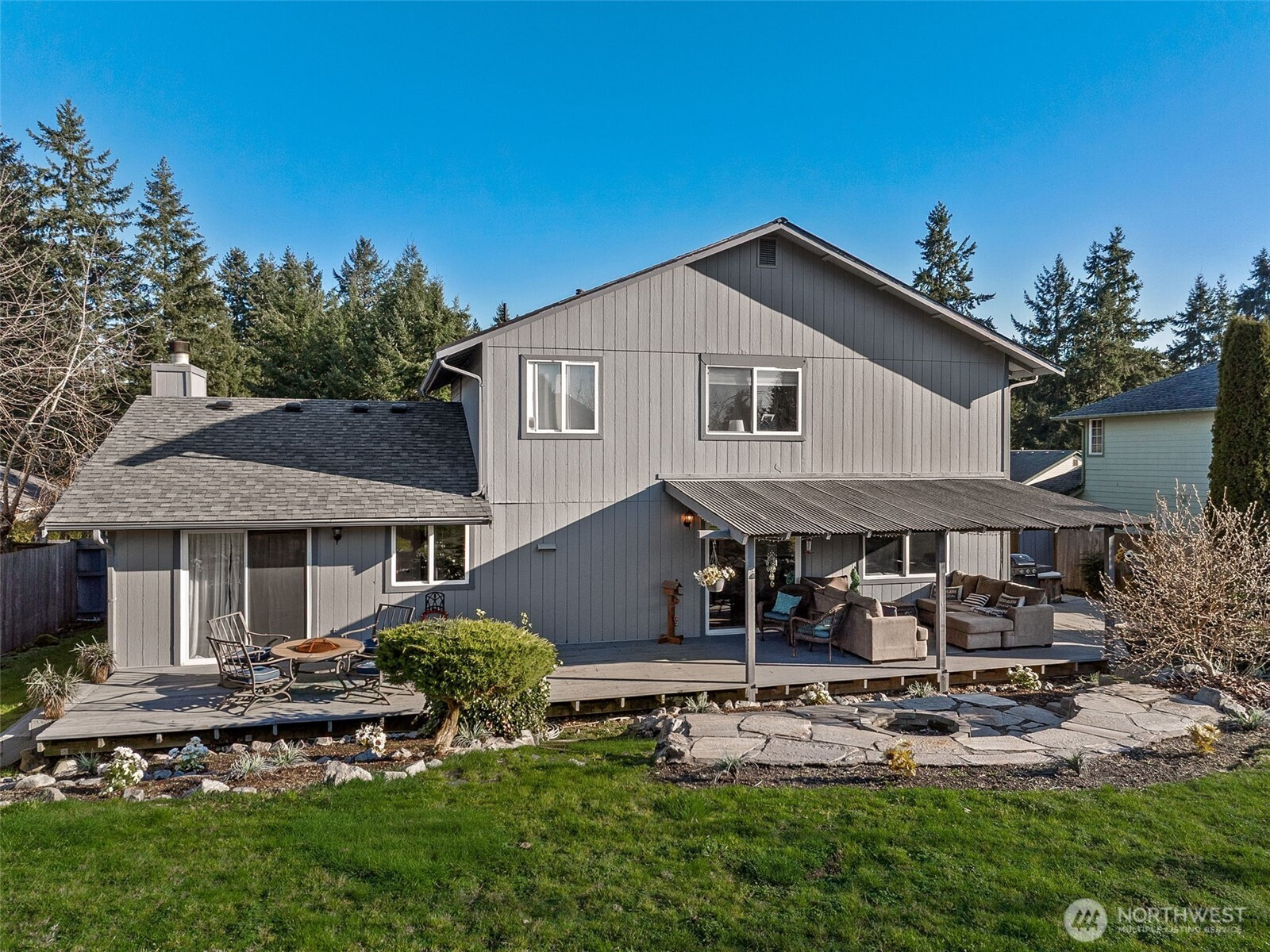 Welcome to this beautifully refreshed home on .25 acres in the sought after English Woods community! This home boasts ALL NEW exterior paint, accent stone, garage doors, gas hot water heater, interior paint, door hardware, and light fixtures, offering true move-in readiness. The main floor showcases durable laminate flooring, a cozy living room with fireplace, and a dining room with sliding doors to the backyard deck—perfect for indoor/outdoor living. The chef’s kitchen impresses with custom cabinetry with Crown Molding to ceiling, quartz countertops, full-height subway tile backsplash, farm sink, custom island with seating, and all stainless-steel appliances included—highlighted by a gas range and trash compactor. A separate family room with deck access, plus a main-floor laundry room with ceramic tile floors and washer & dryer included, add everyday convenience. Upstairs, the primary suite offers a ceiling fan, large walk-in closet, and a luxurious 5-piece bath. Two additional spacious bedrooms share a ¾ guest bath with ceramic tile floors. Outside, enjoy a terraced yard with a covered deck, firepit, outbuilding/shed, and doghouse—ideal for entertaining and relaxation. 3-car garage and pre-wiring for a generator!