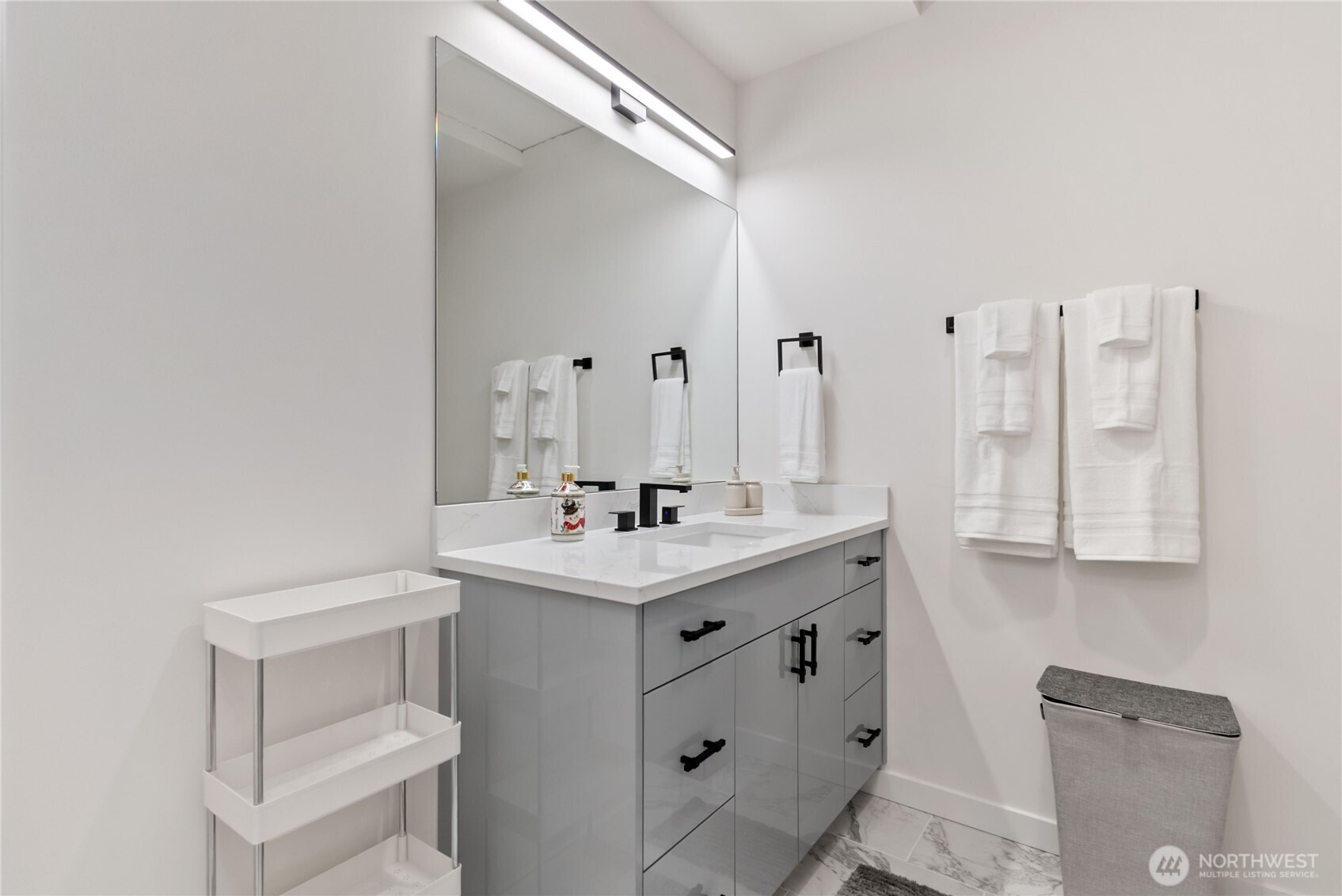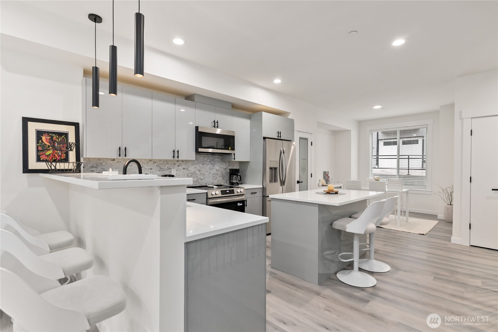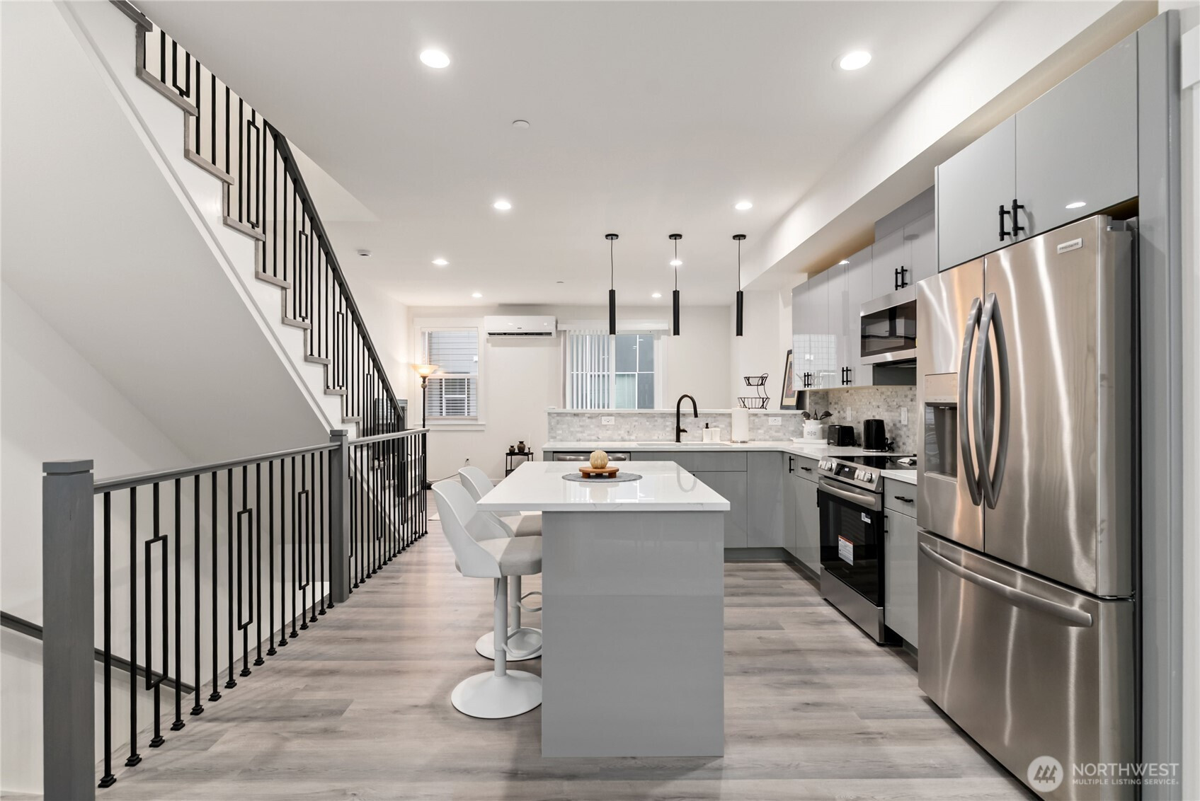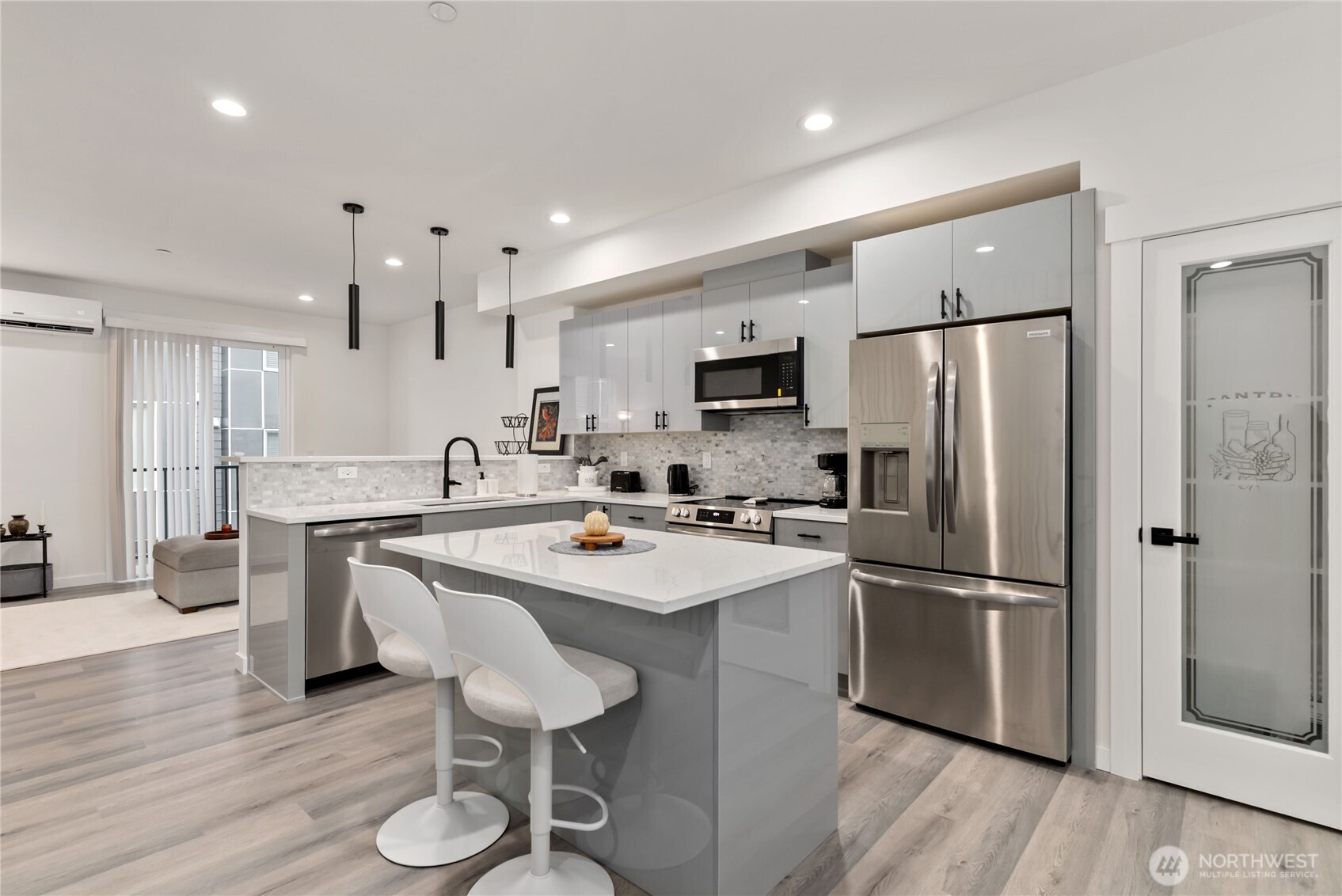 Brand-new 3-level condo in Central Tacoma featuring two primary bedrooms with private baths and an additional guest powder room. Modern, light-filled living area with large windows and private balcony. Stylish kitchen includes flat-panel gloss cabinets, quartz countertops, tile backsplash, island, and extended bar seating. Home comes complete with washer/dryer, window blinds throughout, metal stair railings, and generous closet space. Spacious 2-car tandem garage with utility room provides extra storage and convenience. Fantastic location close to downtown Tacoma, hospitals, parks, shopping, and freeway access. Low-maintenance, contemporary living at its best! Builder 1 year warranty