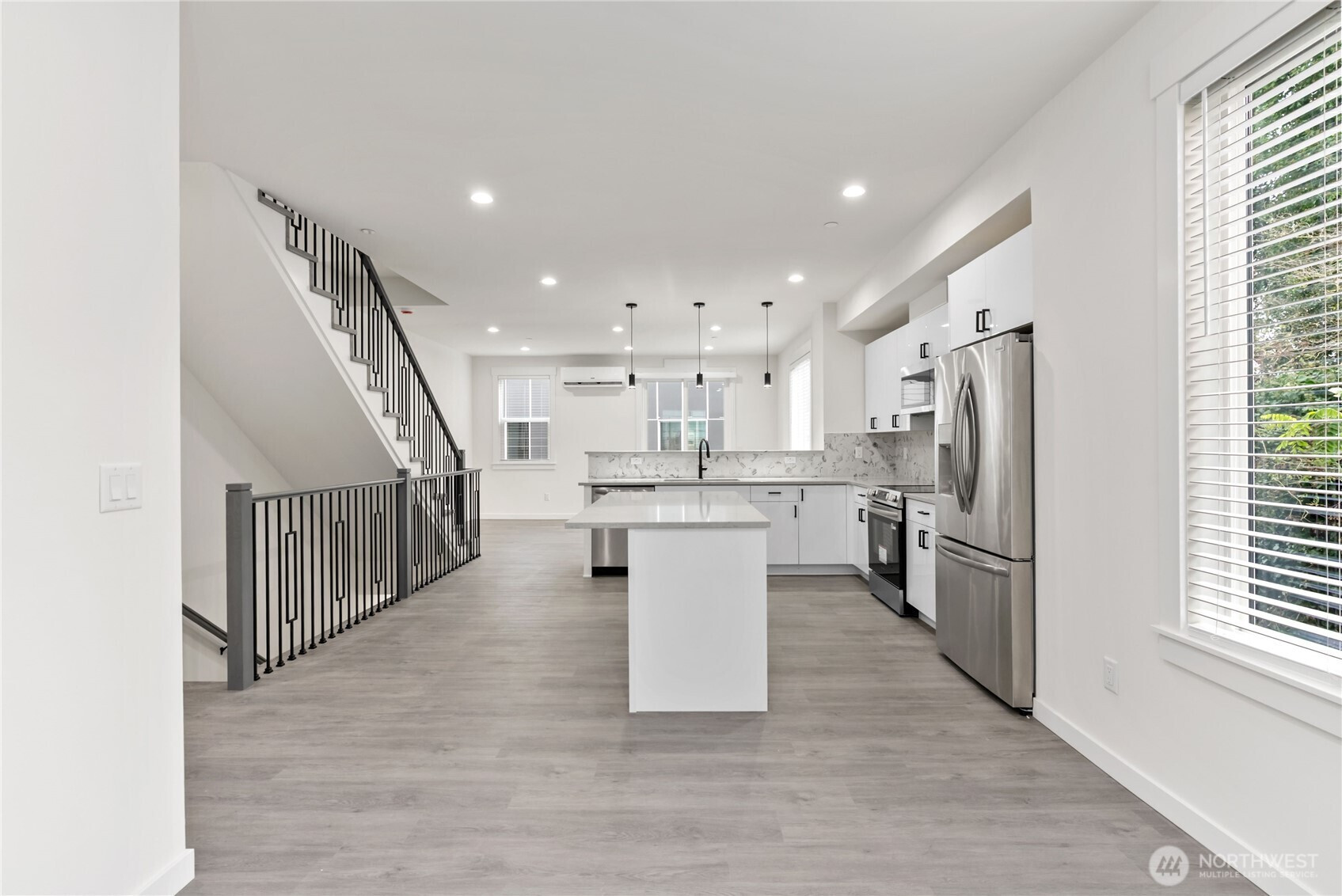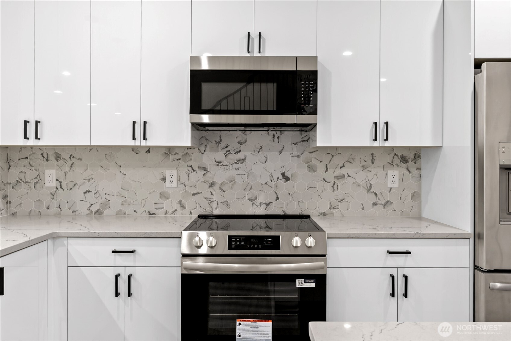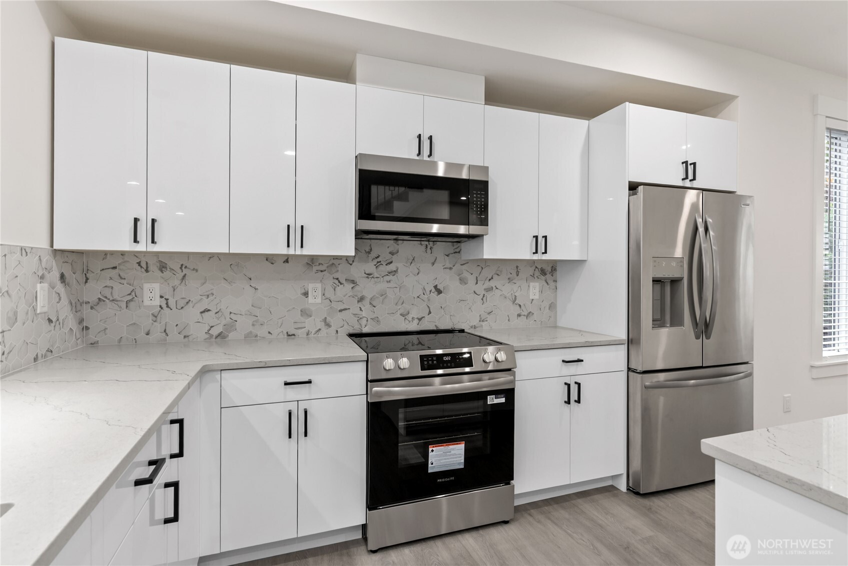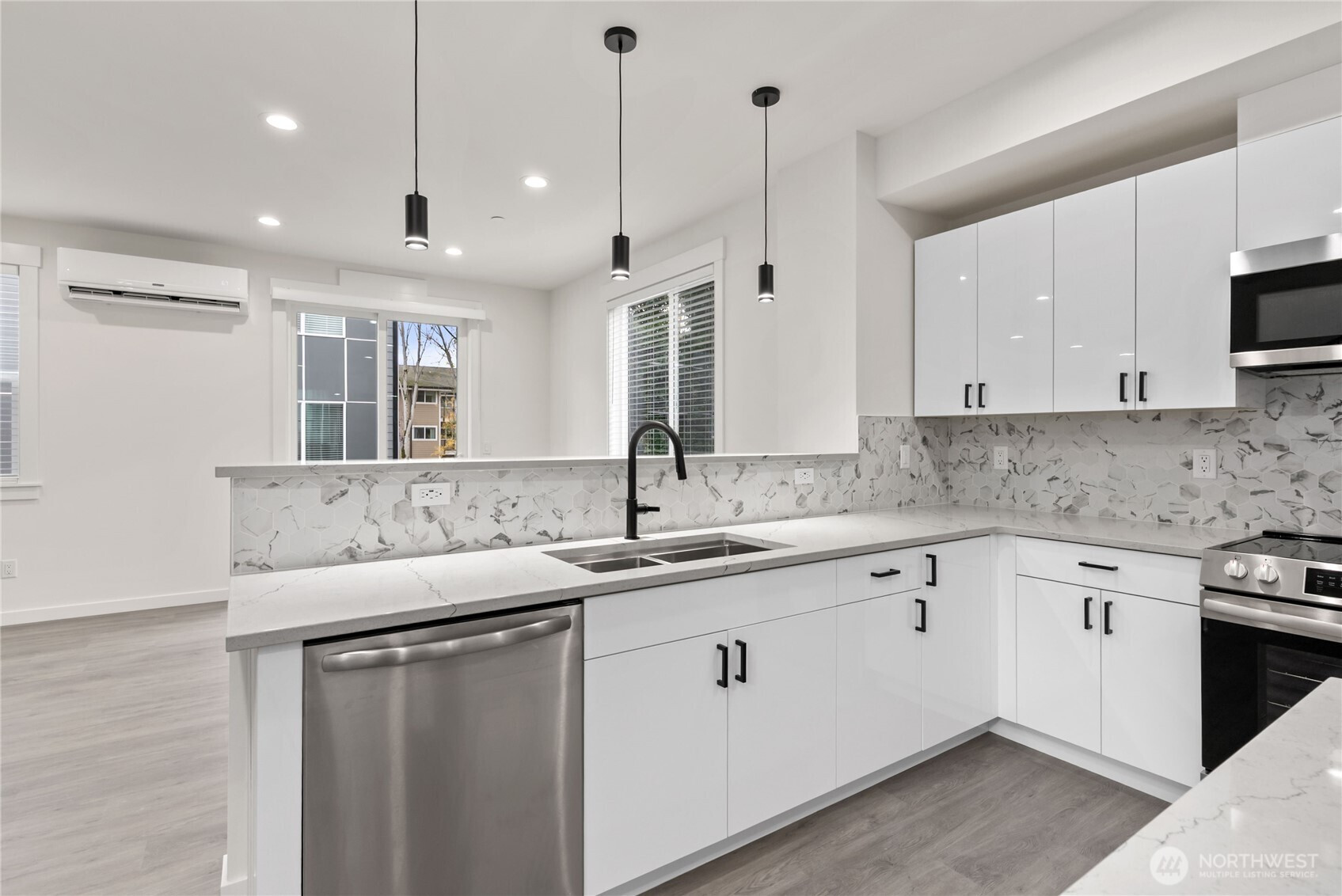 Brand-new 3-level condo in Central Tacoma featuring 3 bedrooms and 2.5 baths, including a spacious primary suite. Modern, light-filled living area with large windows and private balcony. Stylish kitchen includes flat-panel gloss cabinets, quartz countertops, tile backsplash, island, and extended bar seating. Home comes complete with washer/dryer, window blinds throughout, metal stair railings, and generous closet space. Spacious 2-car tandem garage with utility room provides extra storage and convenience. Fantastic location close to downtown Tacoma, hospitals, parks, shopping, and freeway access. Low-maintenance, contemporary living at its best! Builder 1 year warranty.