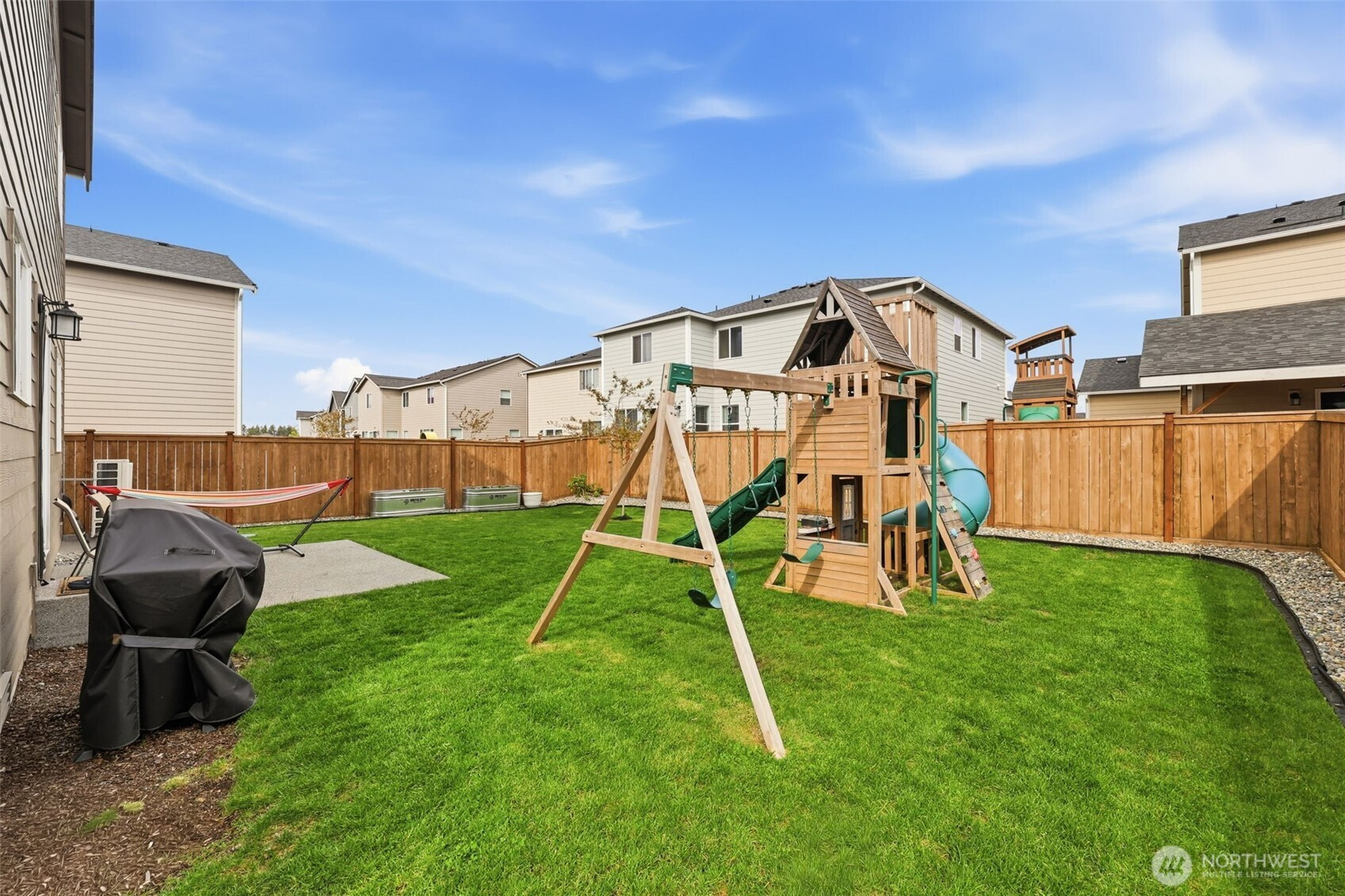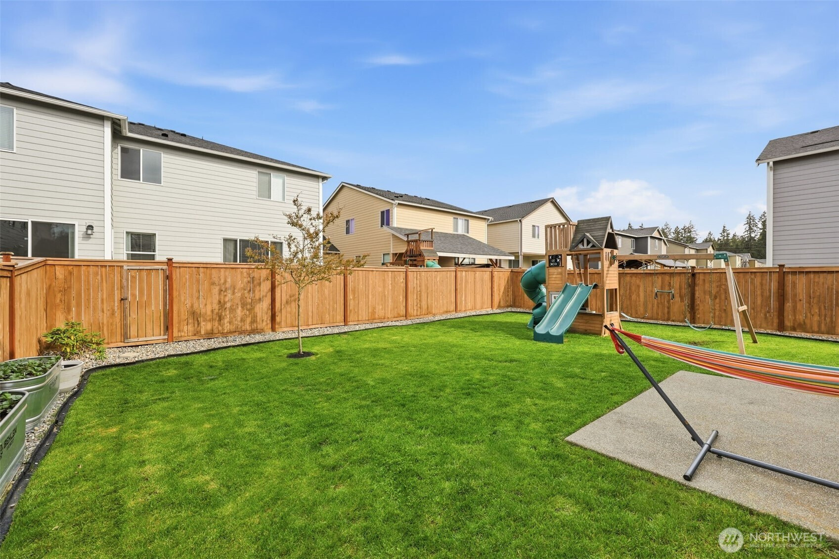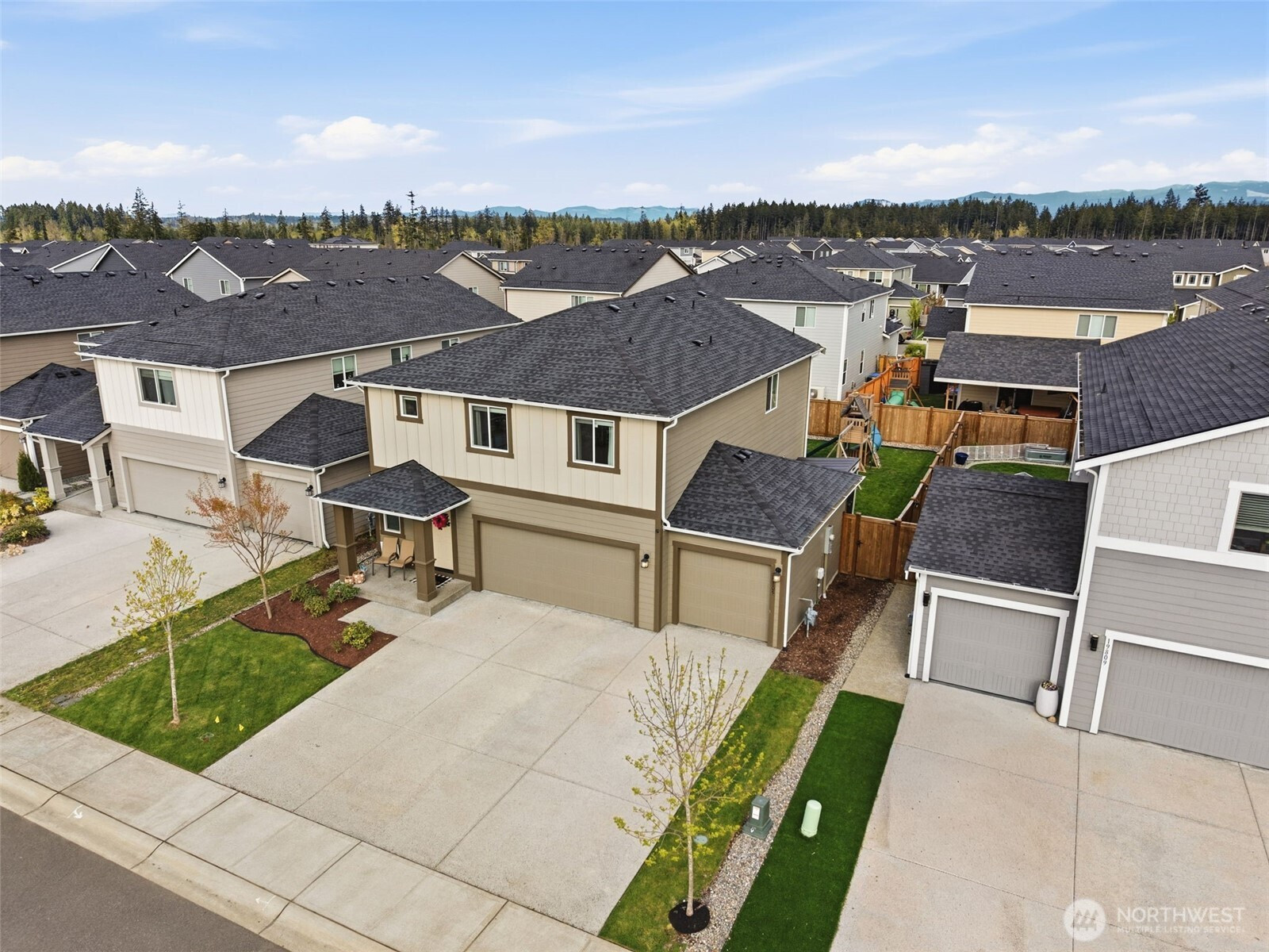 Welcome home! This like-new, 4-bed, 2.5 bath, 2,121 sq ft Merlot floorplan in the Daybreak community, located directly across from the neighborhood playground, is the one you've been looking for. Open-concept main level connects living, dining, and kitchen with quartz countertops throughout, a large island, pantry, and natural gas connected. Interior includes added board and batten wall detail, designer wallpaper accents, and updated finishes beyond builder standard. Upper level includes all bedrooms, including primary suite with upgraded closet system and en suite bath, plus loft/flex space and full bath. 3-car garage with EV charging capability. Fully fenced yard with a defined outdoor space and permanent outdoor lights gives you the perfect oasis right on your back porch. Conveniently located between Orting, Graham, and Puyallup.