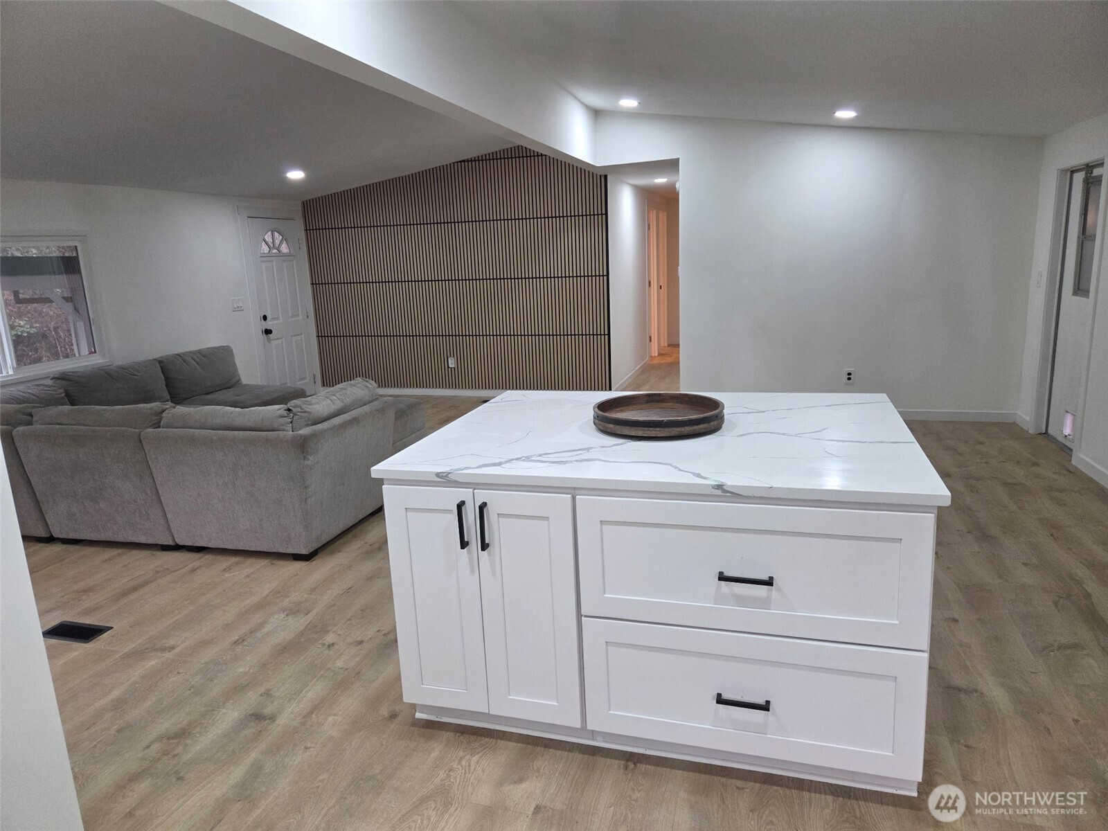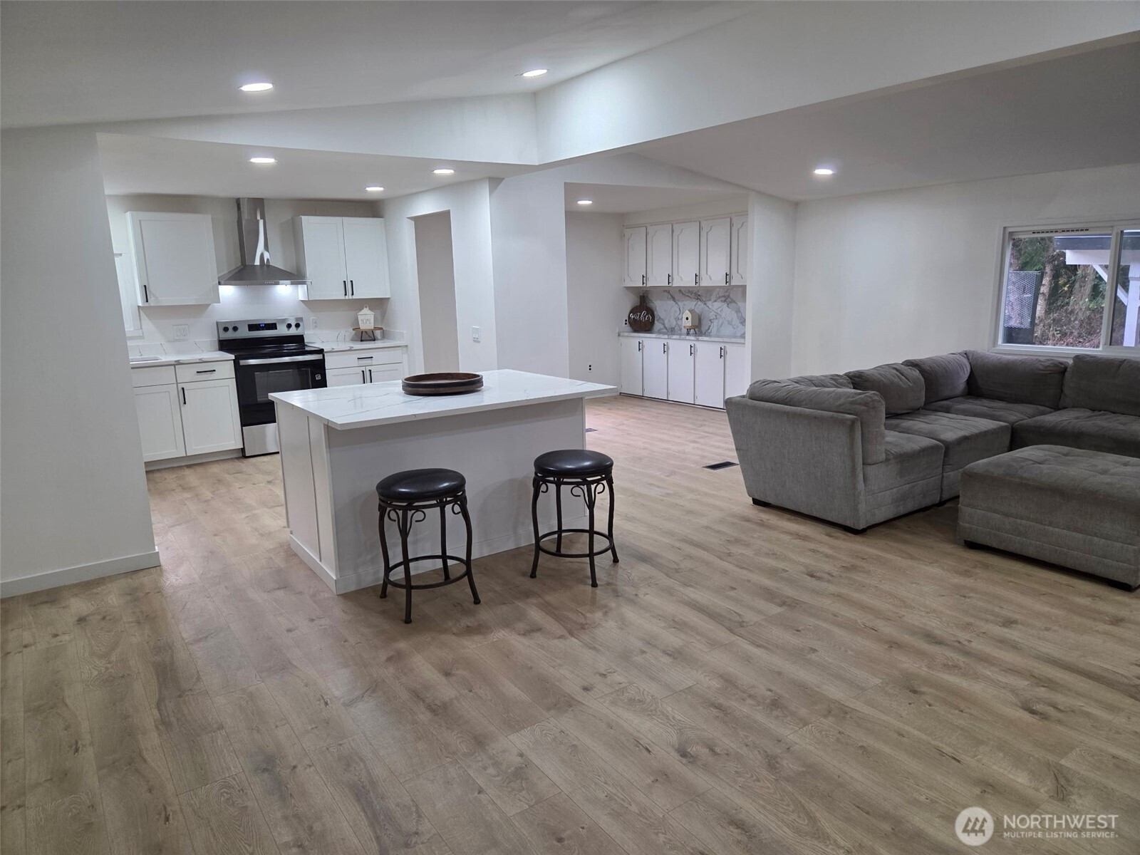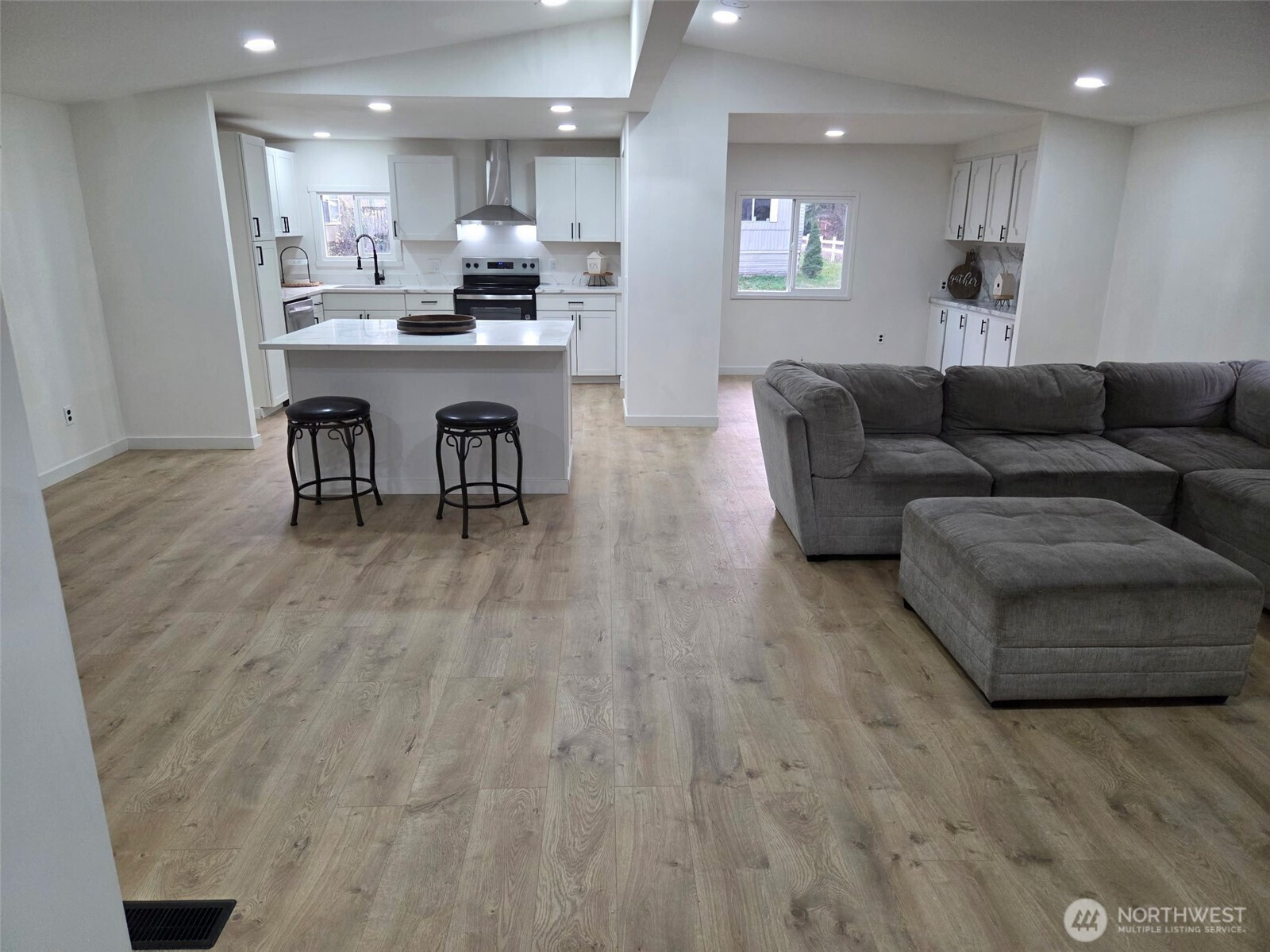 Beautifully remodeled manufactured home offering a bright, open floor plan with vaulted ceilings and recessed lighting. The stunning kitchen showcases quartz countertops, a quartz island breakfast bar, and modern finishes, complemented by LVP vinyl flooring throughout. This home features 3 bedrooms and 2 full bathrooms with thoughtful updates. Step outside to a large wood porch, perfect for entertaining or relaxing, and enjoy the convenience of a carport and storage shed. Stylish, functional, and move-in ready. No age restriction.