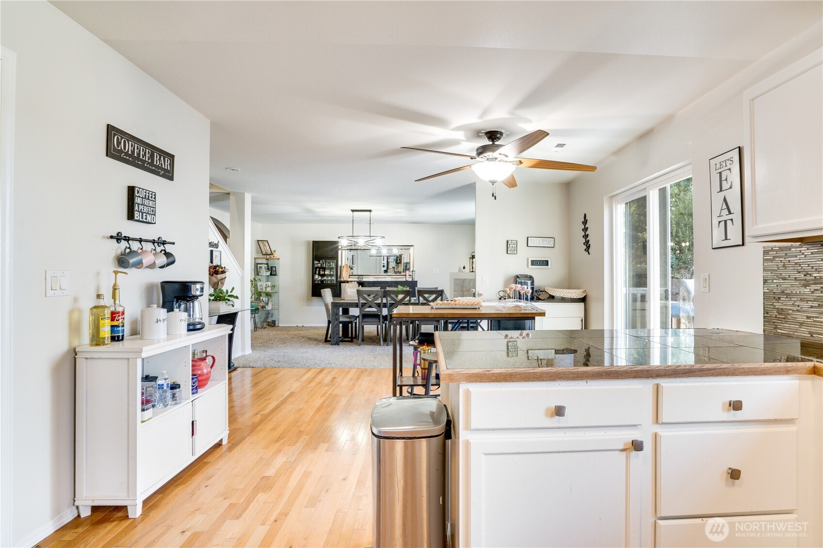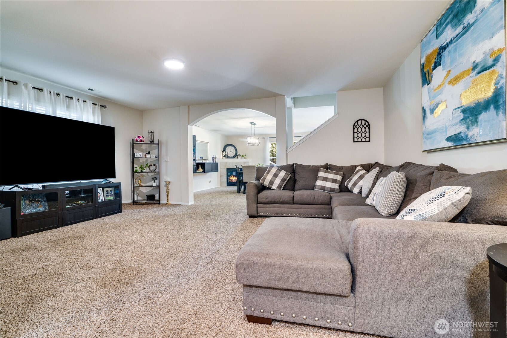 Beautiful nearly 3,000 SF Spanaway home in the Nancy Estates! This well-maintained 4 bed, 2.5 bath residence offers a spacious, functional layout with plenty of room to grow. The main level features a welcoming front living room, a sunny dedicated office/gym or potential 5th bedroom, huge walk-in pantry and an open concept dining room with gas fire place. The kitchens been updated with granite tile countertops, paint, stainless appliances, modern fixtures, and a seamless flow into the dining area. Upstairs you’ll find all four bedrooms, a full laundry room, and an oversized rec room. Each bedroom is positioned at a corner of the home for added privacy, while the XL primary suite is thoughtfully separated. Primary suite includes double sinks, a soaking tub, open space, and a large walk-in closet. Enjoy tall ceilings, recessed lighting, and generous living spaces throughout. Step outside to a huge deck and an expansive patio perched above the hill just in time for spring and summer BBQs. Conveniently located near JBLM, McChord Air Force Base, shopping, dining, and year-round PNW recreation. Don’t miss this one!