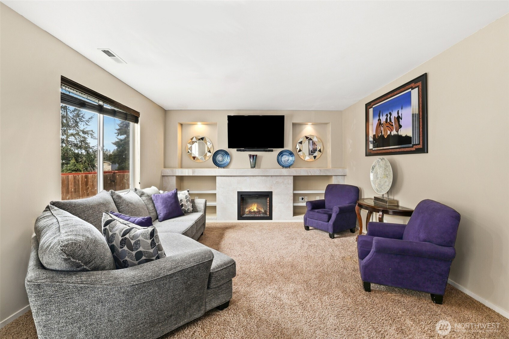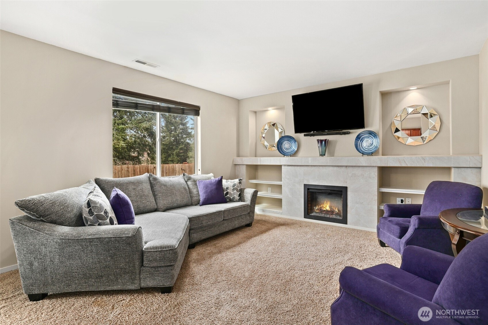 Built in 2013 and impeccably maintained by its original owner, this turnkey Spanaway home offers space, style, and functionality! Featuring 4 bedrooms + office & 2.5 baths, there’s room for everyone to live comfortably. The main level features an updated kitchen with quartz countertops, tiled backsplash, and a newer stainless steel appliance package, all flowing seamlessly into the open-concept living room anchored by a striking fully tiled fireplace. An additional main-floor room provides flexibility for a home office, playroom, or guest bedroom. Upstairs, unwind in a truly expansive primary retreat — double the size of most — complete with two closets and a private en-suite bath with soaking tub. Three additional bedrooms, a full bath, and a dedicated laundry room complete the upper level. Enjoy summer evenings on the extended covered patio overlooking a fully fenced backyard, with low-maintenance turf in both the front and back for year-round ease. Conveniently located near JBLM, shopping, dining, and everyday amenities, this move-in-ready home blends comfort, convenience, and thoughtful updates throughout.