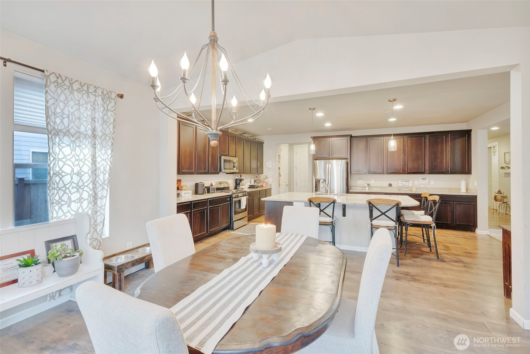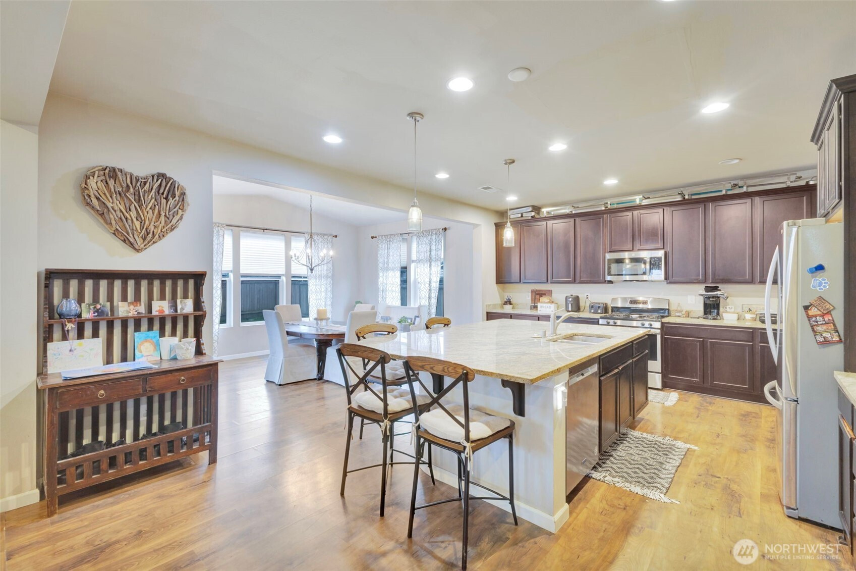 Welcome home to the charm and comfort of living in the heart of Orting, where small-town warmth meets beautiful Northwest scenery. Located in the desirable River’s Edge community, this spacious 4-bedroom plus office, 2.5-bath home offers 2,829 sq. ft. of thoughtfully designed living space. A welcoming covered front porch sets the tone as you step inside to soaring 9-ft ceilings, 8-ft doors, and a bright office with elegant French doors. The open-concept living area features a cozy gas fireplace and flows seamlessly into the stunning kitchen with granite countertops, abundant cabinetry, a gas range, and an oversized island with seating. The spacious sunroom-style dining area opens to the fully fenced backyard through sliding glass doors—perfect for entertaining or enjoying peaceful evenings. Upstairs you’ll find four generously sized bedrooms, including a large primary suite with soaking tub and separate shower, plus a versatile bonus room. Complete with a two-car garage, this home offers comfort, space, and the welcoming lifestyle Orting is known for.